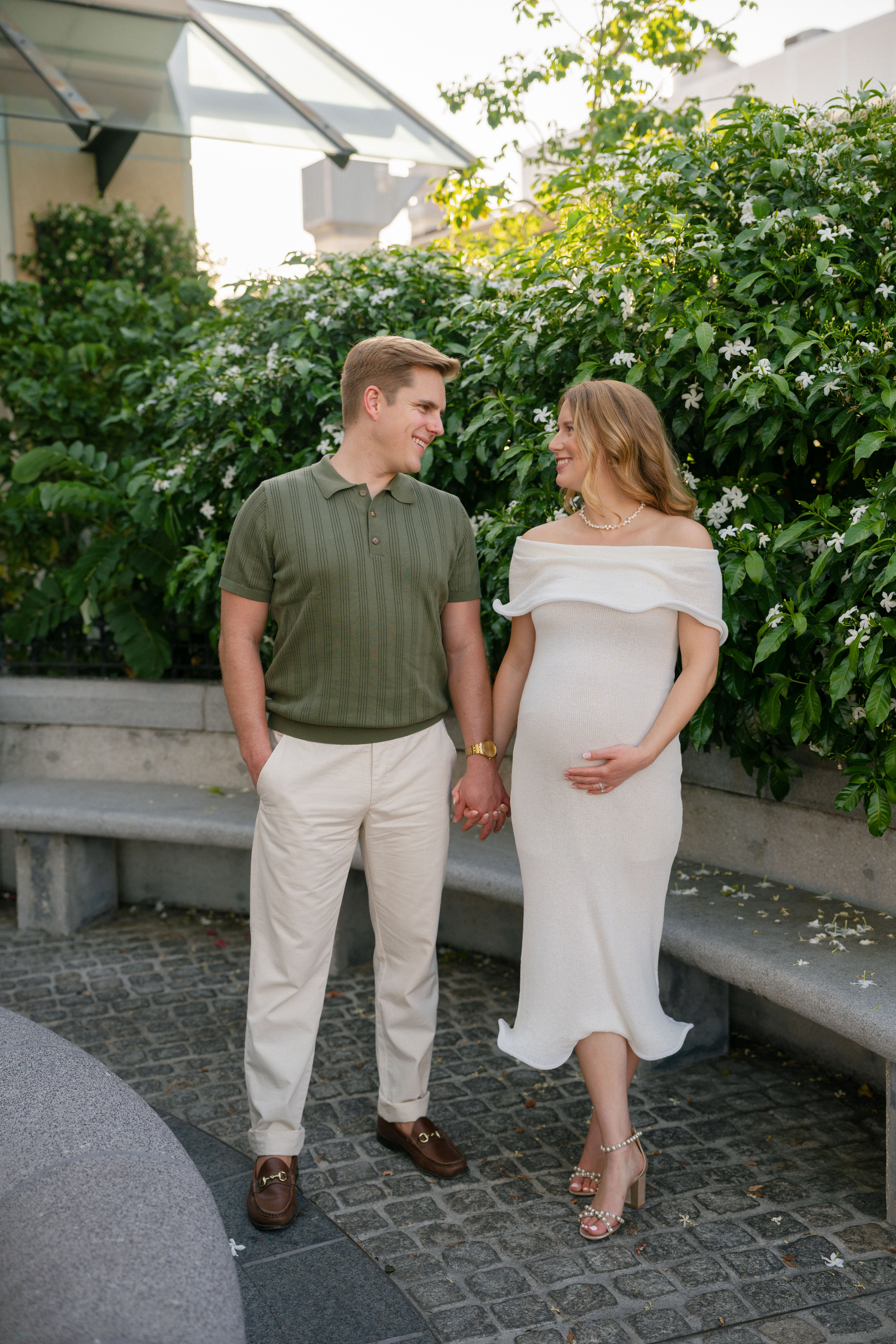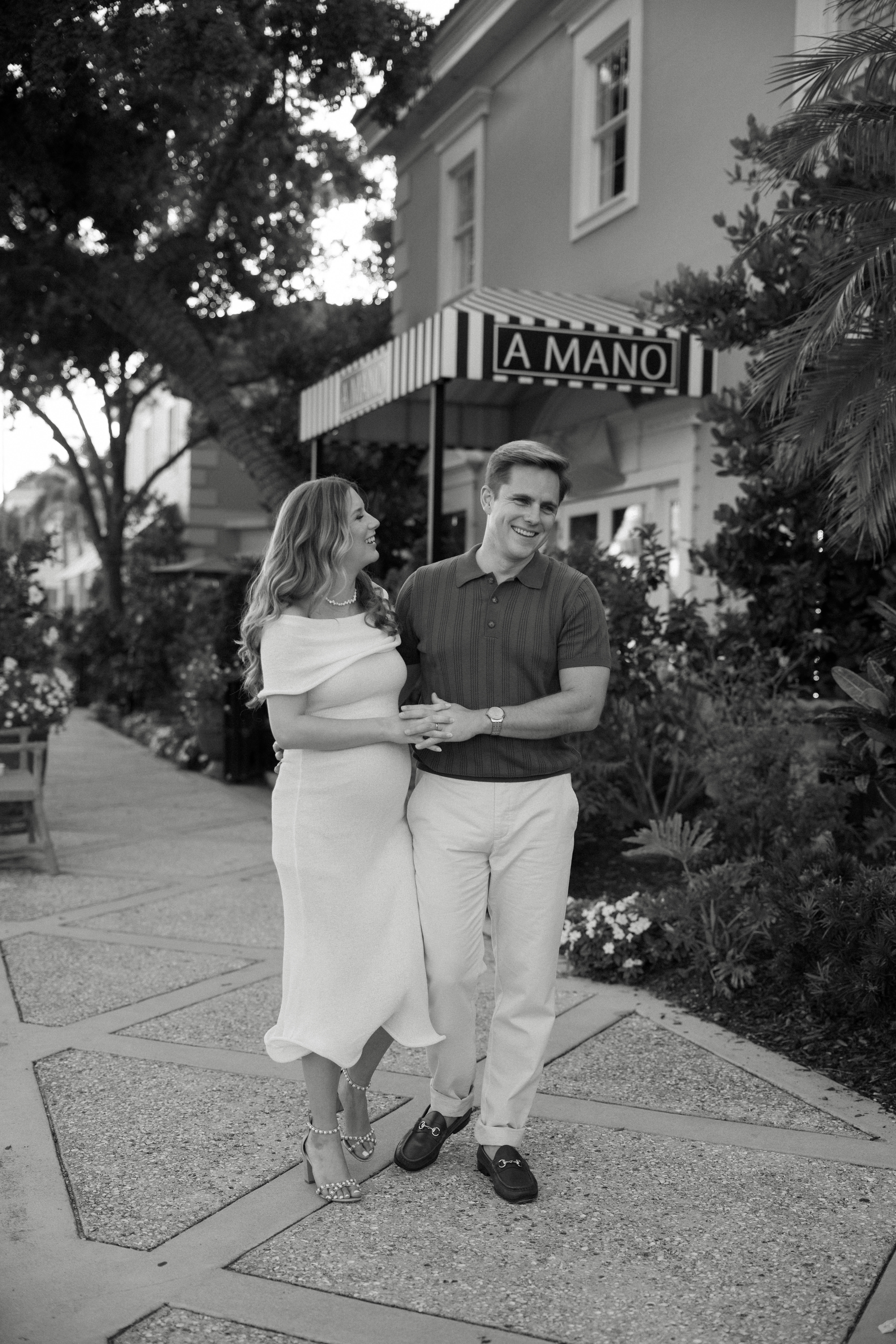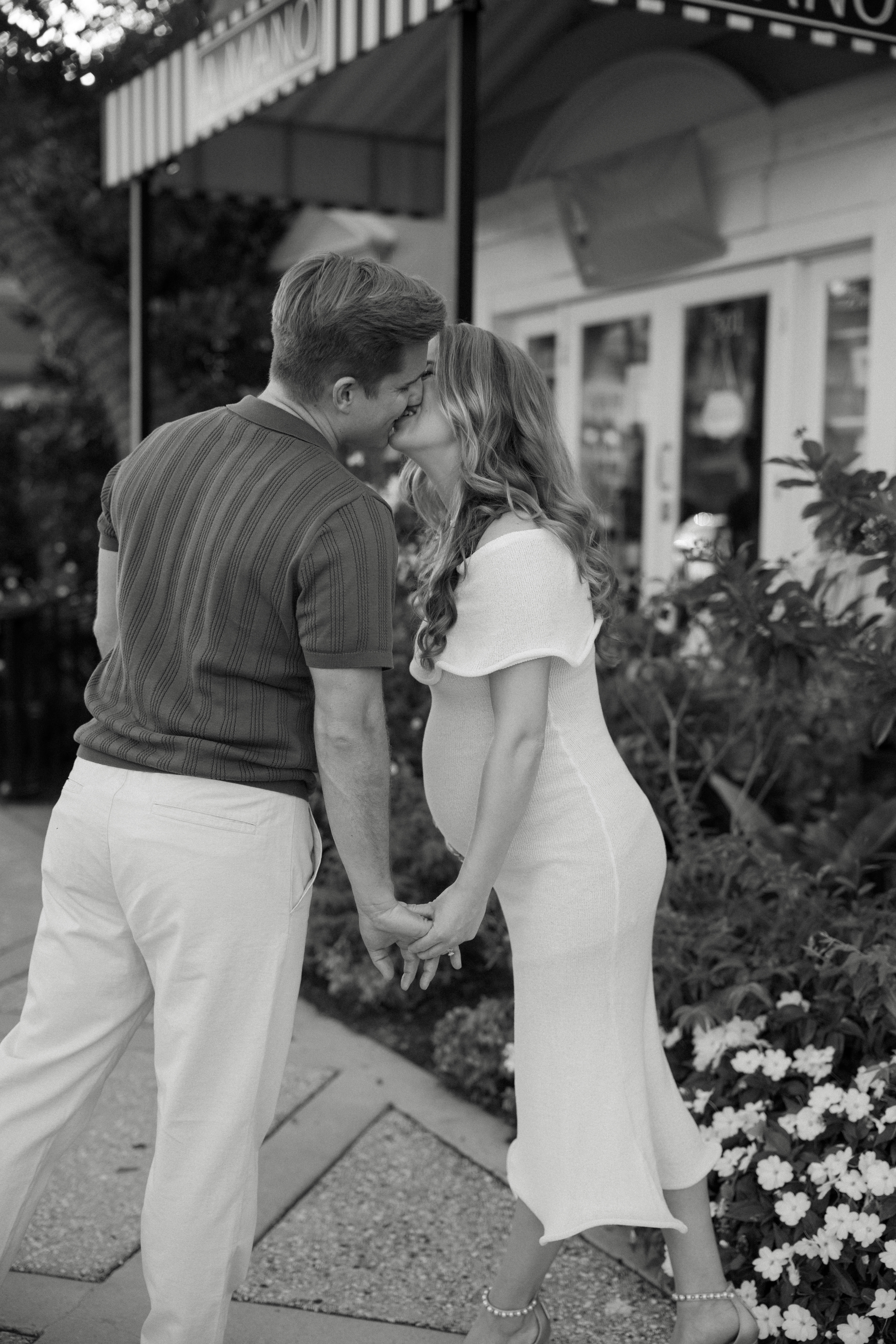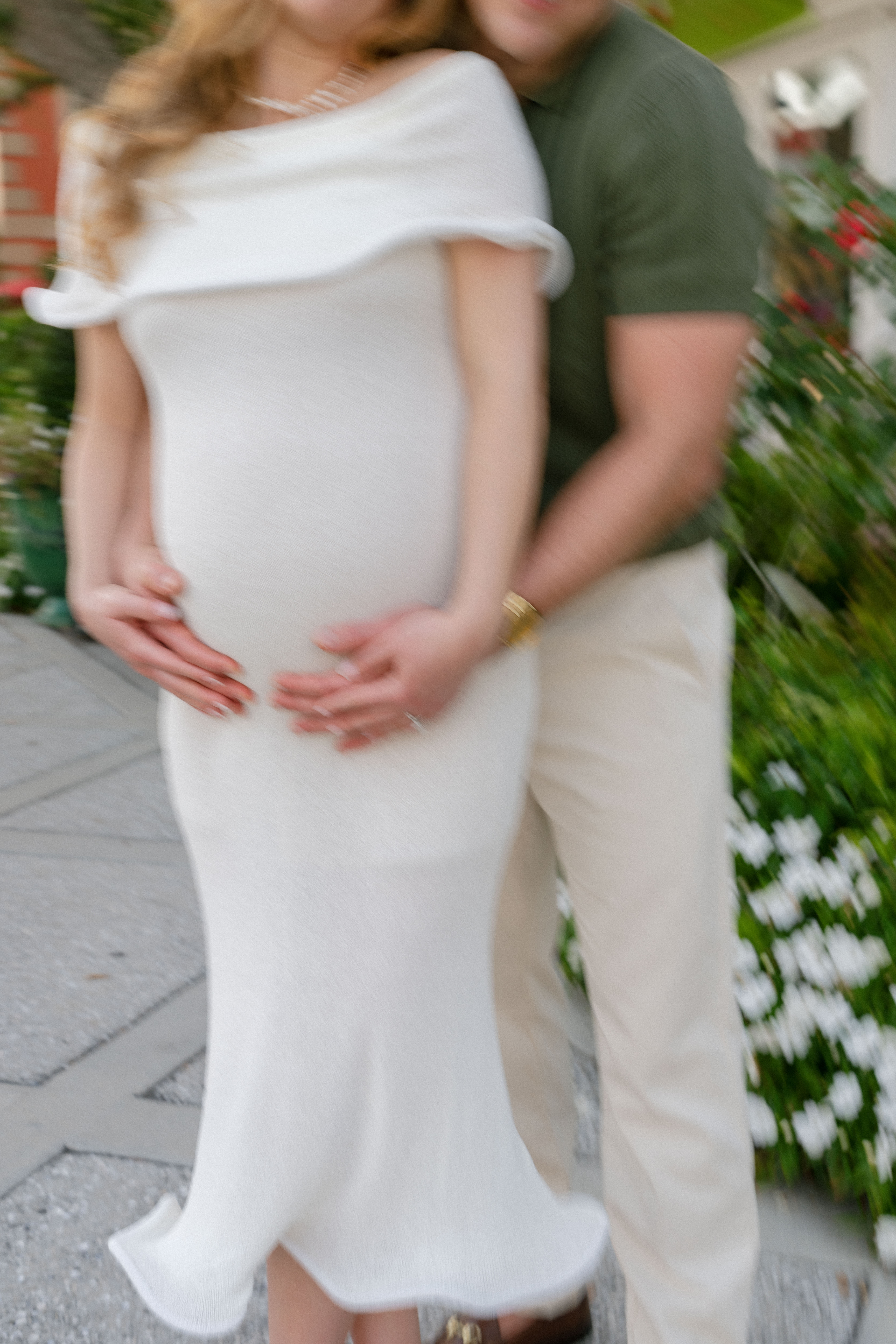 Hunter Ryan Photo captured a beautiful Florida maternity session as their couple prepared to welcome a little one into the world. Their session started on dry land as they strolled the downtown streets, hand in hand. The mother-to-be chose a fitted white off-the-shoulder dress, while her partner chose a dark green polo and light khaki pants. These photos helped pause time, for just a moment, capturing portraits while it’s still just the two of them.