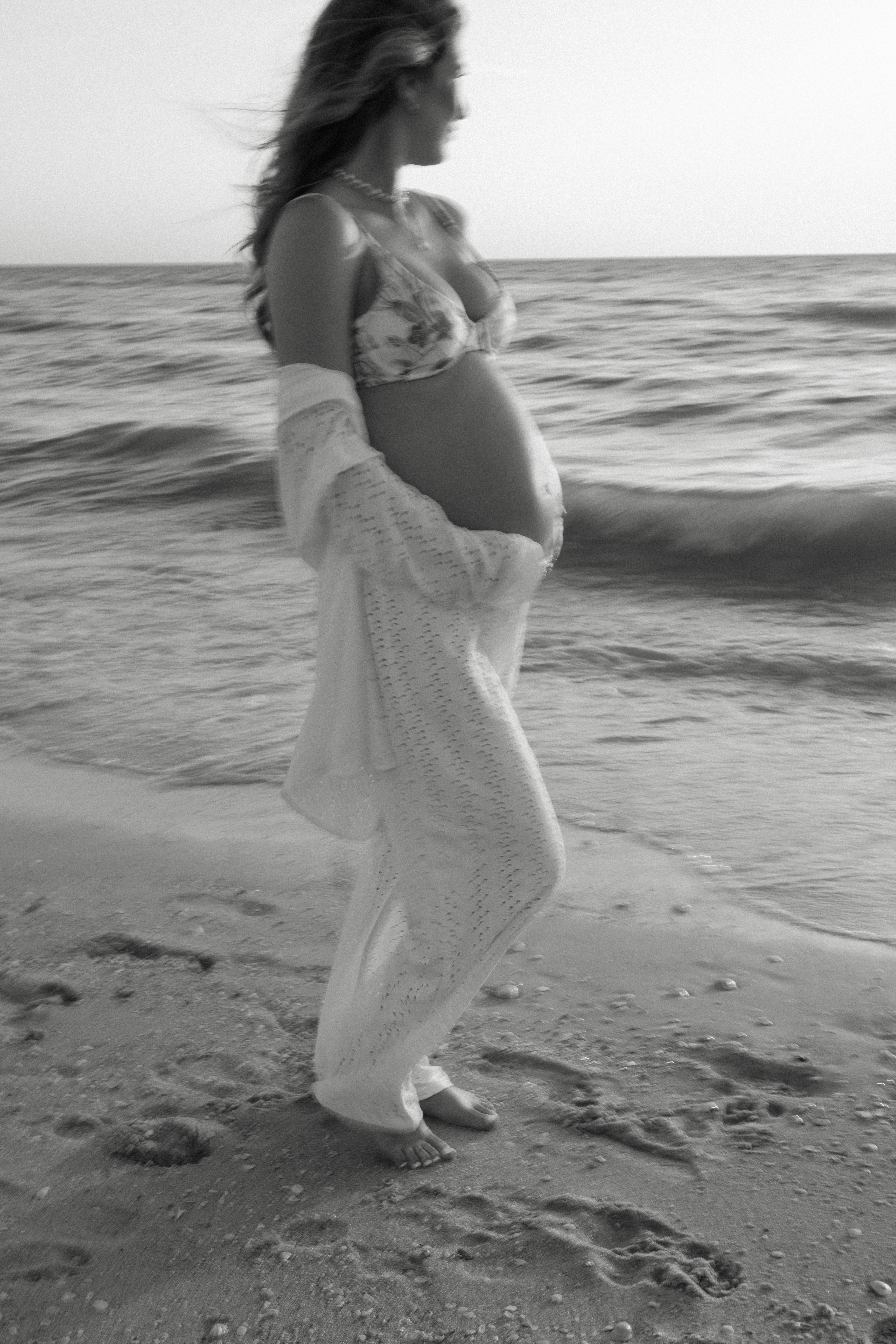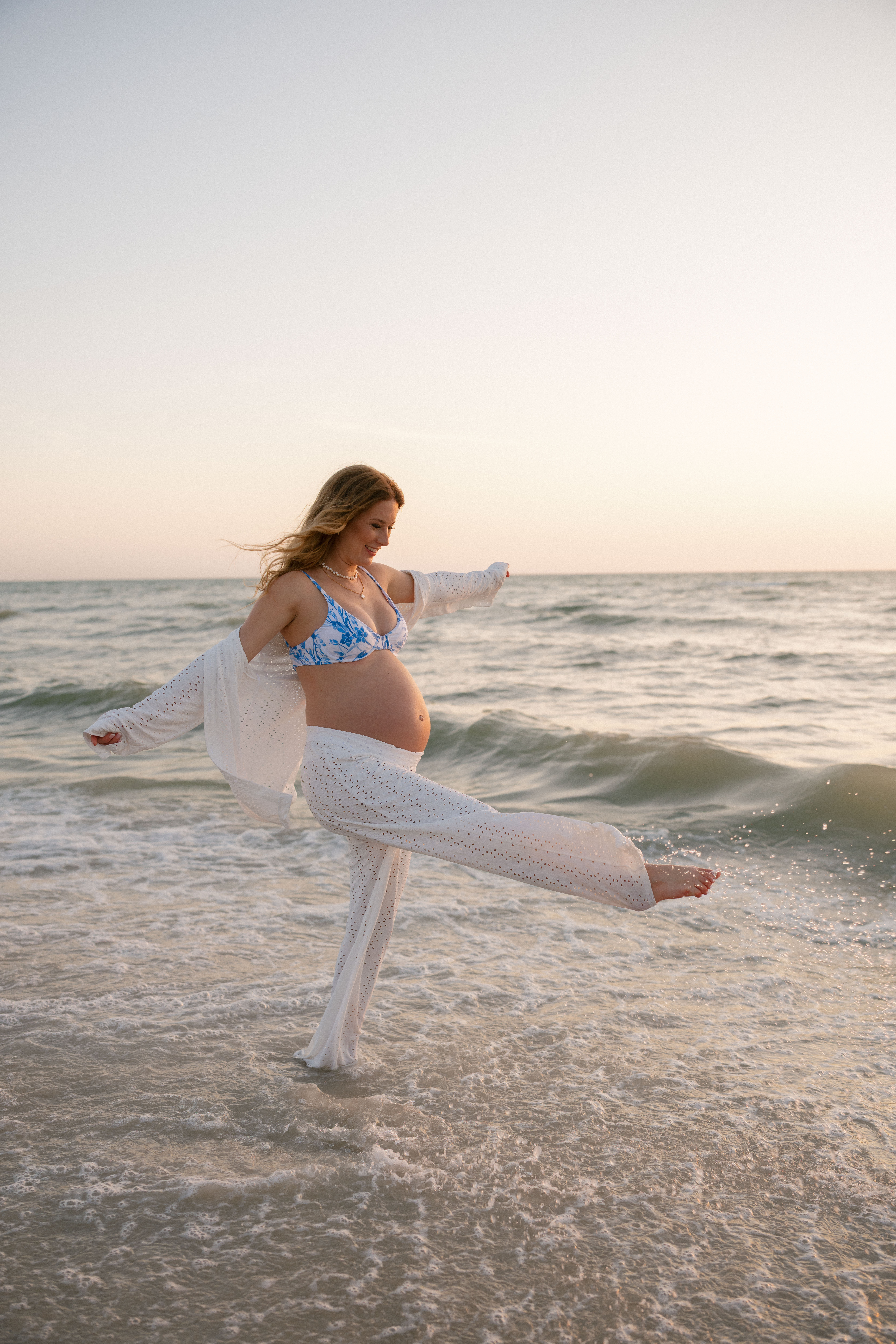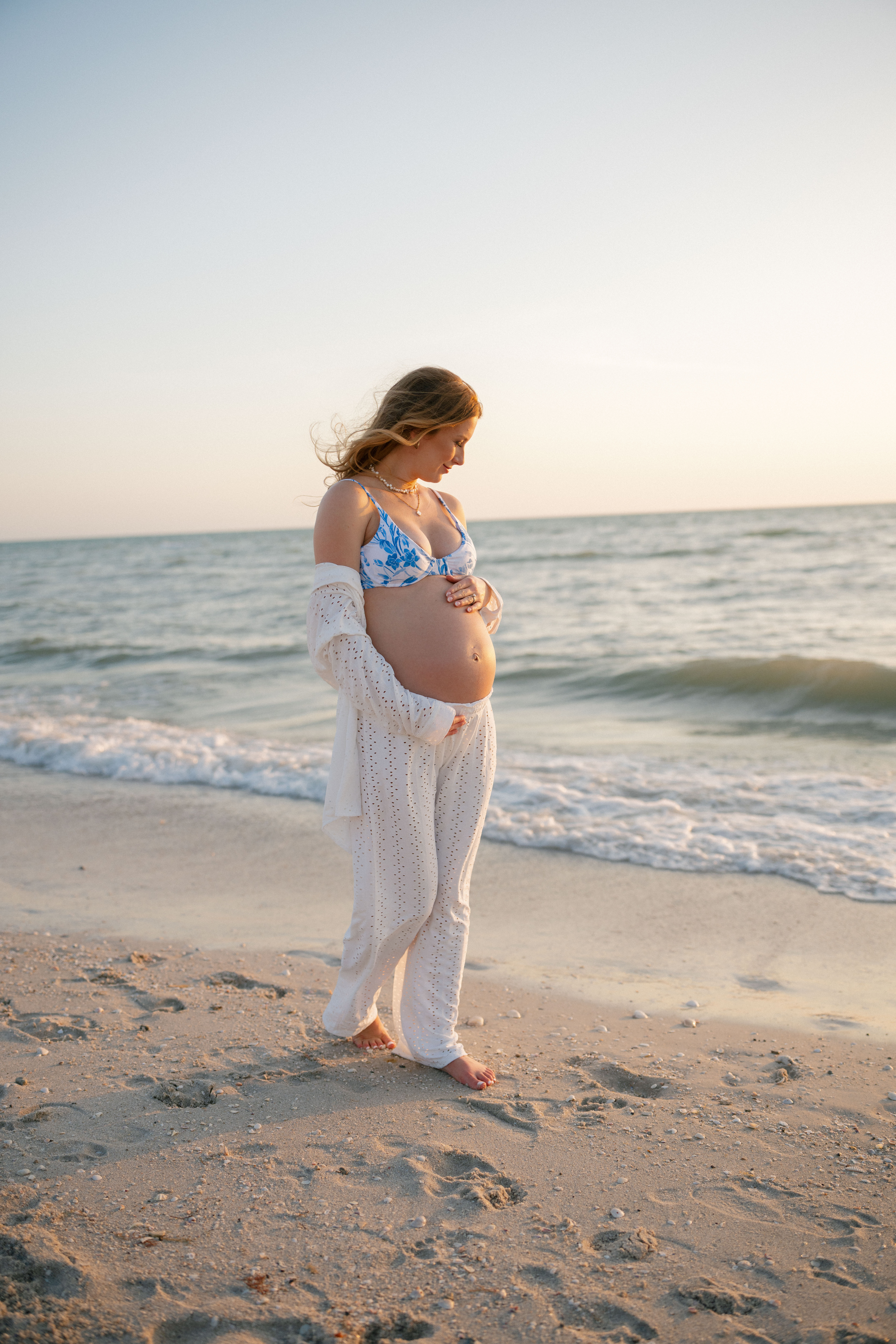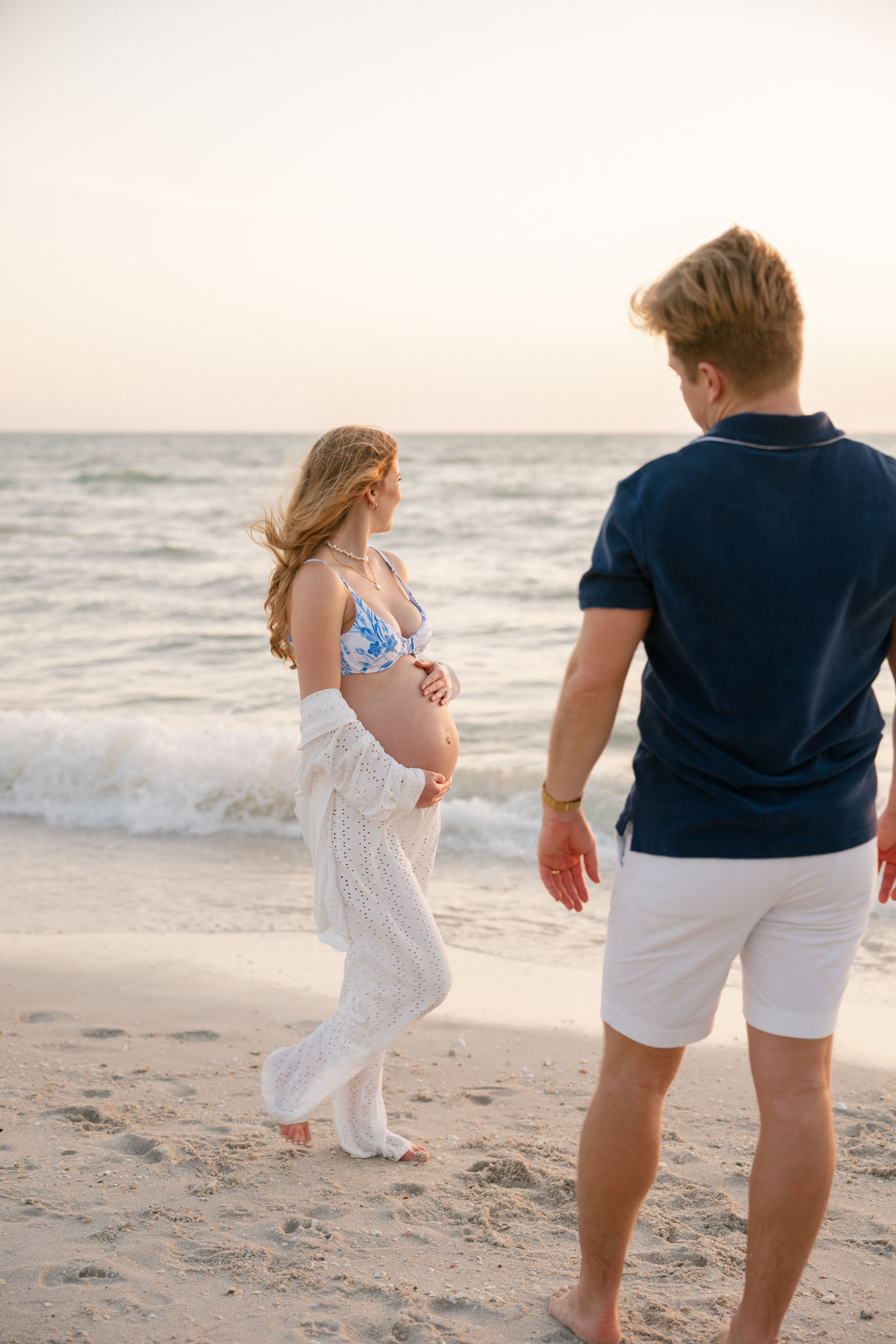 From there the session moved to the beach, in true Florida fashion, for more portraits on the water. Their second outfits consisted of a navy polo and light khaki shorts and a blue and white bikini top accompanied by a white matching set. They splashed in the water and posed as the sun began to set into the water creating a stunning backdrop for golden hour photos. This Florida maternity session will provide photos they can look back on for years to come. It is the most special task to be entrusted with capturing such a special season in a couples’ life.