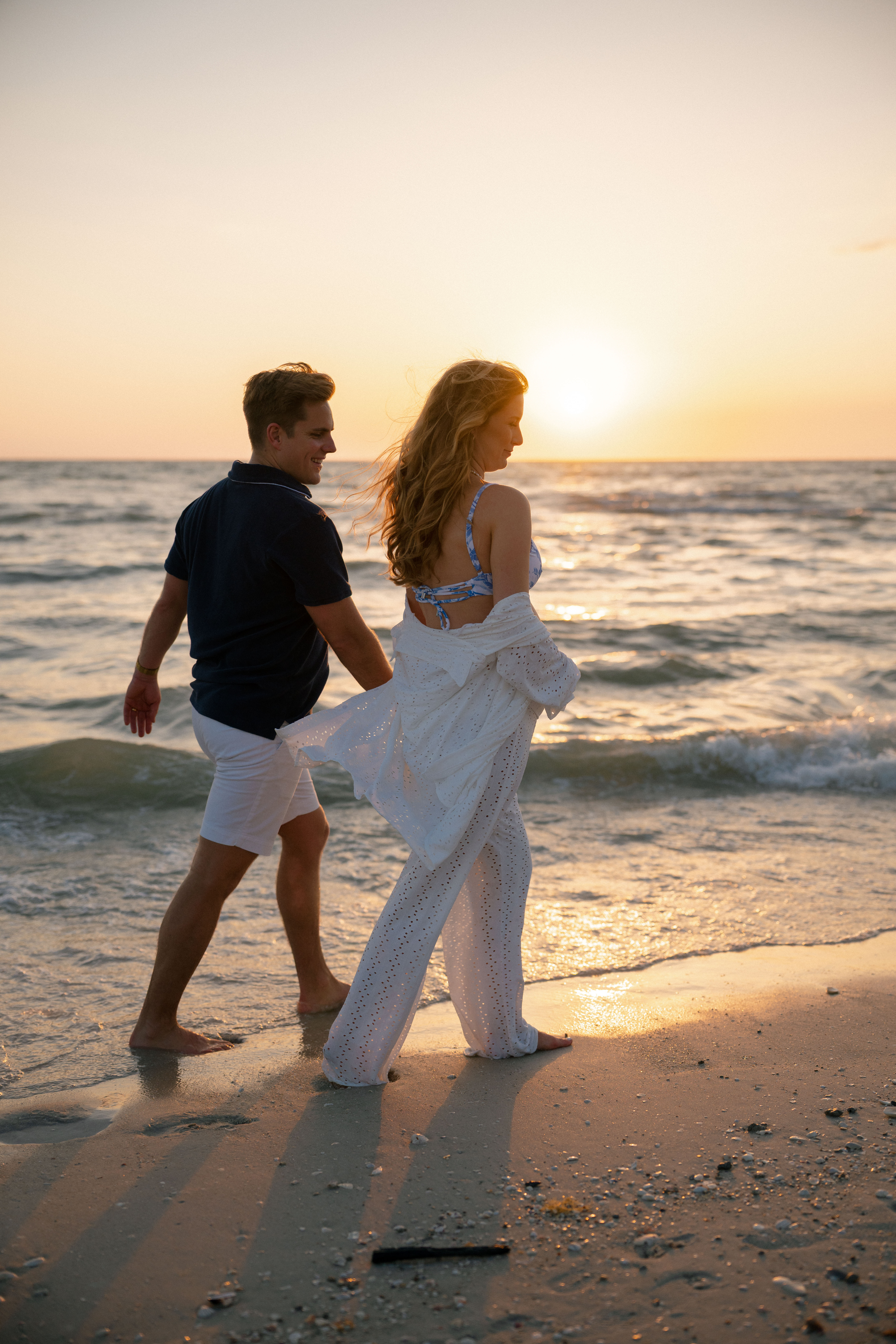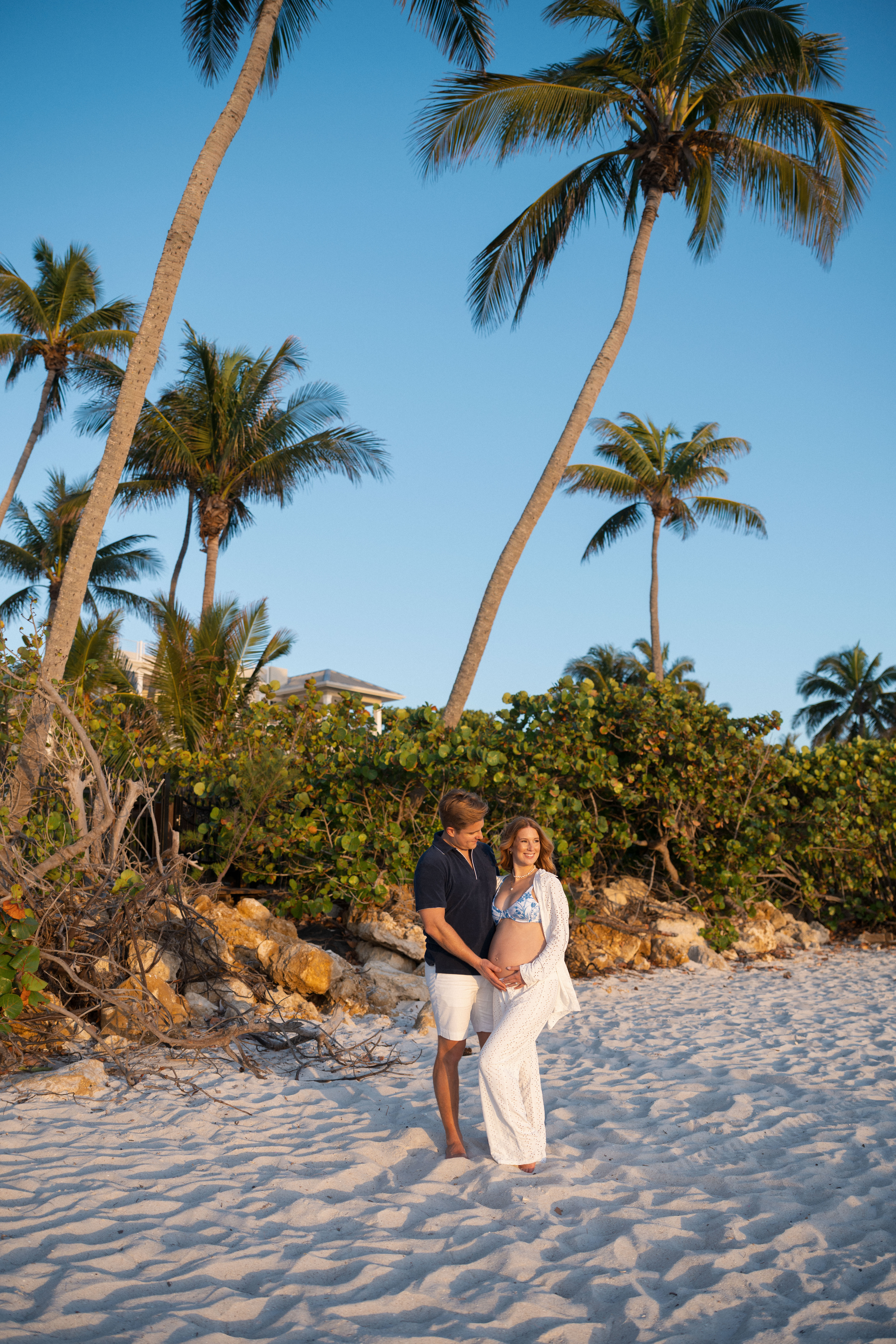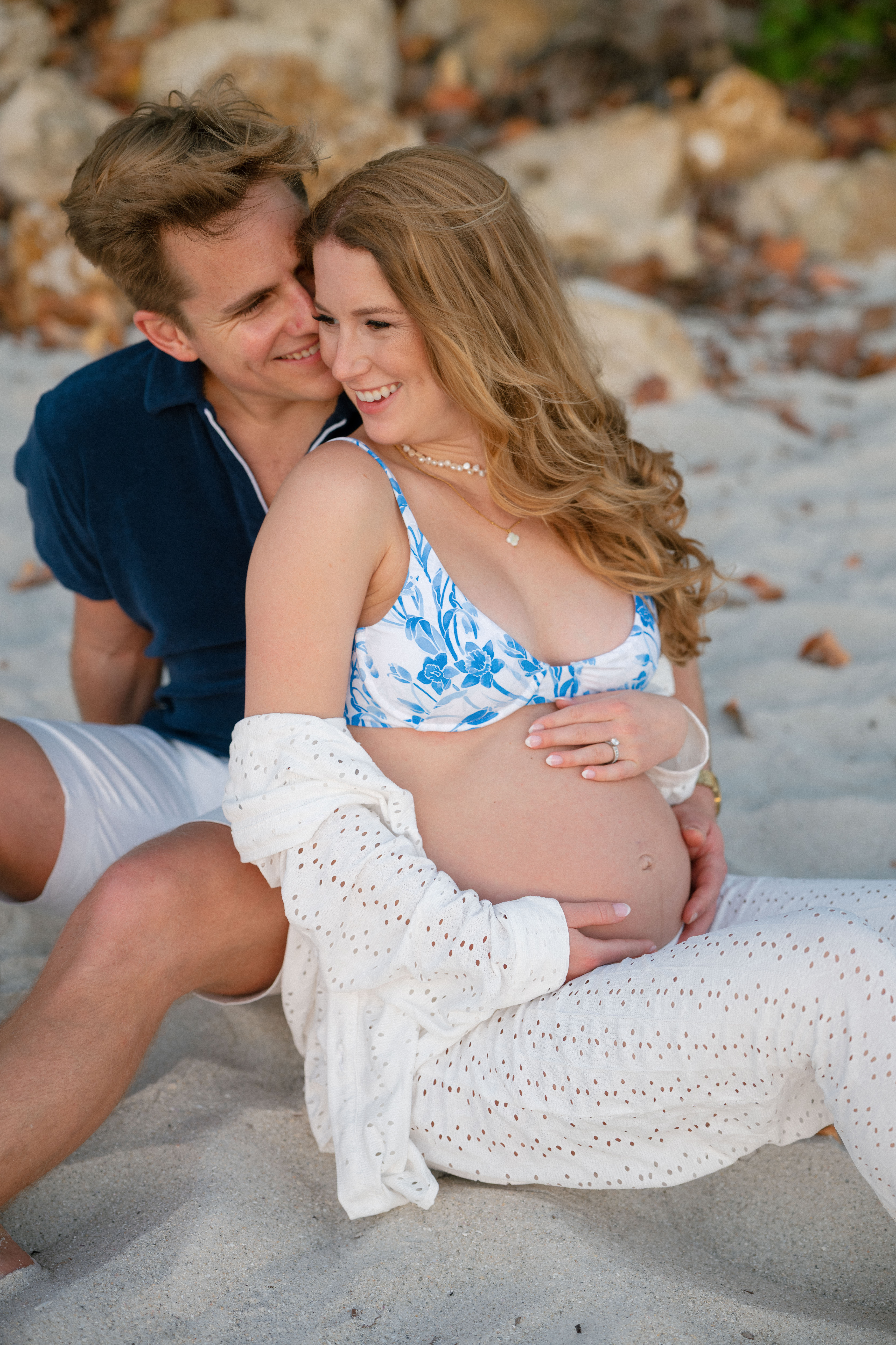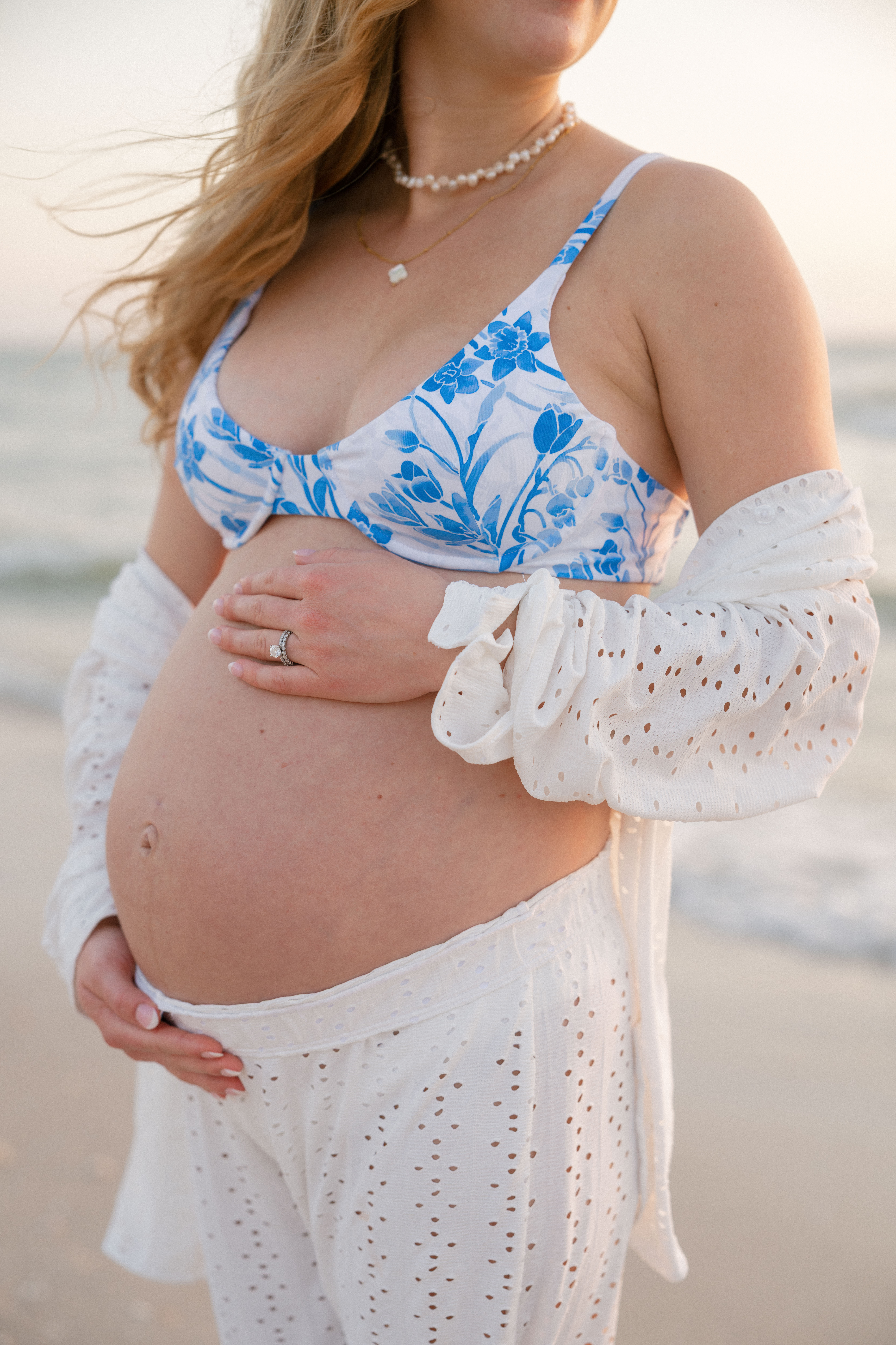 From there the session moved to the beach, in true Florida fashion, for more portraits on the water. Their second outfits consisted of a navy polo and light khaki shorts and a blue and white bikini top accompanied by a white matching set. They splashed in the water and posed as the sun began to set into the water creating a stunning backdrop for golden hour photos. This Florida maternity session will provide photos they can look back on for years to come. It is the most special task to be entrusted with capturing such a special season in a couples’ life.