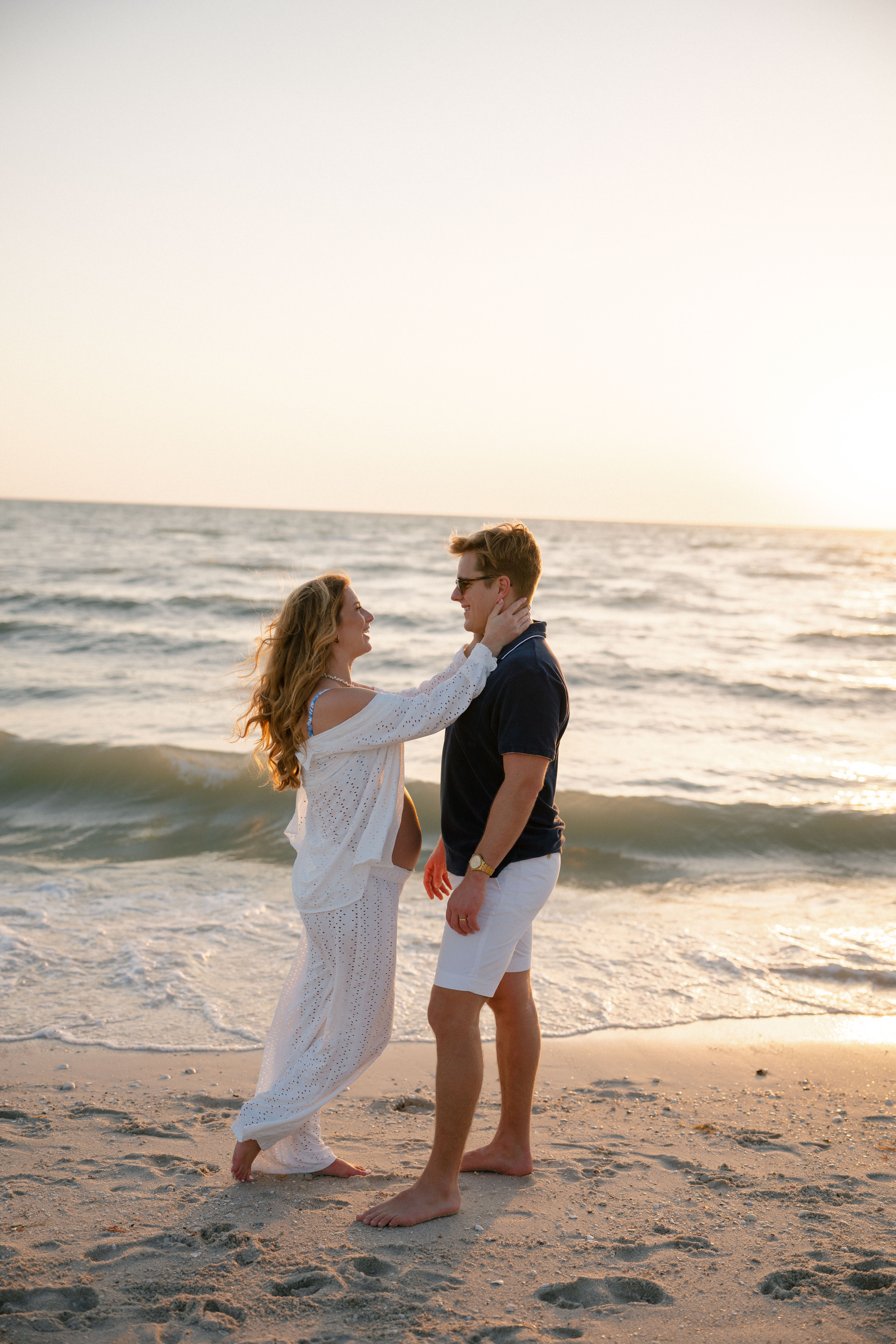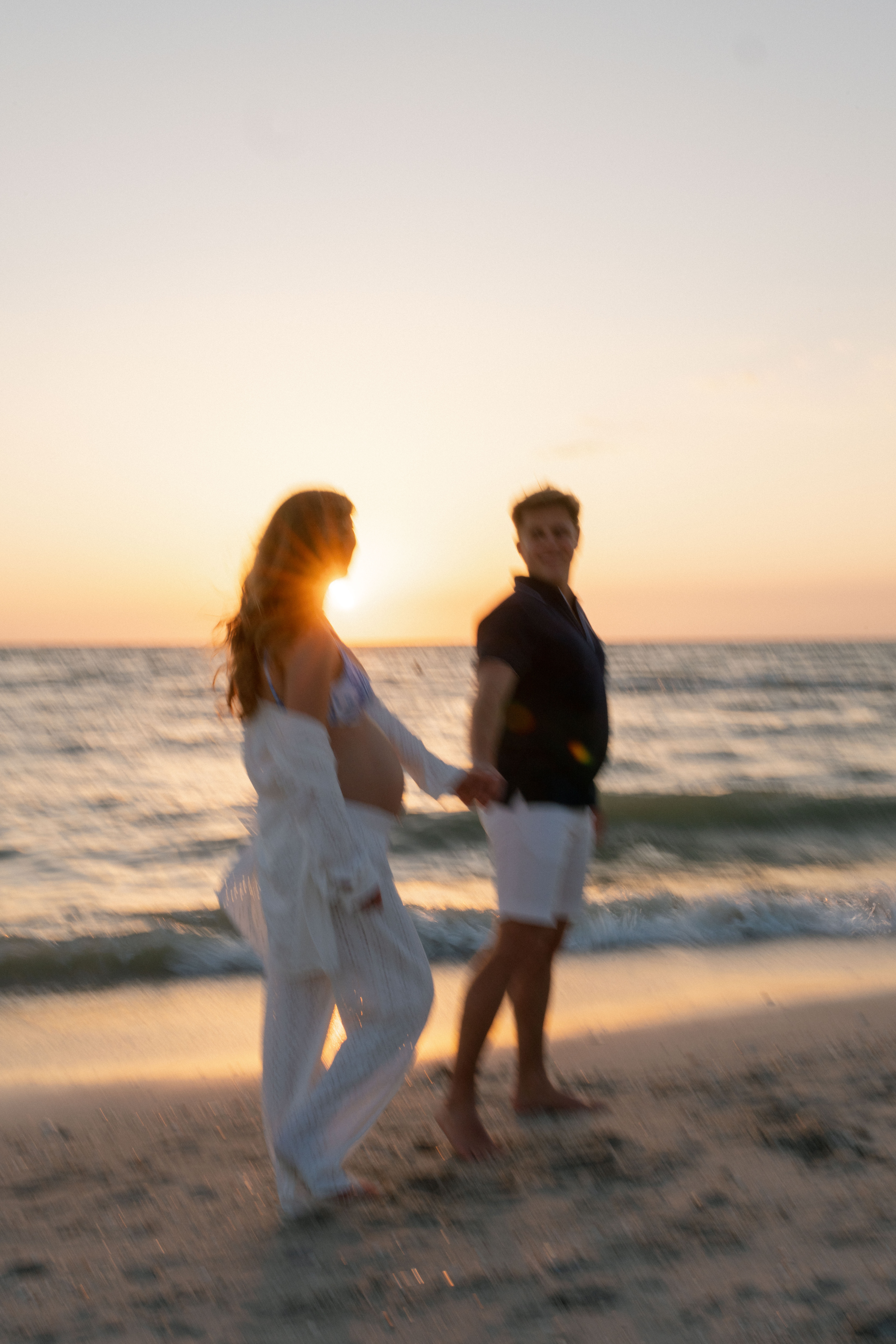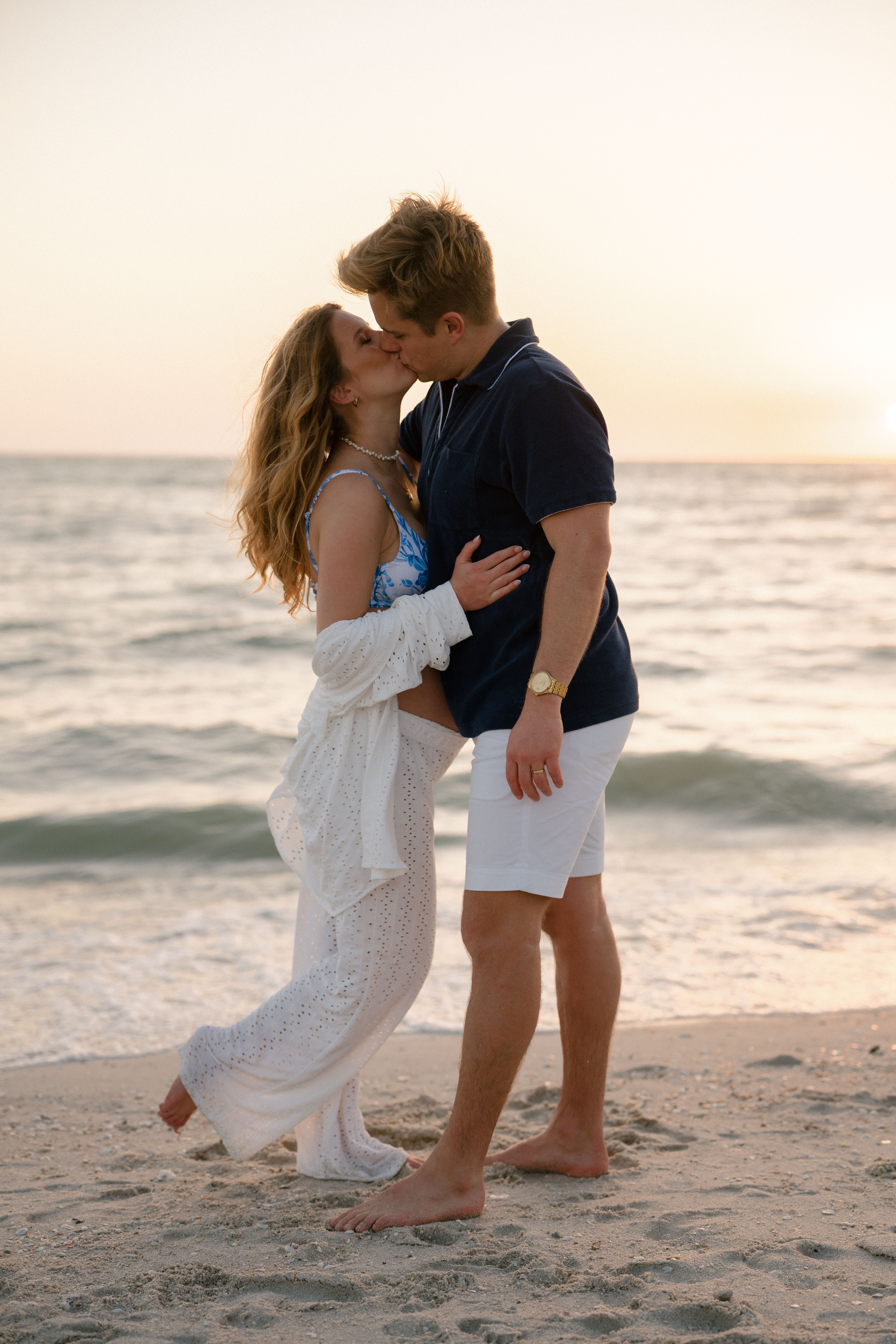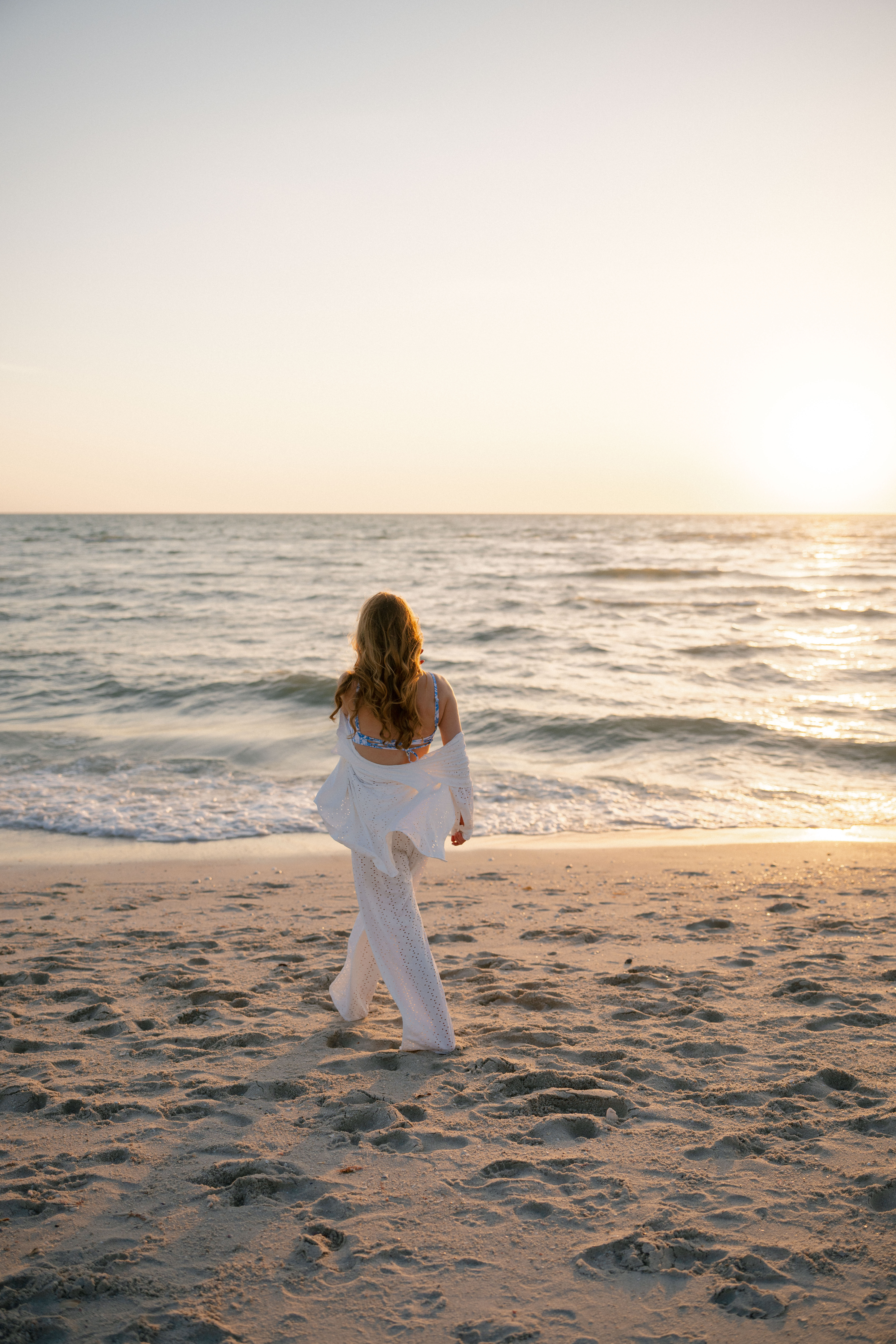From there the session moved to the beach, in true Florida fashion, for more portraits on the water. Their second outfits consisted of a navy polo and light khaki shorts and a blue and white bikini top accompanied by a white matching set. They splashed in the water and posed as the sun began to set into the water creating a stunning backdrop for golden hour photos. This Florida maternity session will provide photos they can look back on for years to come. It is the most special task to be entrusted with capturing such a special season in a couples’ life.