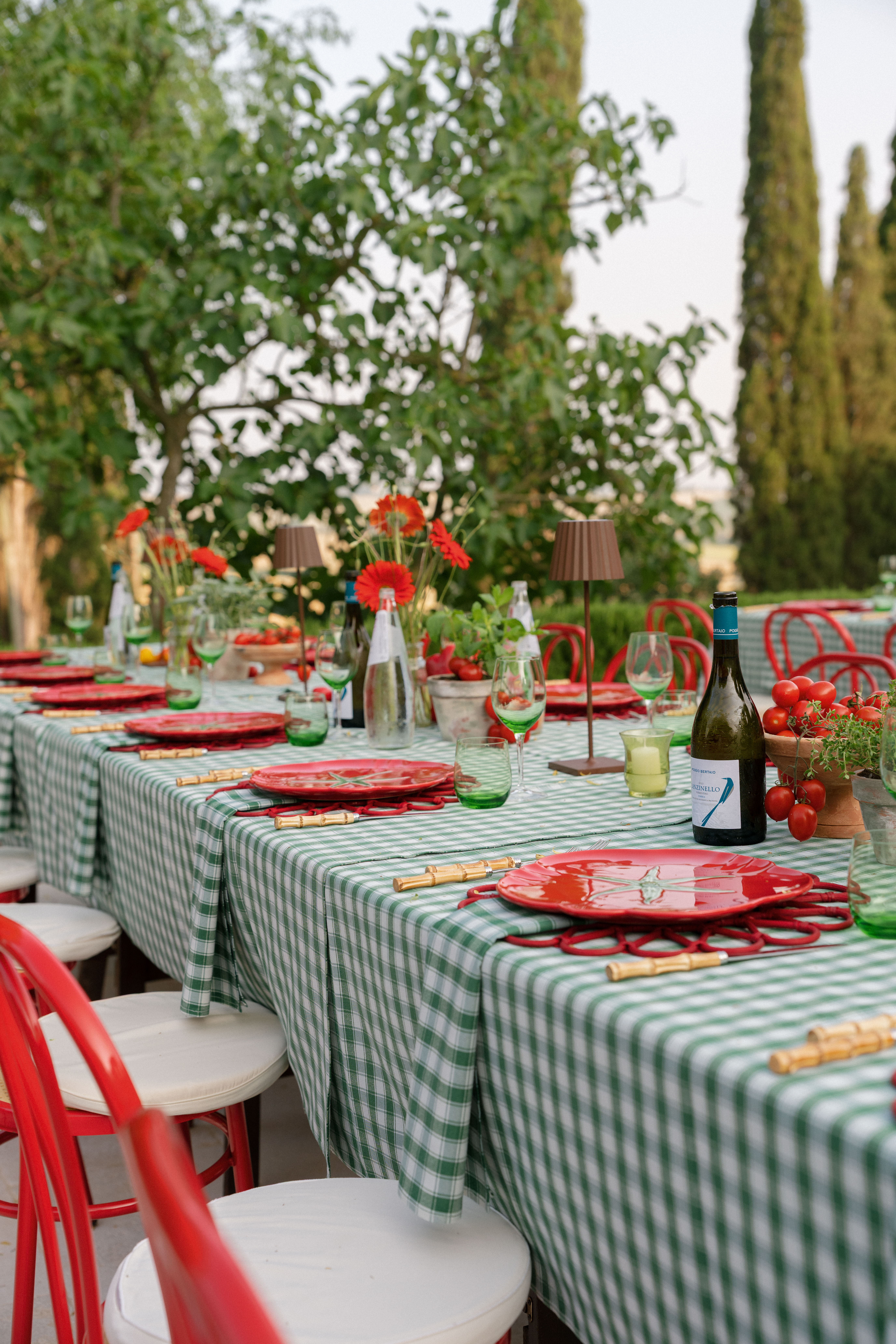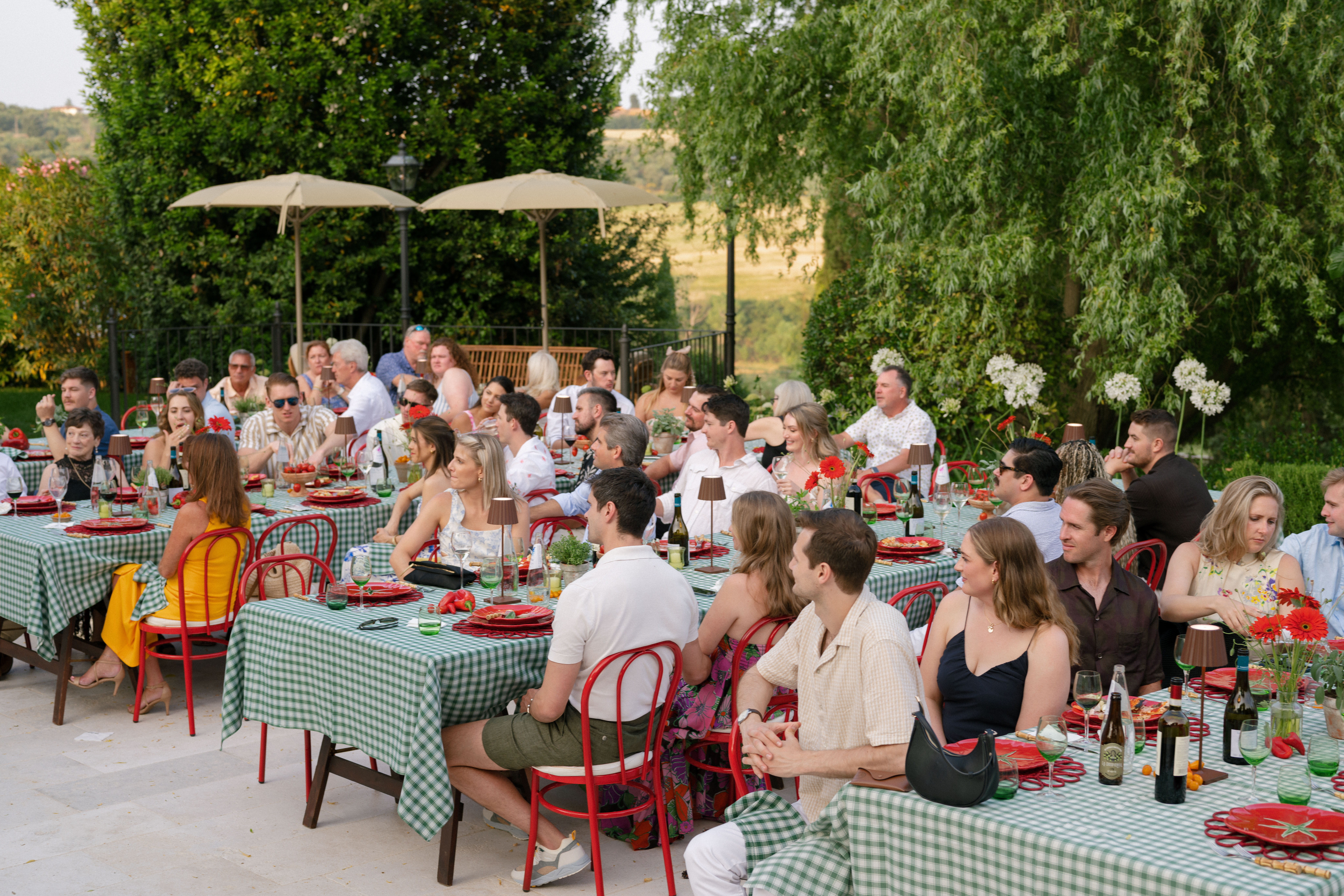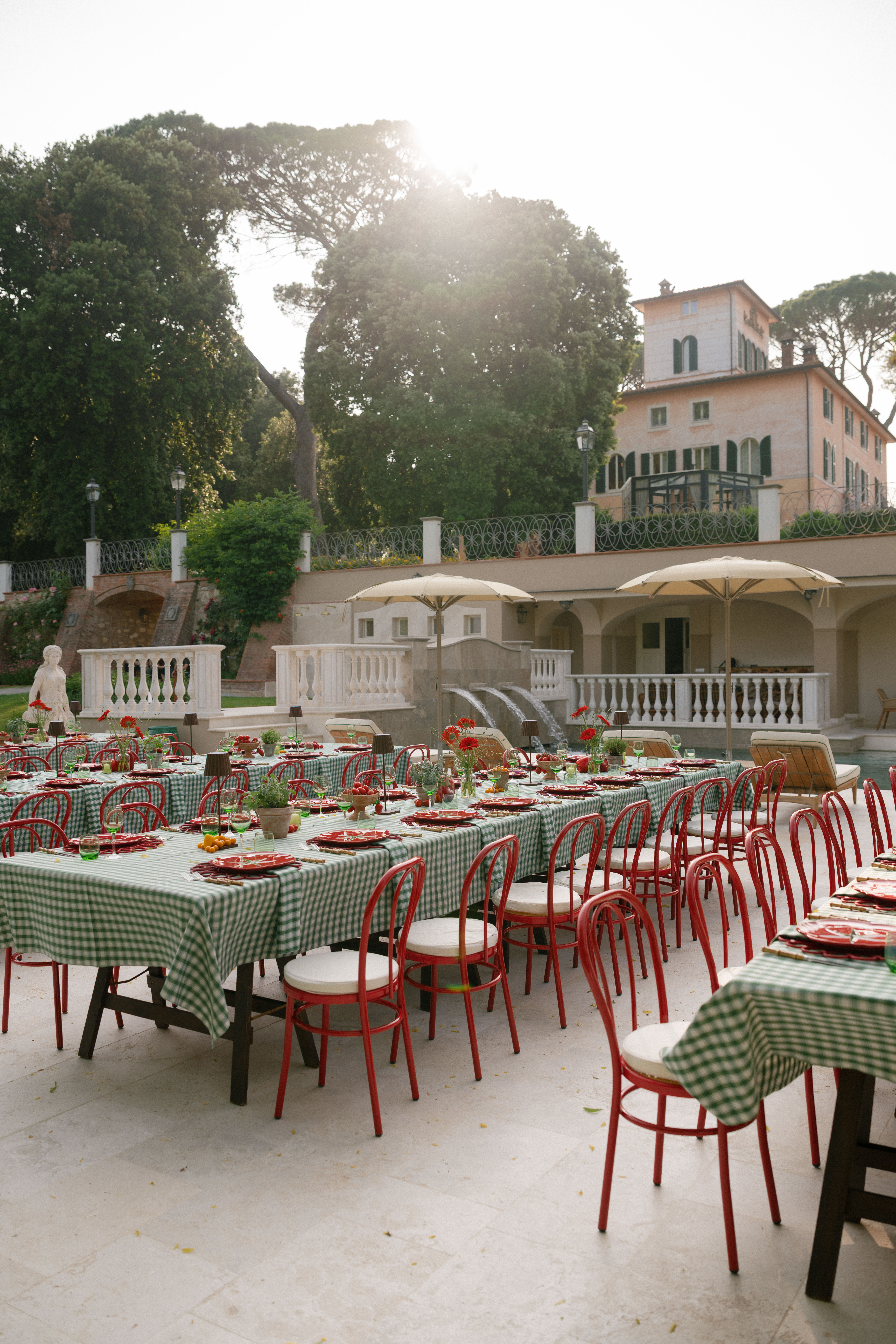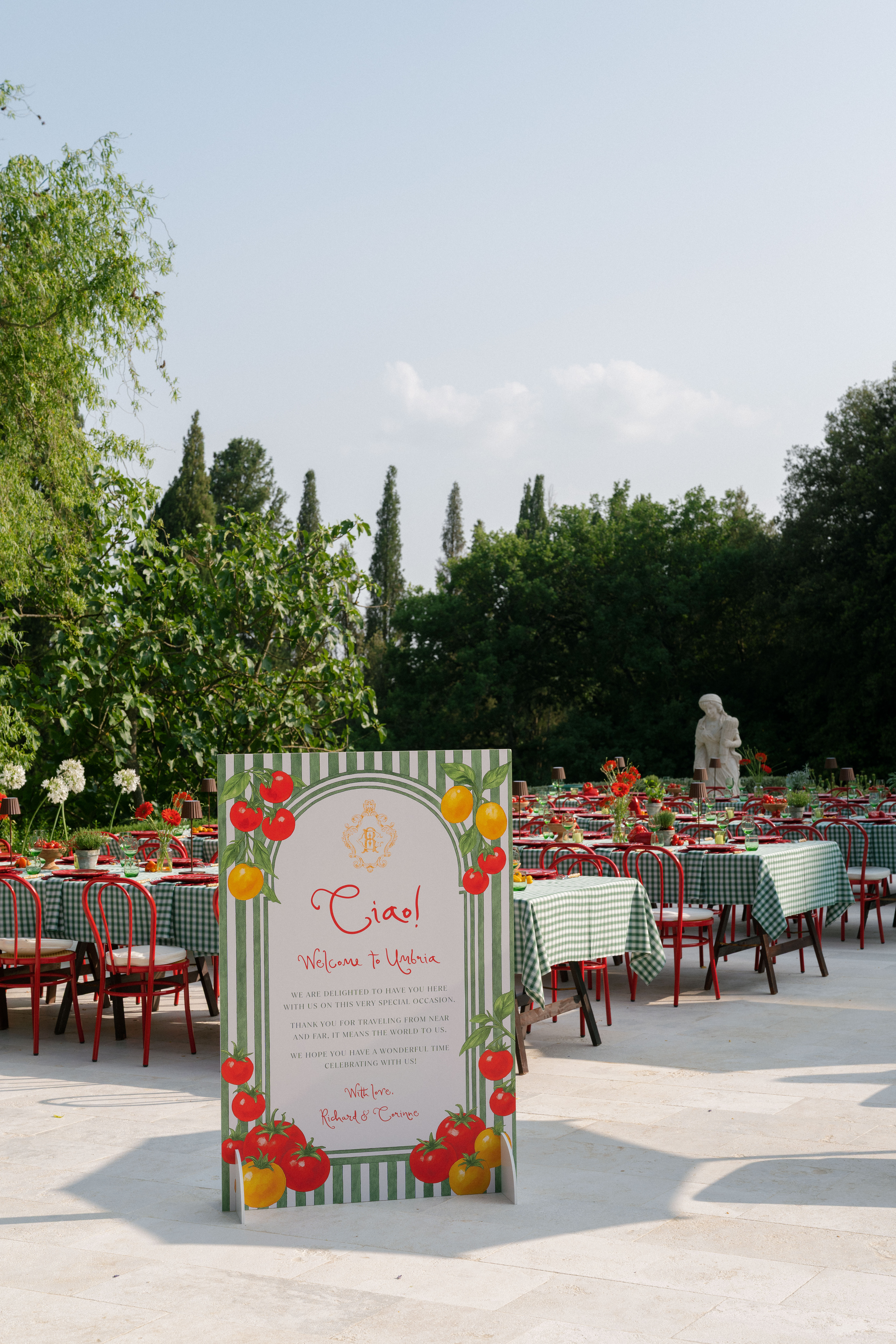 Key details and design elements that wowed guests included on-site oven-cooked pizzas, green gingham table linens, matching red chairs and plates, and juicy tomatoes scattering the tables. This was truly the perfect start to a weekend of celebrating in the Italian countryside!