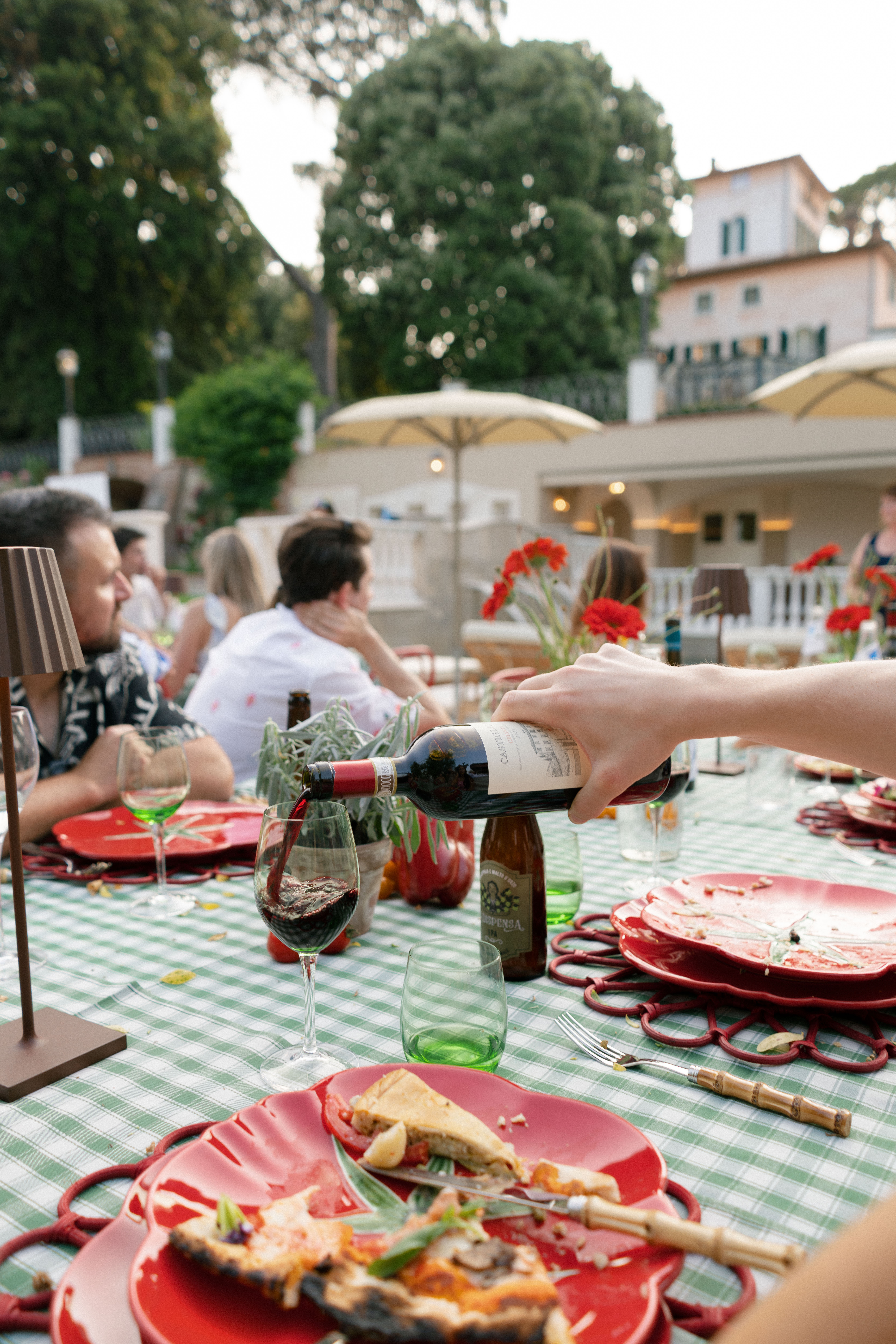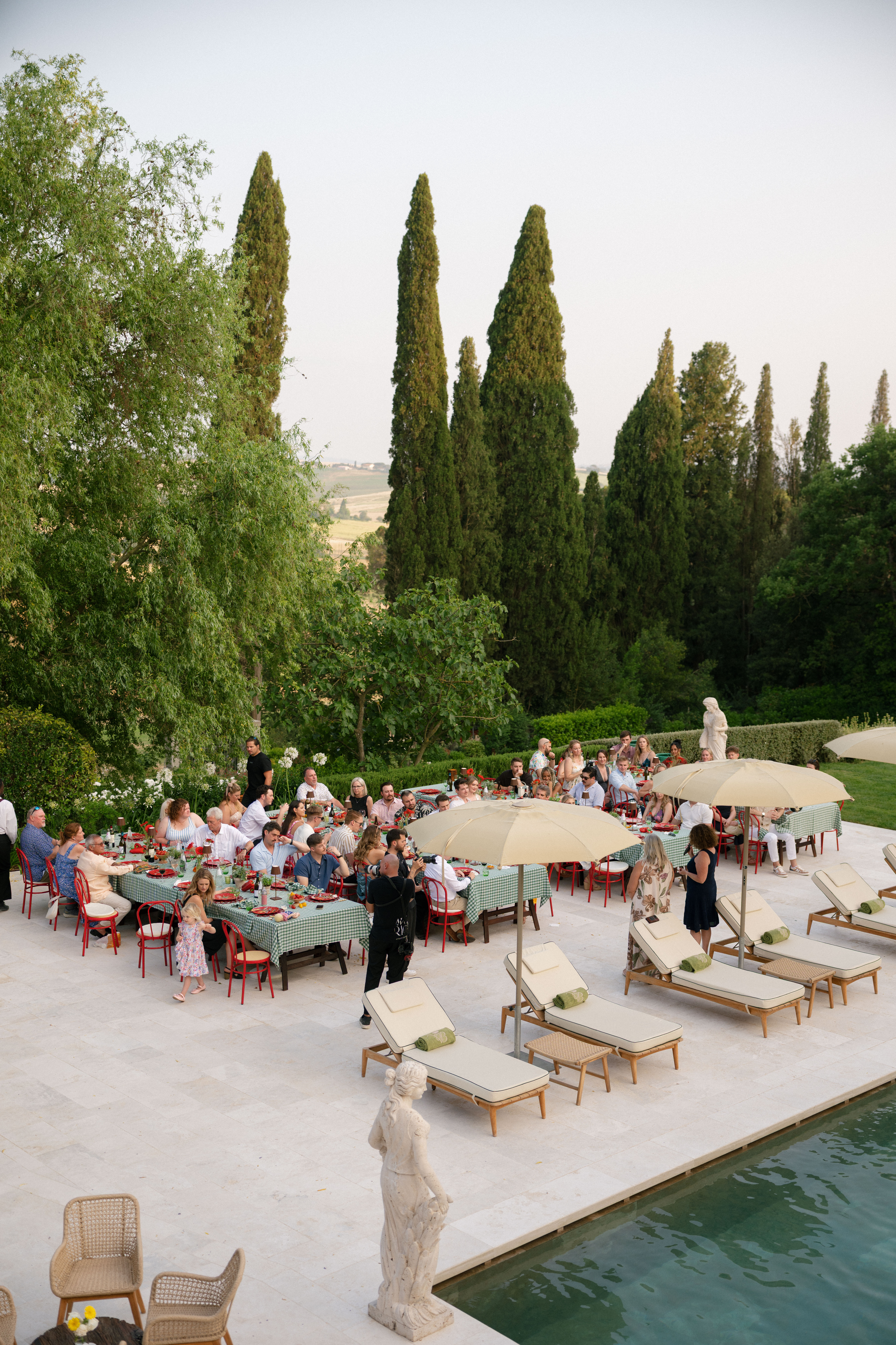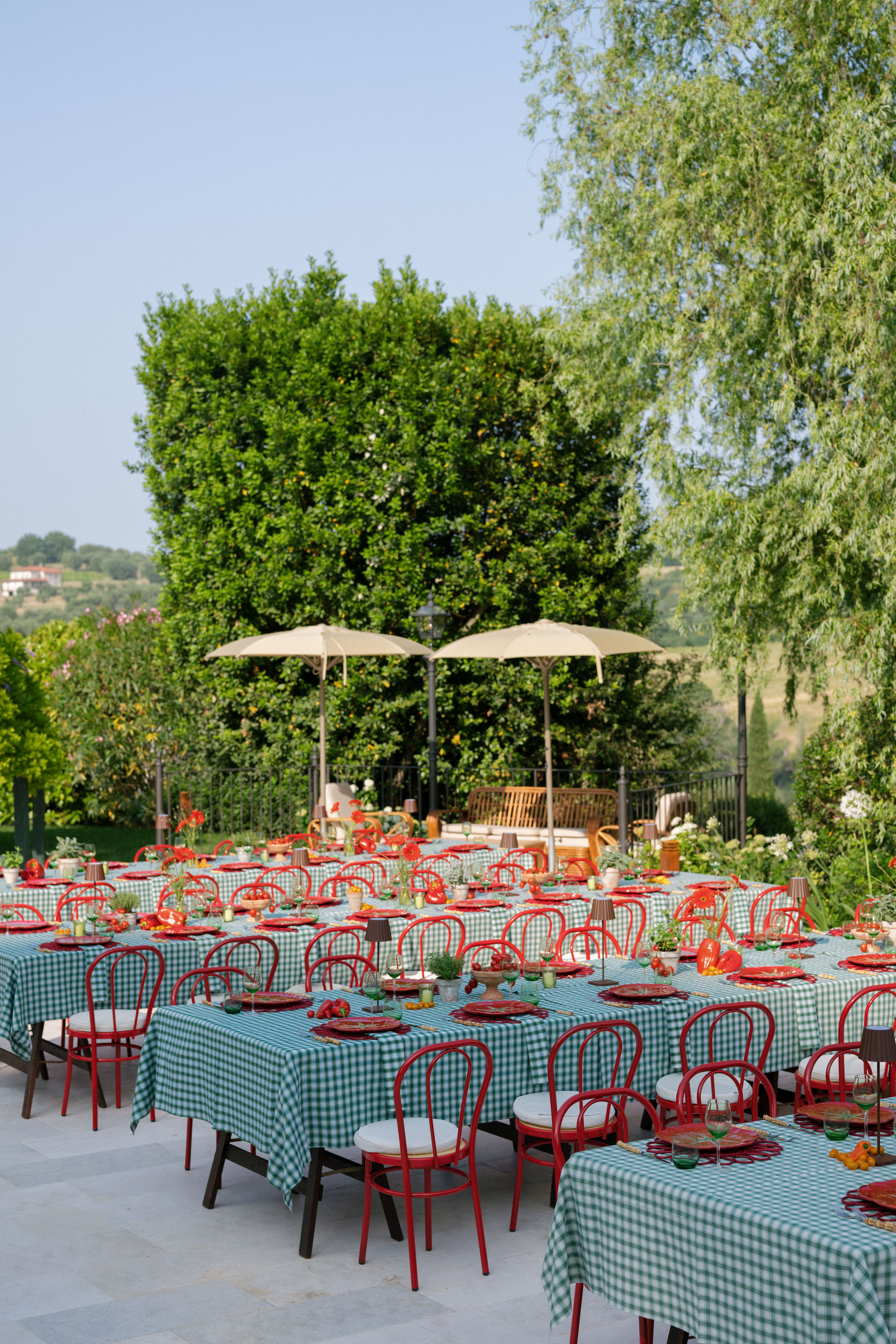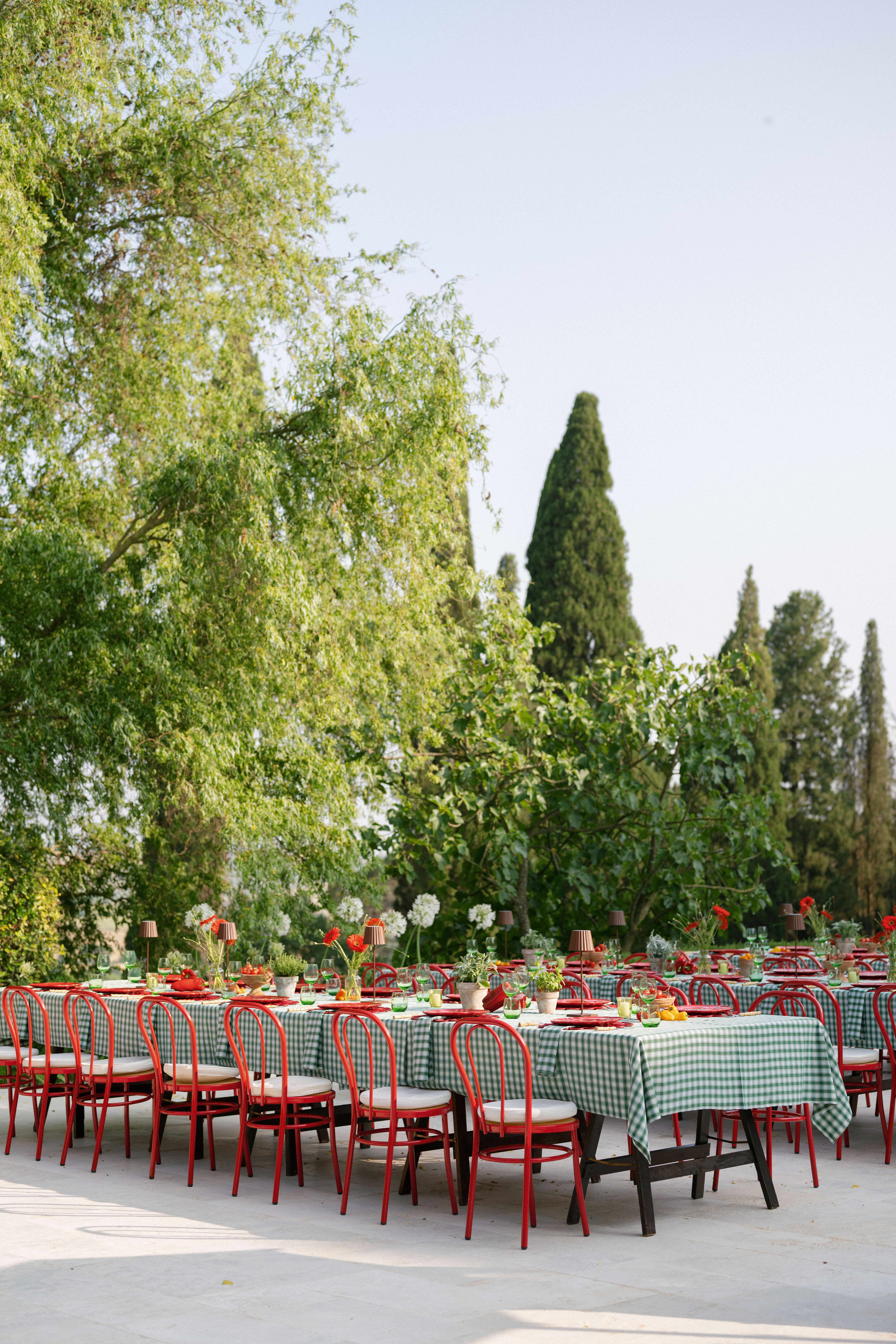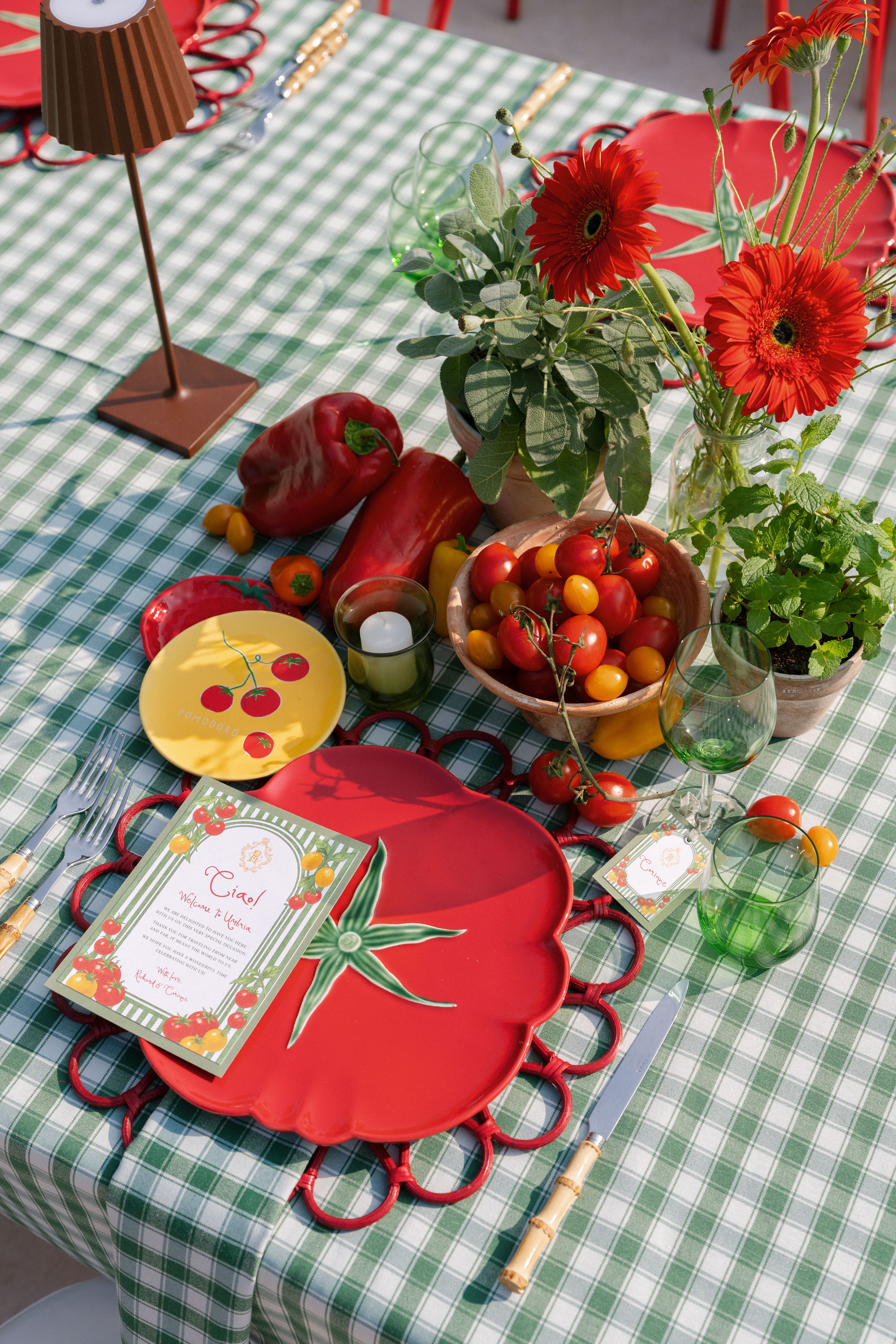 Key details and design elements that wowed guests included on-site oven-cooked pizzas, green gingham table linens, matching red chairs and plates, and juicy tomatoes scattering the tables. This was truly the perfect start to a weekend of celebrating in the Italian countryside!