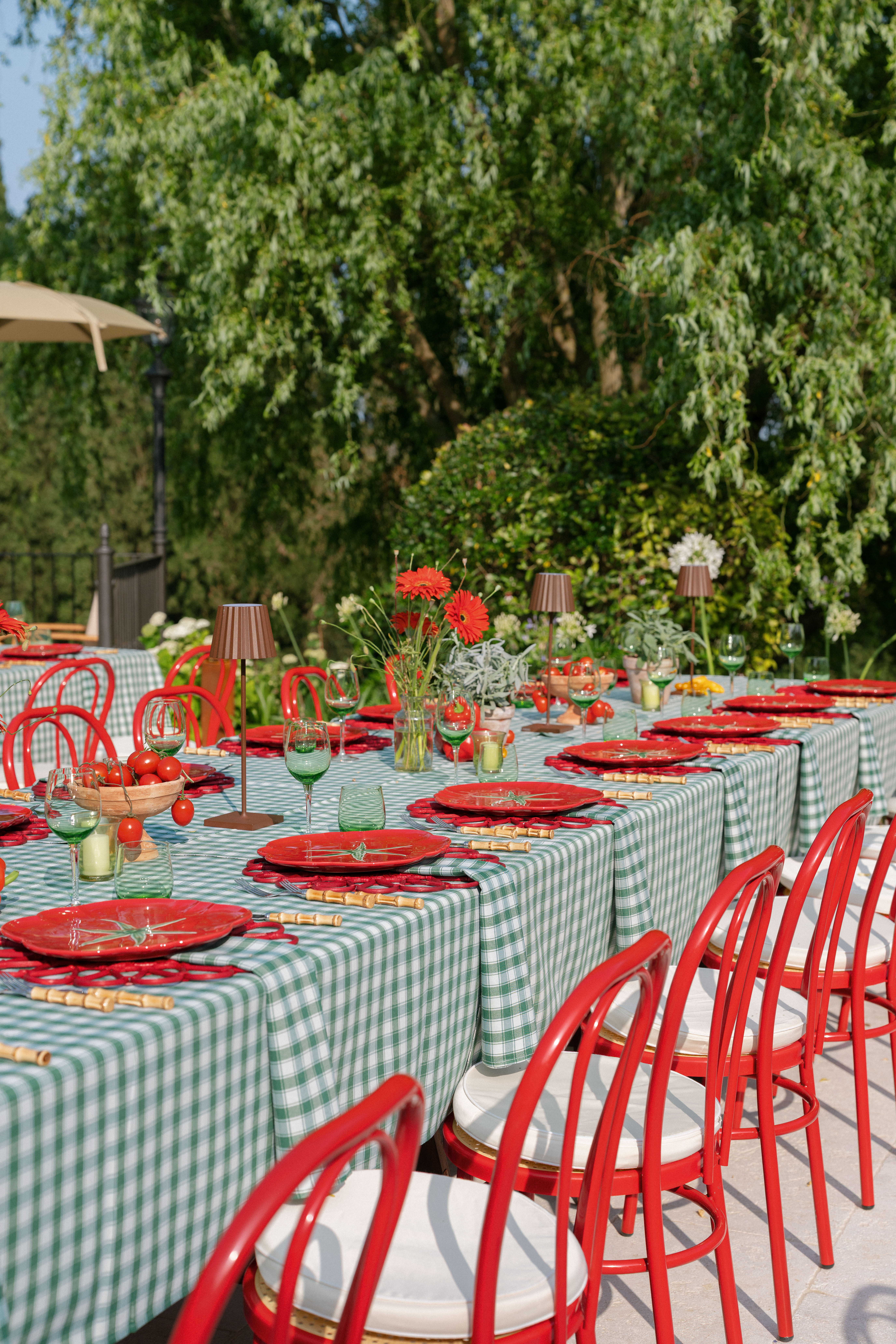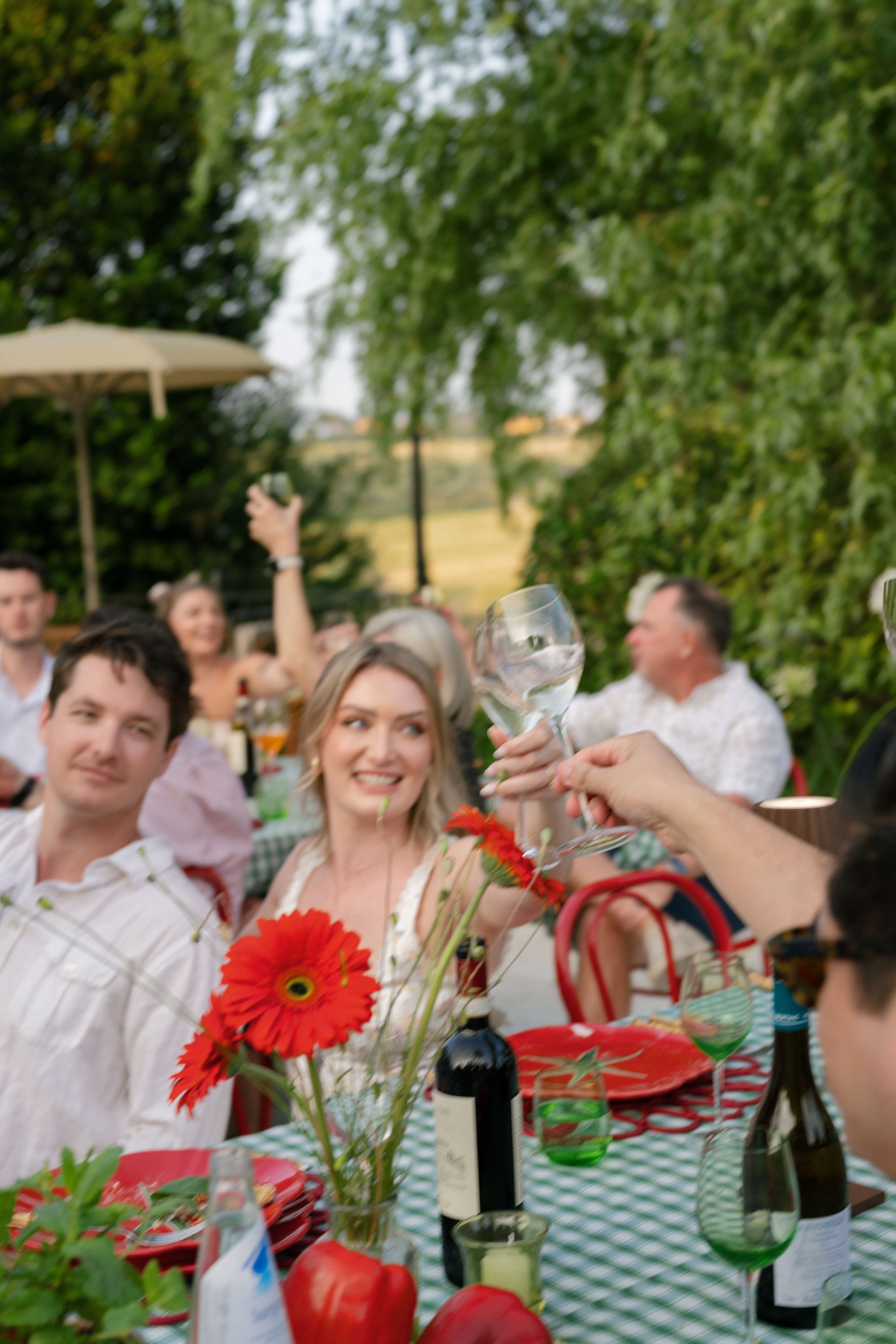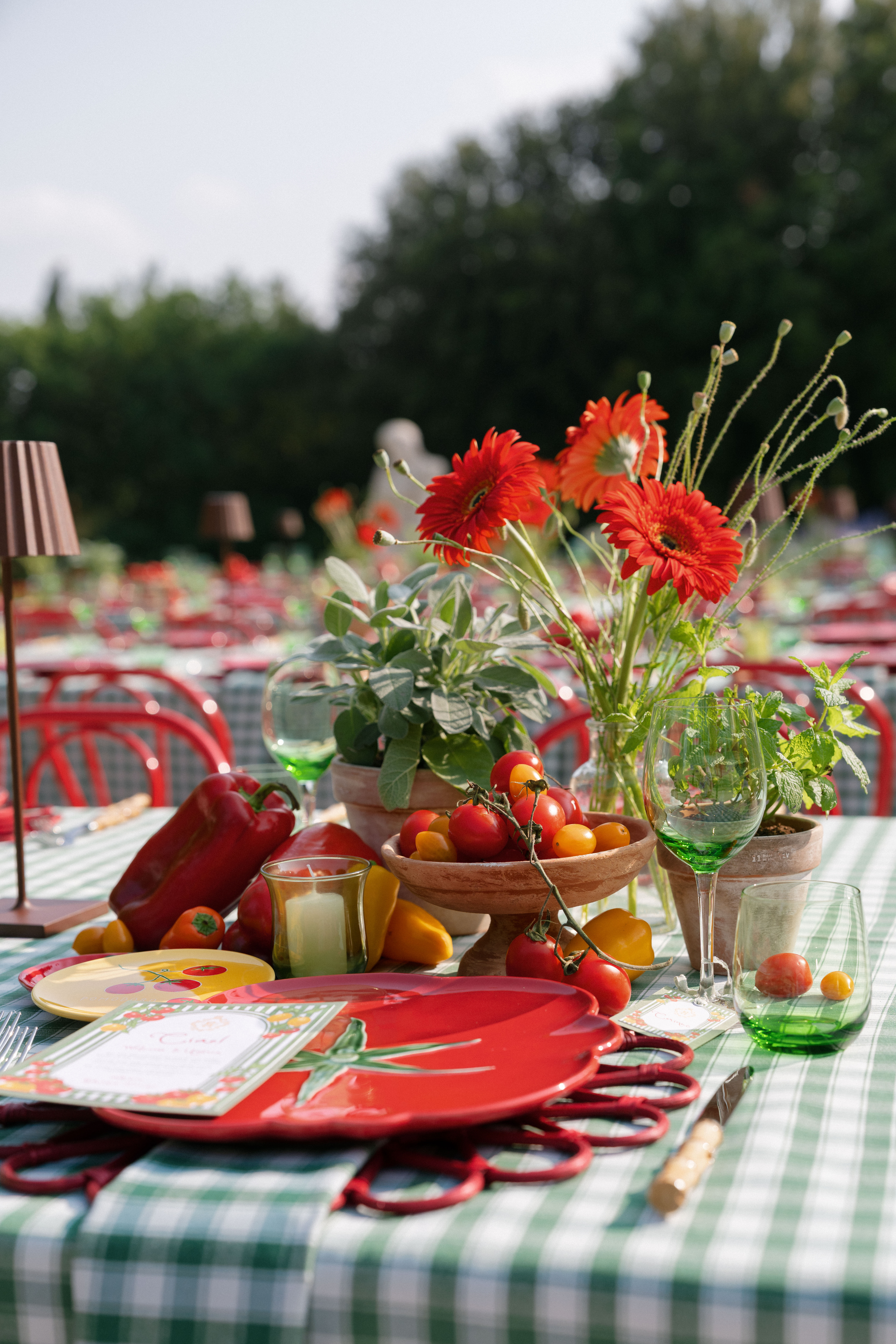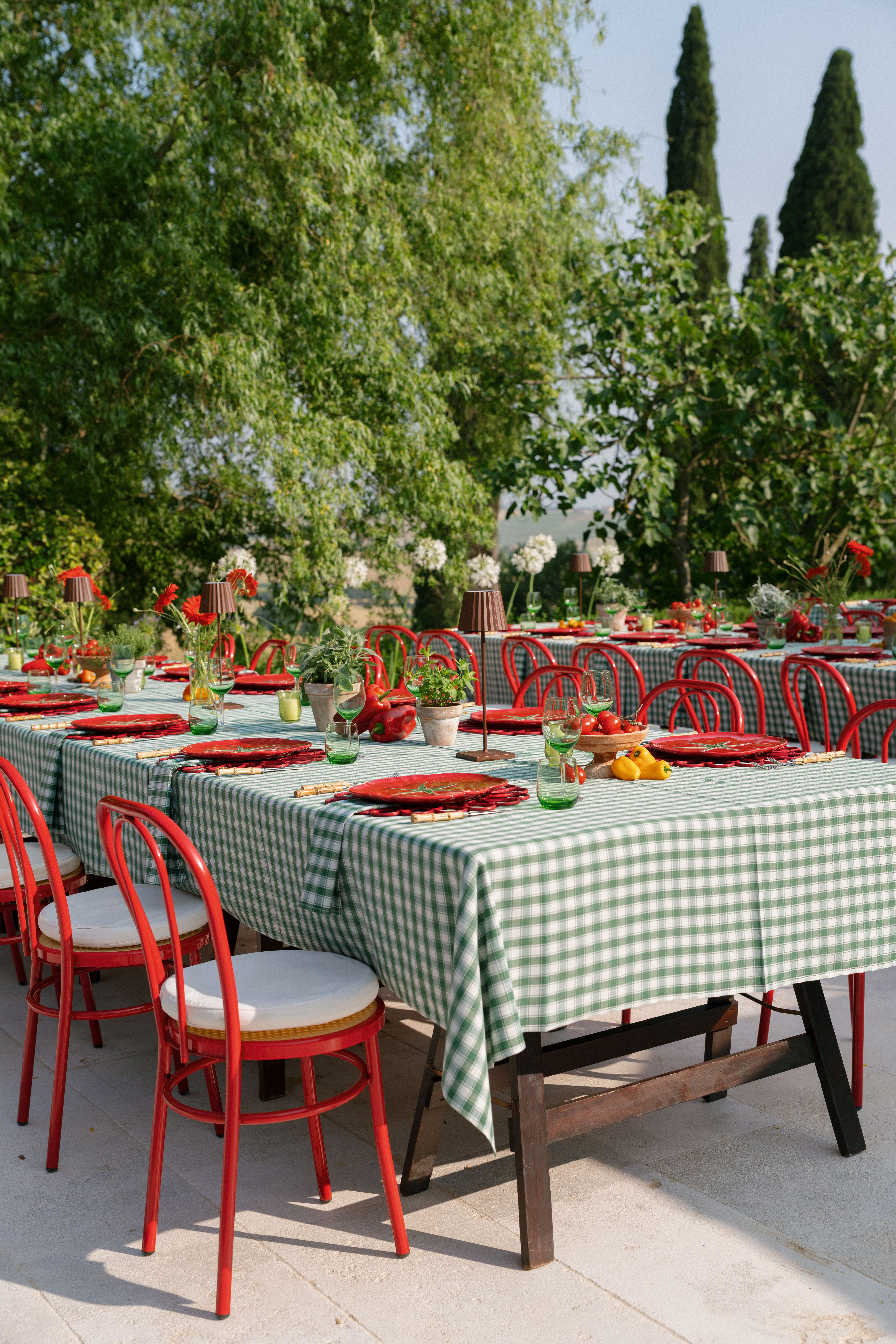 Key details and design elements that wowed guests included on-site oven-cooked pizzas, green gingham table linens, matching red chairs and plates, and juicy tomatoes scattering the tables. This was truly the perfect start to a weekend of celebrating in the Italian countryside!