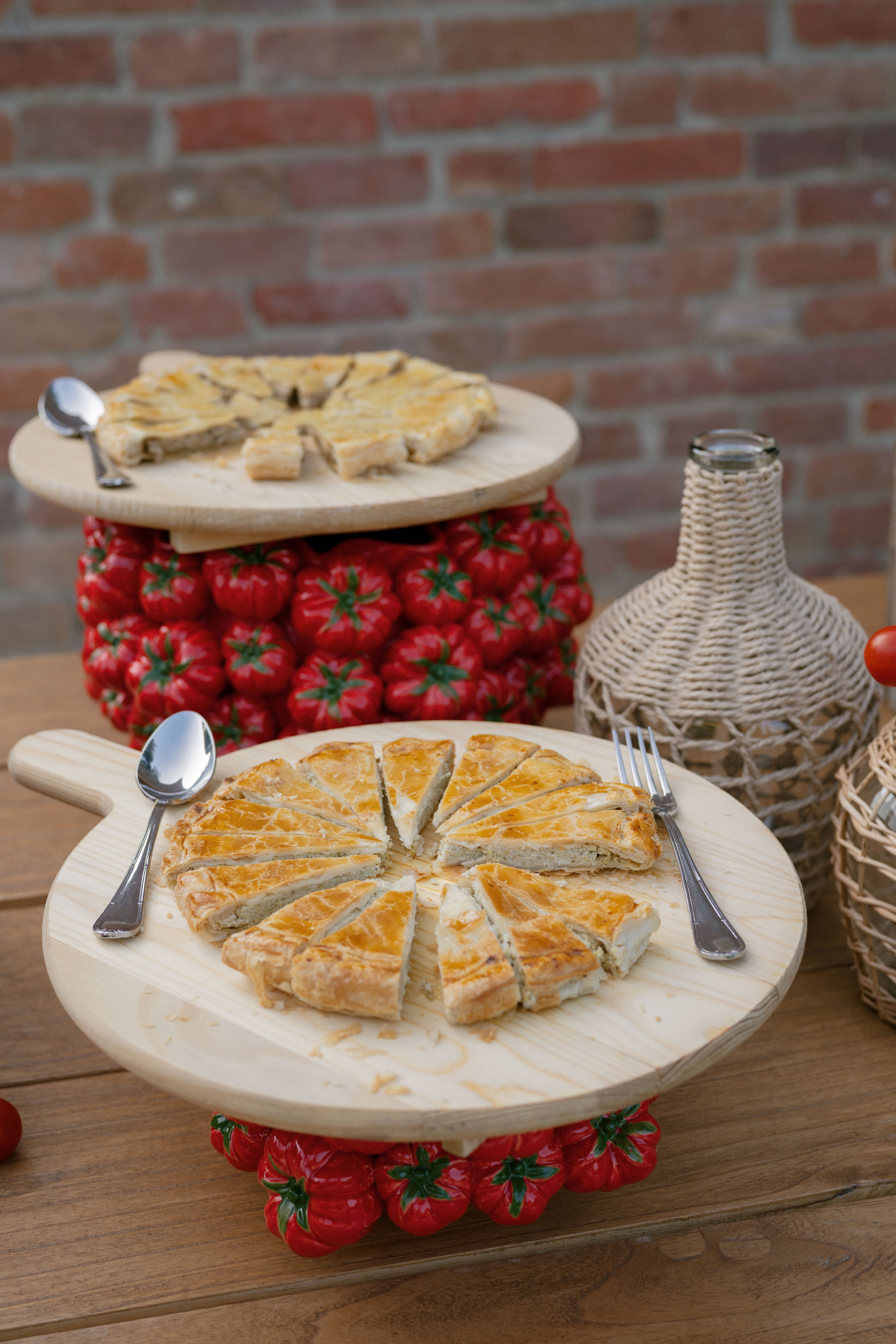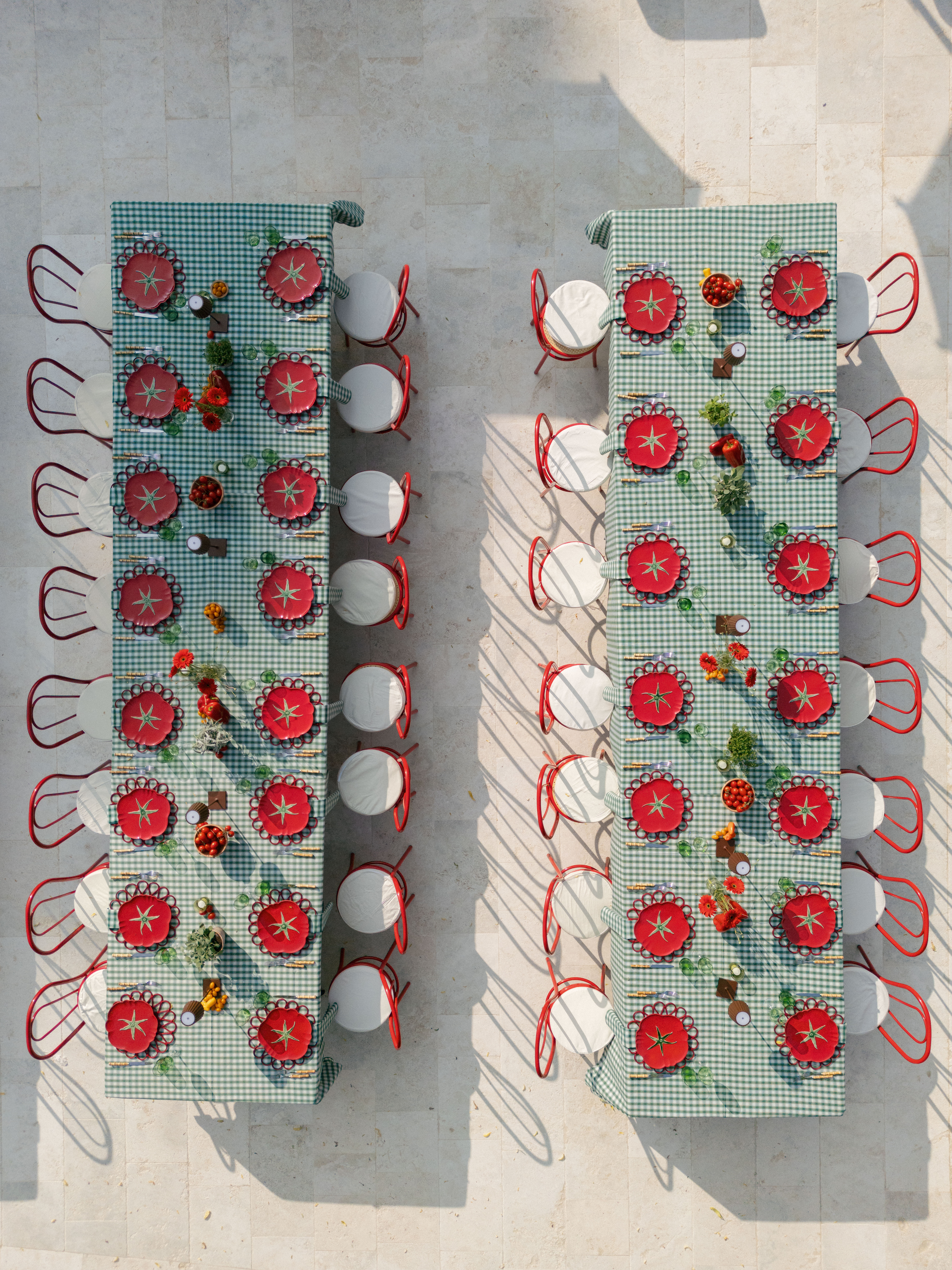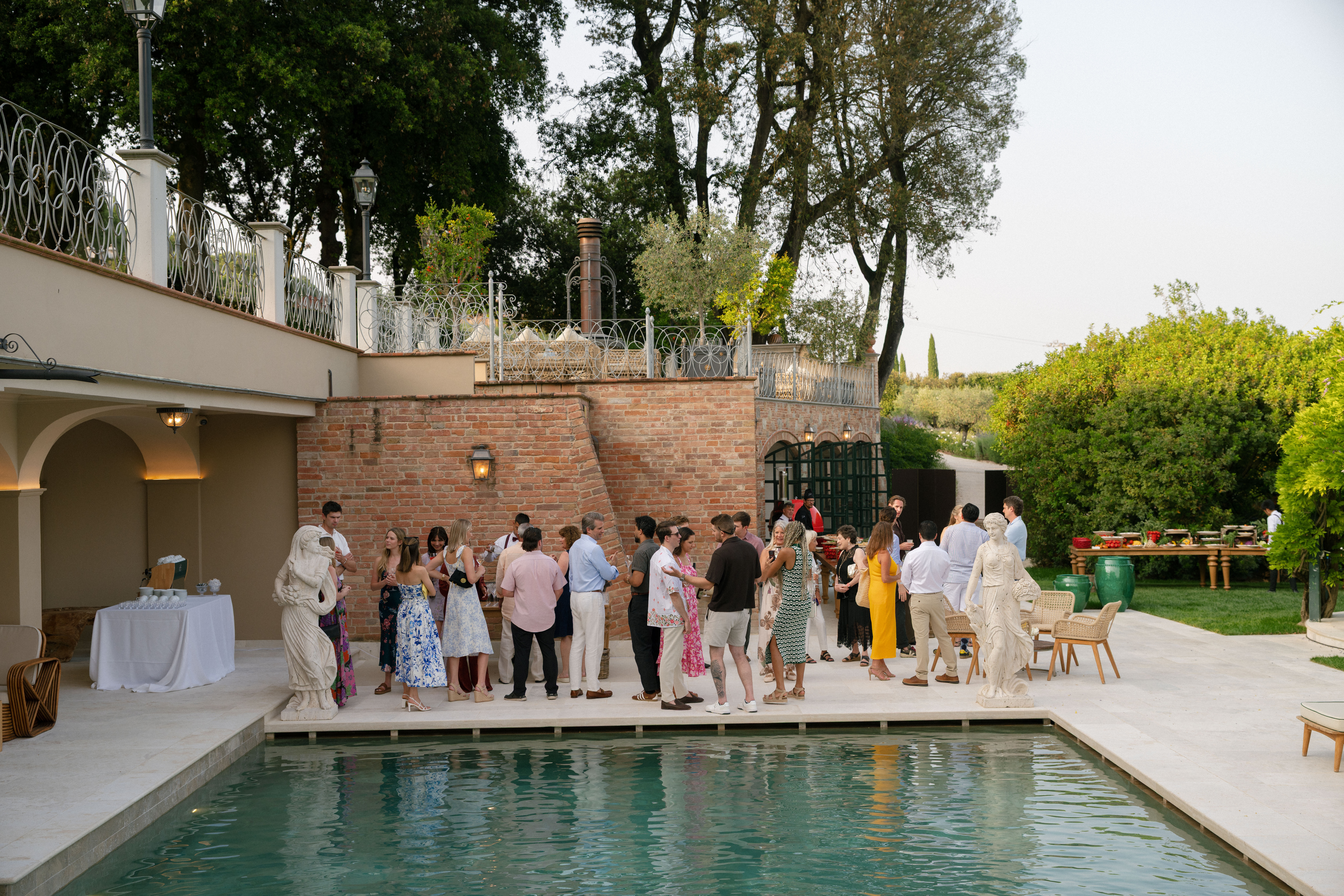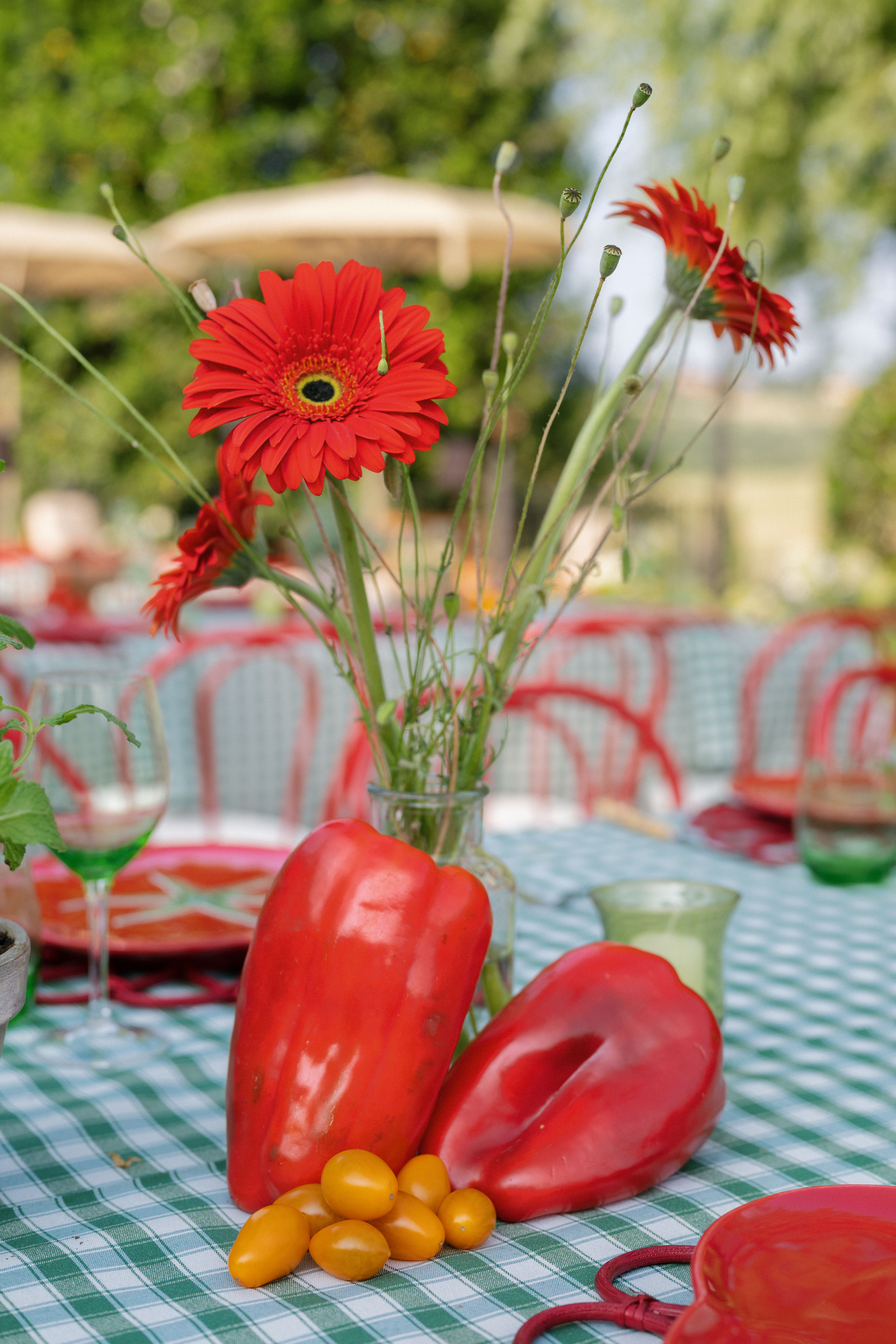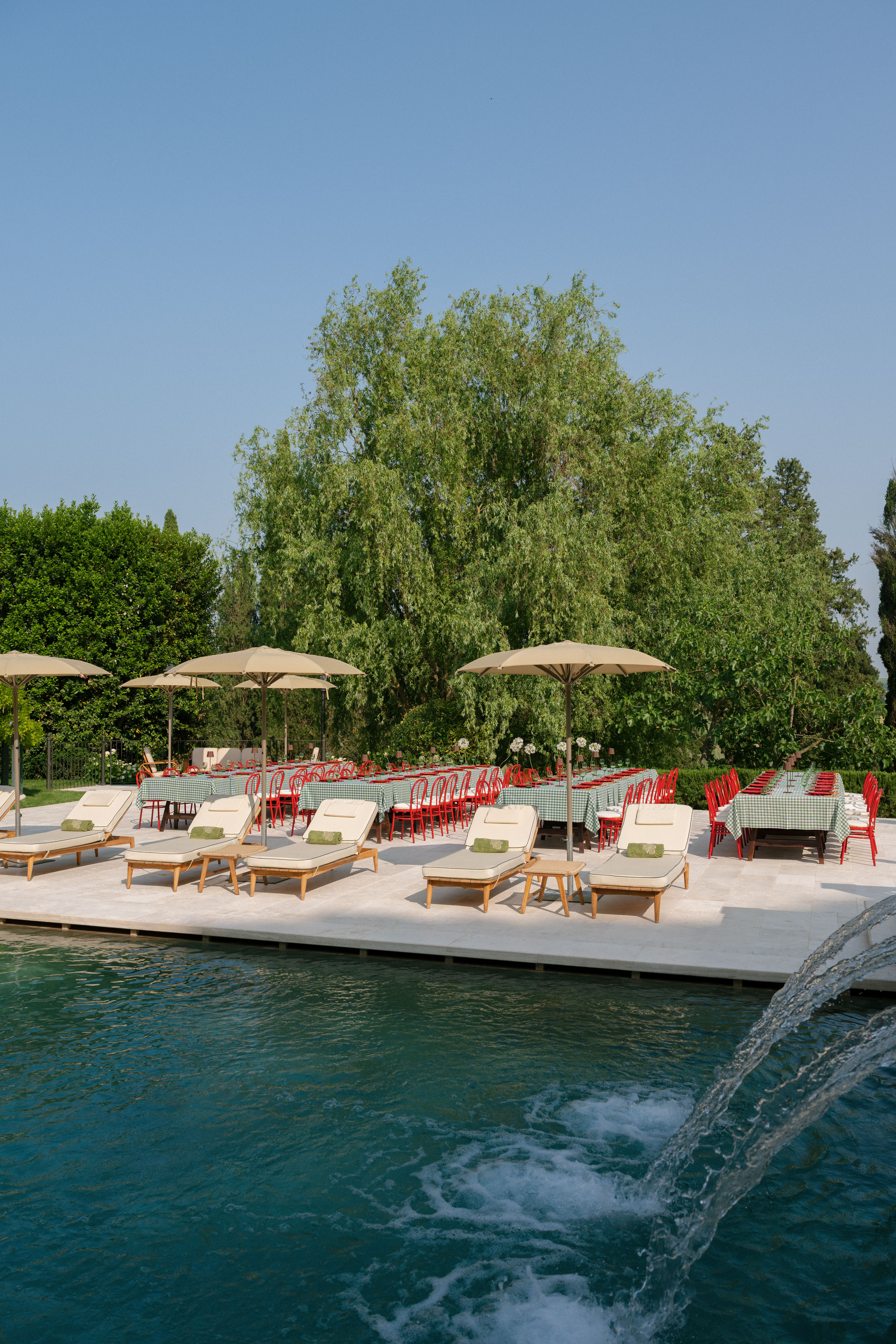 Key details and design elements that wowed guests included on-site oven-cooked pizzas, green gingham table linens, matching red chairs and plates, and juicy tomatoes scattering the tables. This was truly the perfect start to a weekend of celebrating in the Italian countryside!