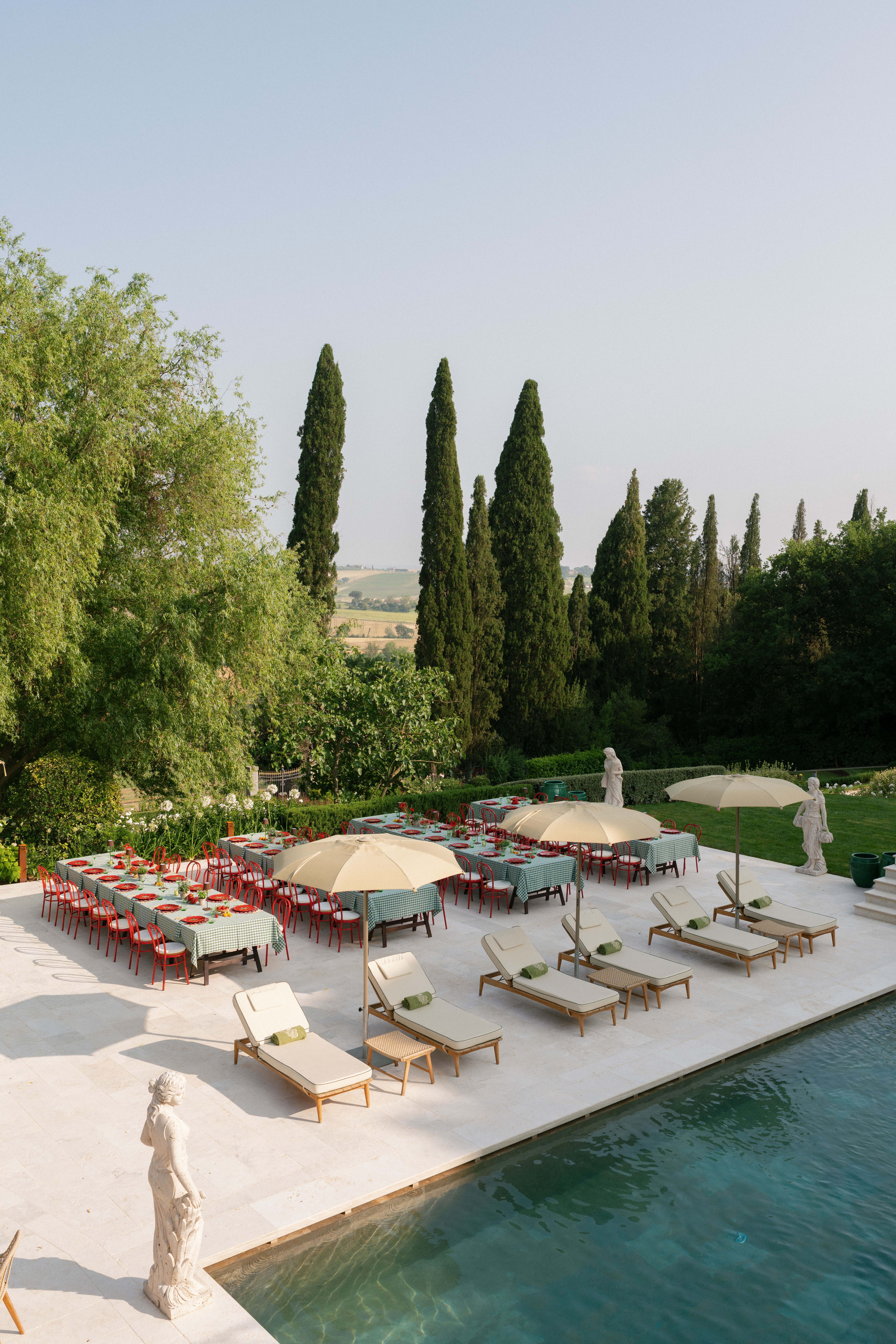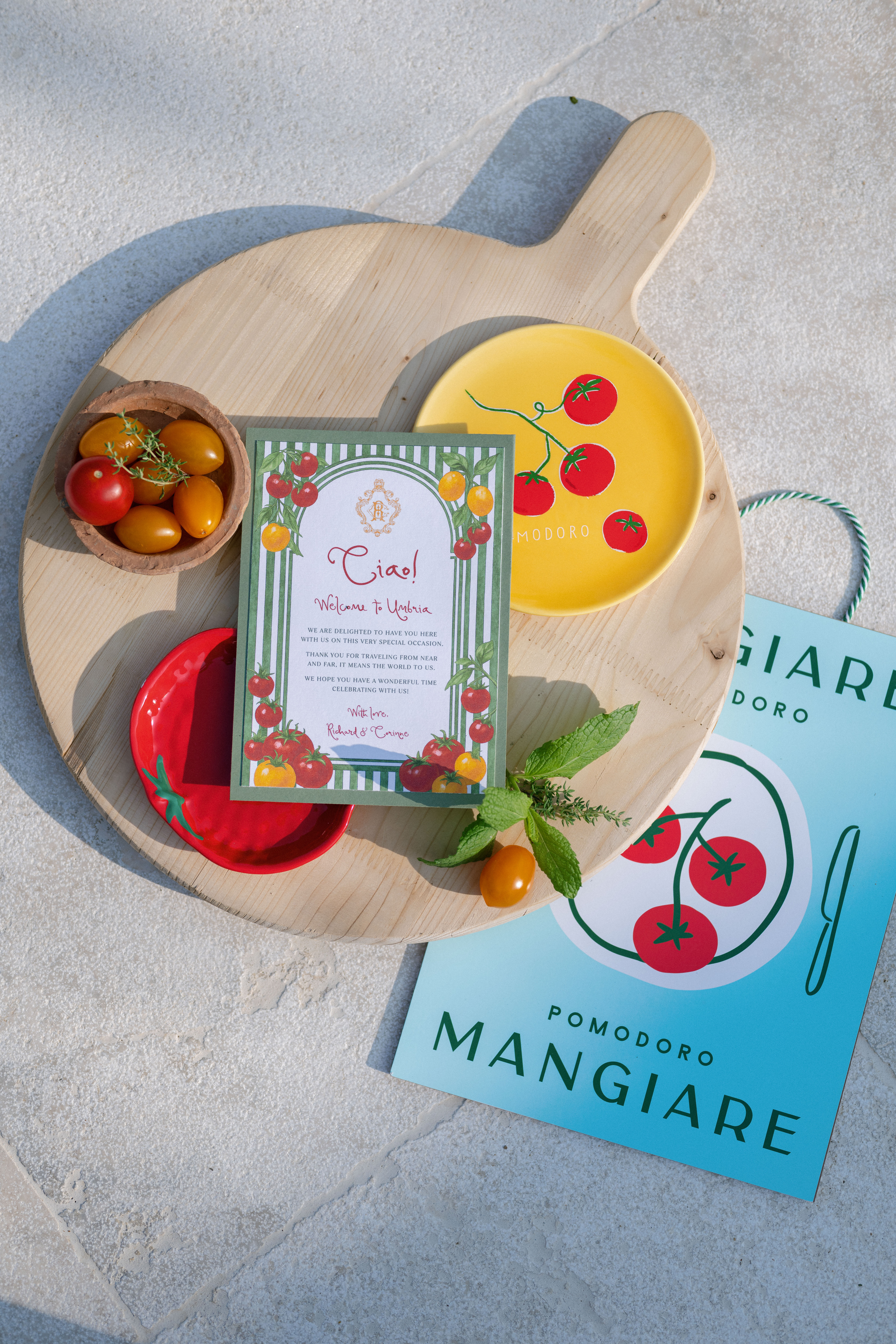Hunter Ryan Photo captured this truly Italian rehearsal dinner, expertly planned by Ema Giangreco at Villa Valentini. This dinner was the perfect Italian countryside welcome as guests gathered poolside to enjoy a seated meal. The dinner was marked with red and green hues and a stunning tomato-theme. The custom stationery and signage from Blanche Heirloom set the tone for the evening with pops of color and whimsical, yet classy, illustrations. As guests mingled, our couple was able to sneak away for some golden hour portraits creating a beautiful memory.