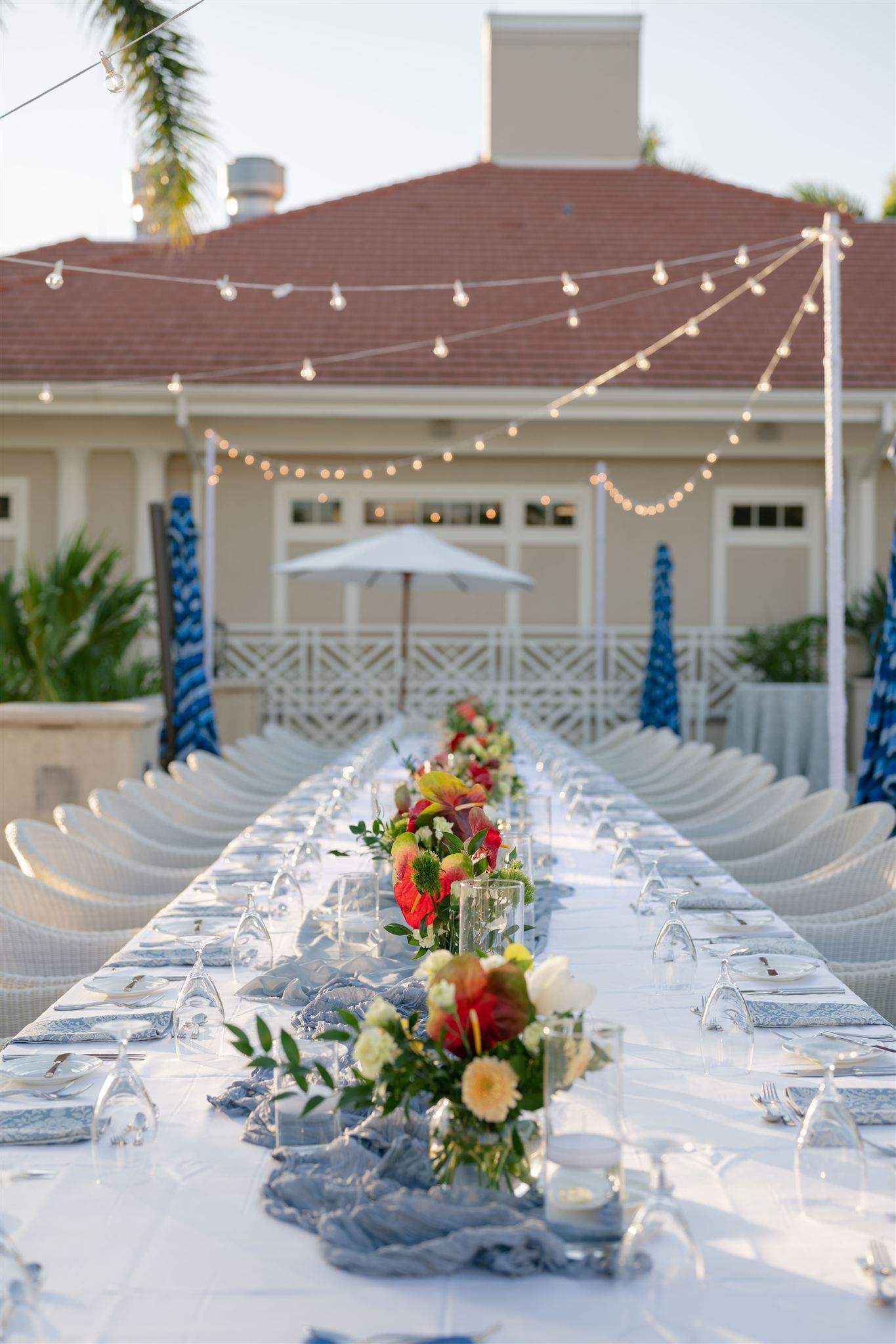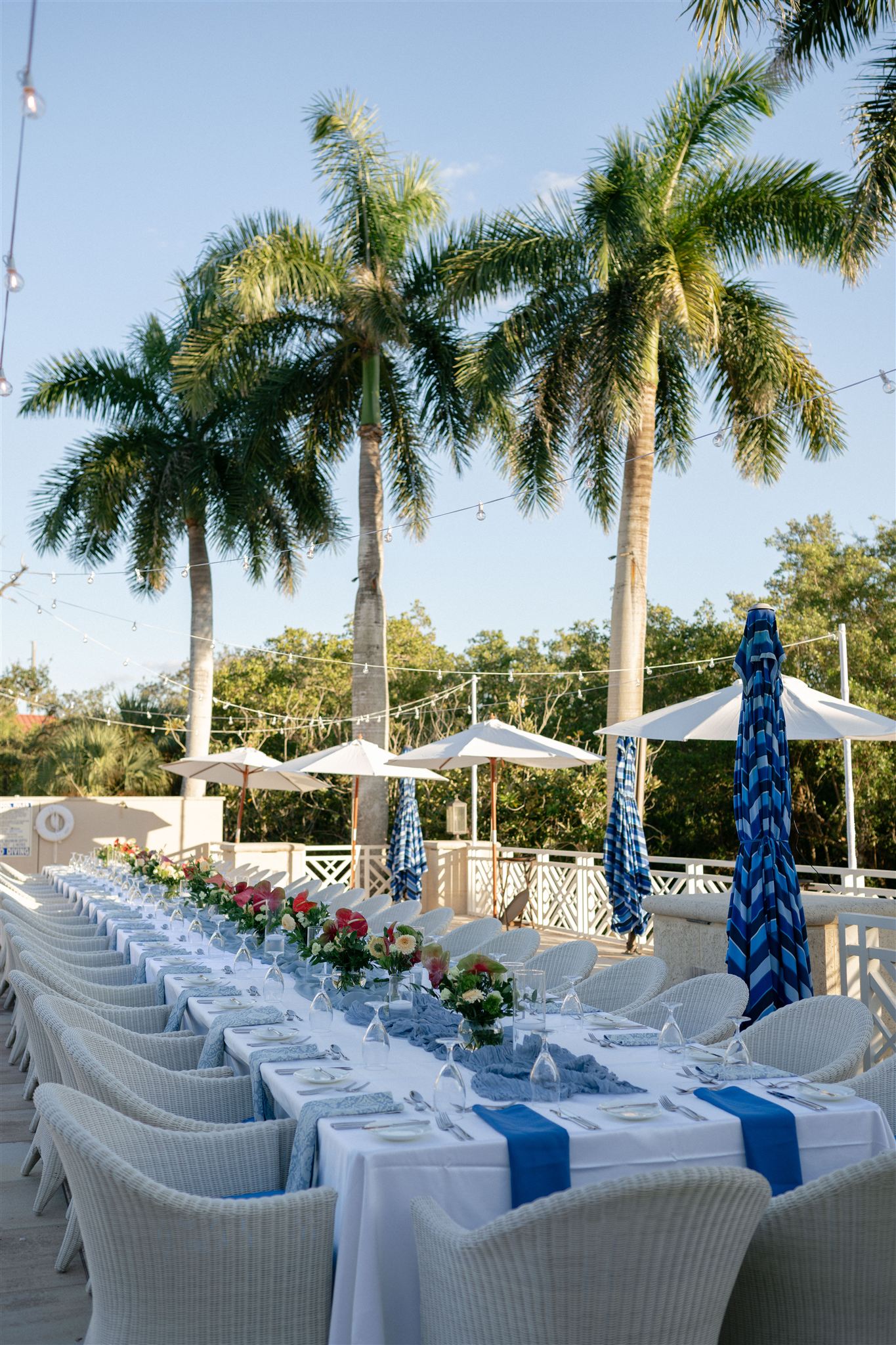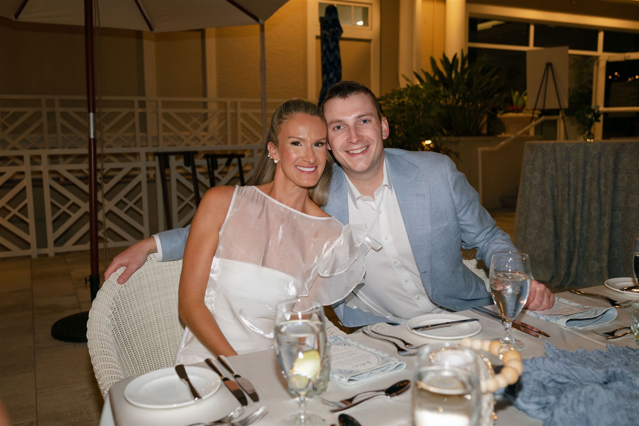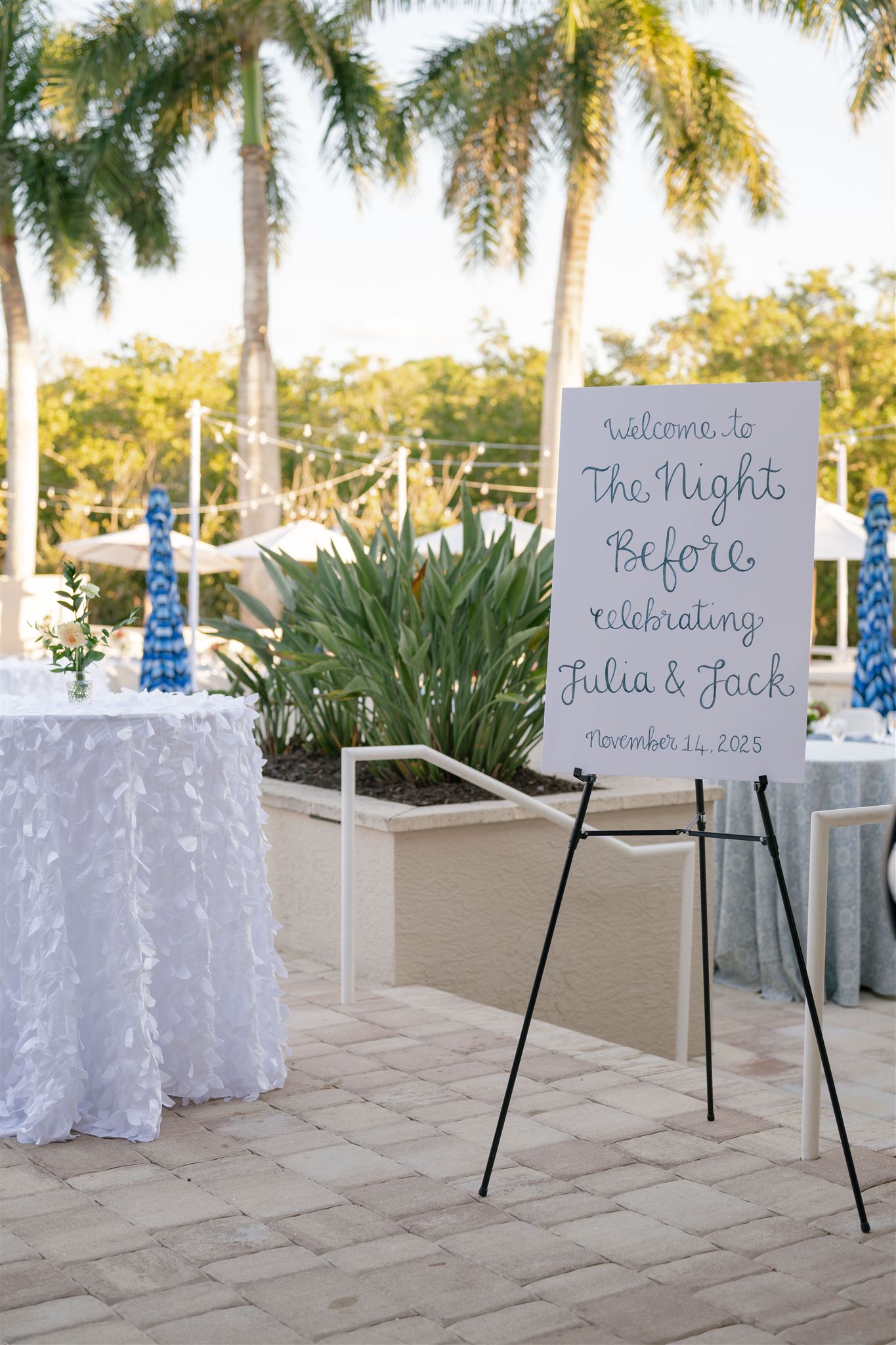 Jet Set Wed planned a beautiful welcome party for this Naples, Florida wedding weekend. Hunter Ryan Photo flawlessly captured the pre-wedding celebrations, preserving each memory. The party was held outside at Collier’s Reserve Country Club on their stone patio. Guests were welcomed with a custom sign from The Fox in the Attic as they gathered beneath the string lights. One long table was adorned with baby blue napkins, colorful florals, and crisp white linens. Guests wowed with colorful fashion choices and chic bags while the couple opted for a bridal look with a white frilled dress and power blue suit jacket. They snuck off for golden hour portraits around the property as guests mingled while the sun began to set. Loved ones enjoyed a plated meal beneath the stars as they helped usher in the excitement for Julia & Jack’s wedding weekend. This was the perfect start to their marriage and such a joy to capture!