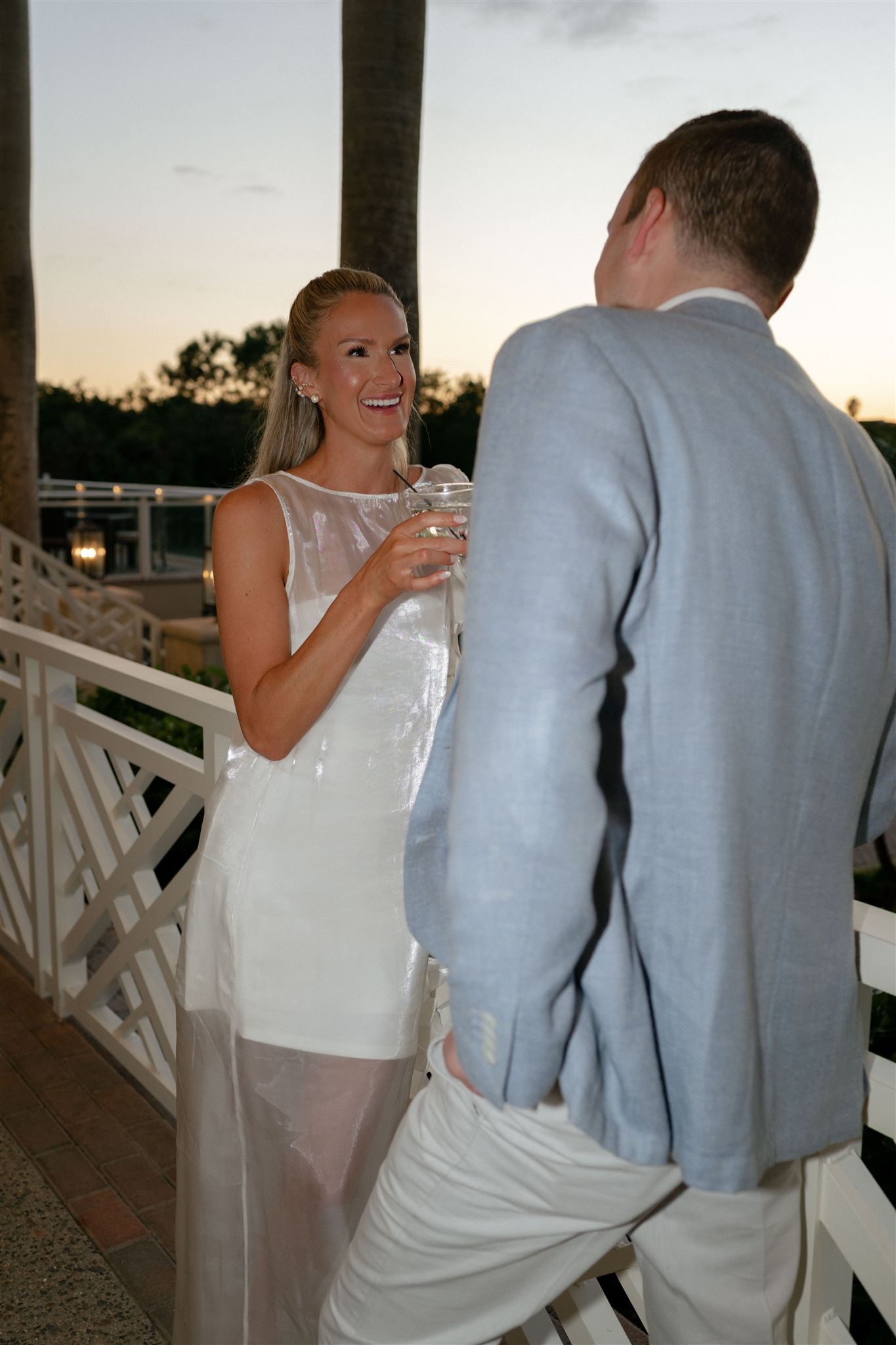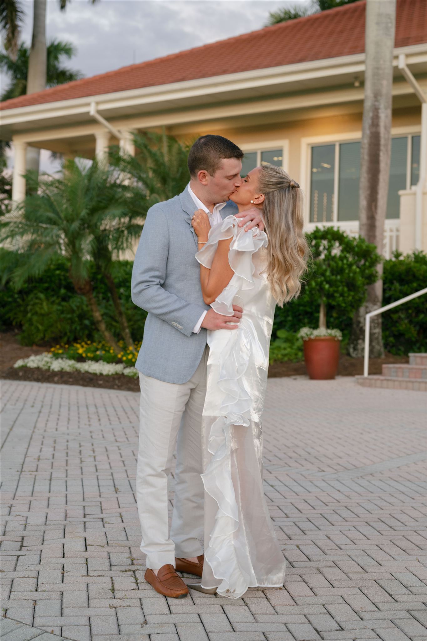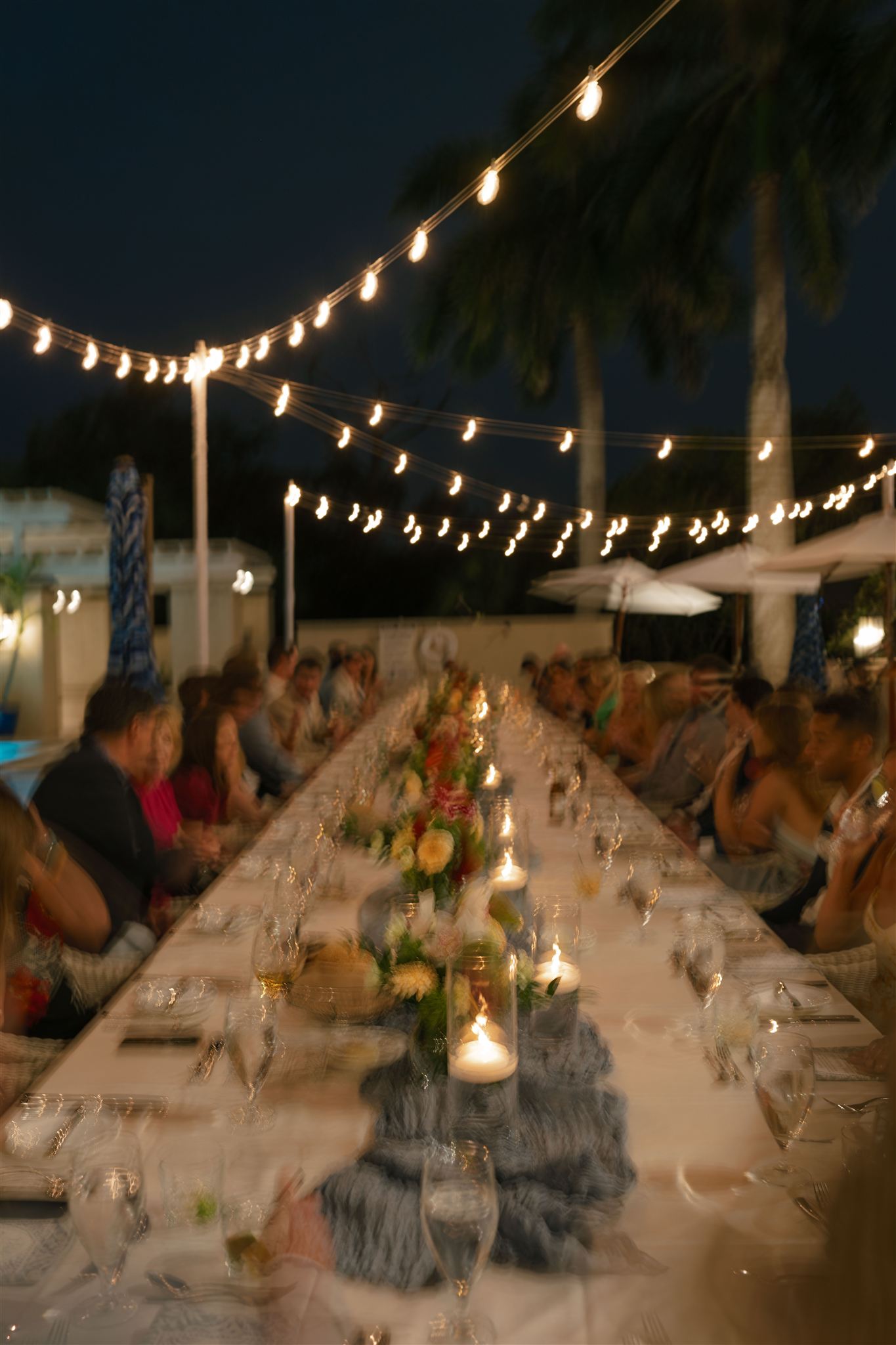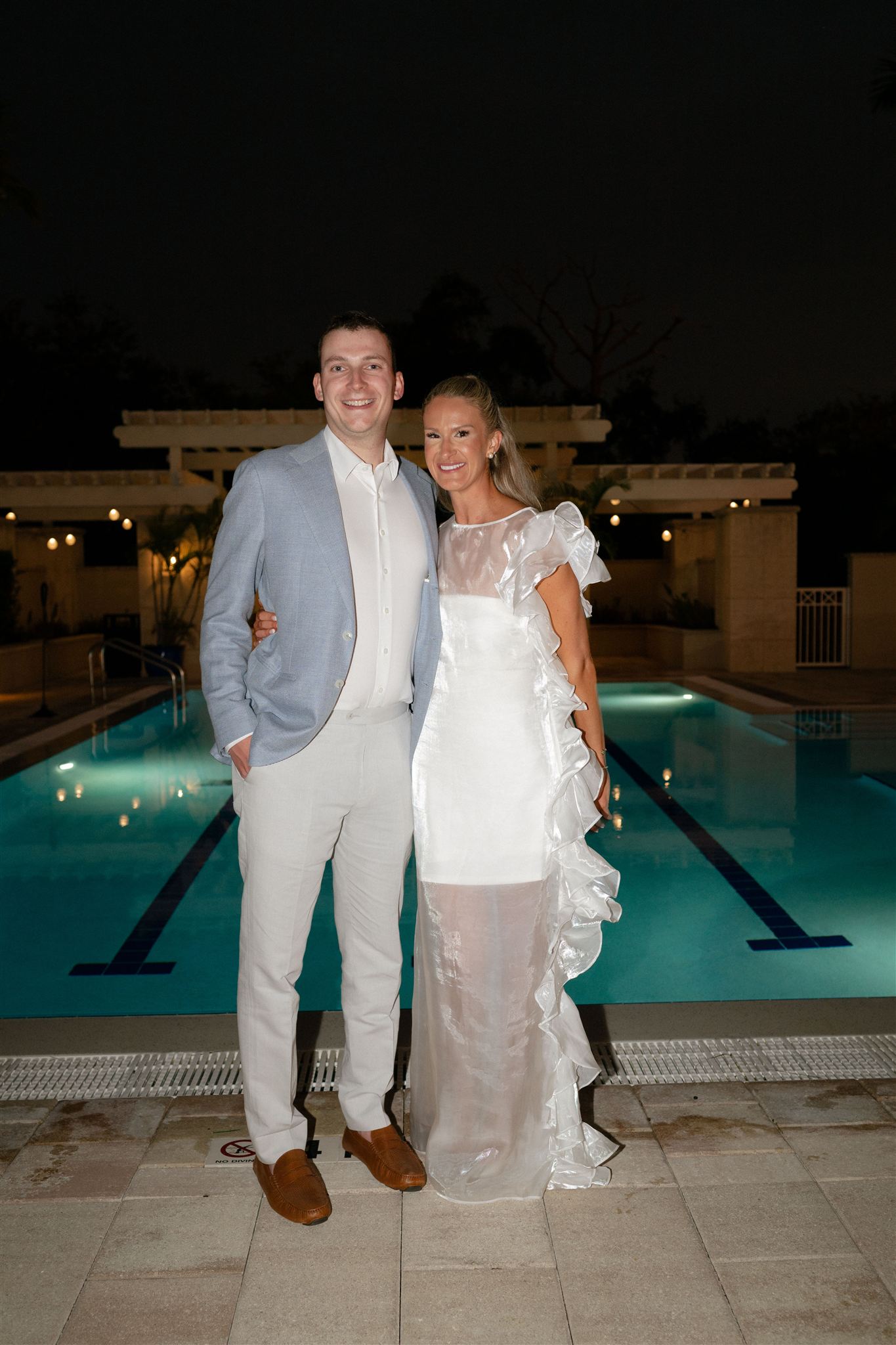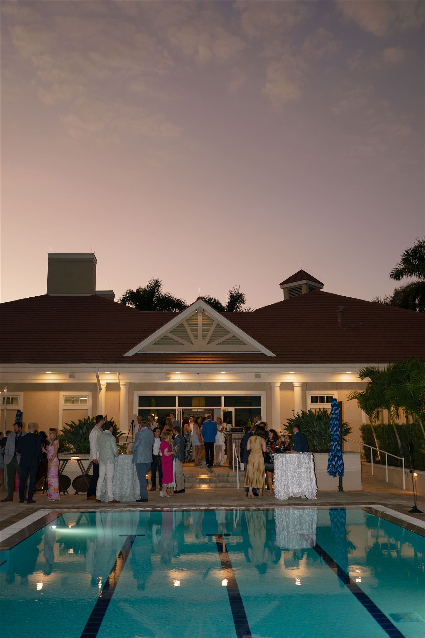 Jet Set Wed planned a beautiful welcome party for this Naples, Florida wedding weekend. Hunter Ryan Photo flawlessly captured the pre-wedding celebrations, preserving each memory. The party was held outside at Collier’s Reserve Country Club on their stone patio. Guests were welcomed with a custom sign from The Fox in the Attic as they gathered beneath the string lights. One long table was adorned with baby blue napkins, colorful florals, and crisp white linens. Guests wowed with colorful fashion choices and chic bags while the couple opted for a bridal look with a white frilled dress and power blue suit jacket. They snuck off for golden hour portraits around the property as guests mingled while the sun began to set. Loved ones enjoyed a plated meal beneath the stars as they helped usher in the excitement for Julia & Jack’s wedding weekend. This was the perfect start to their marriage and such a joy to capture!