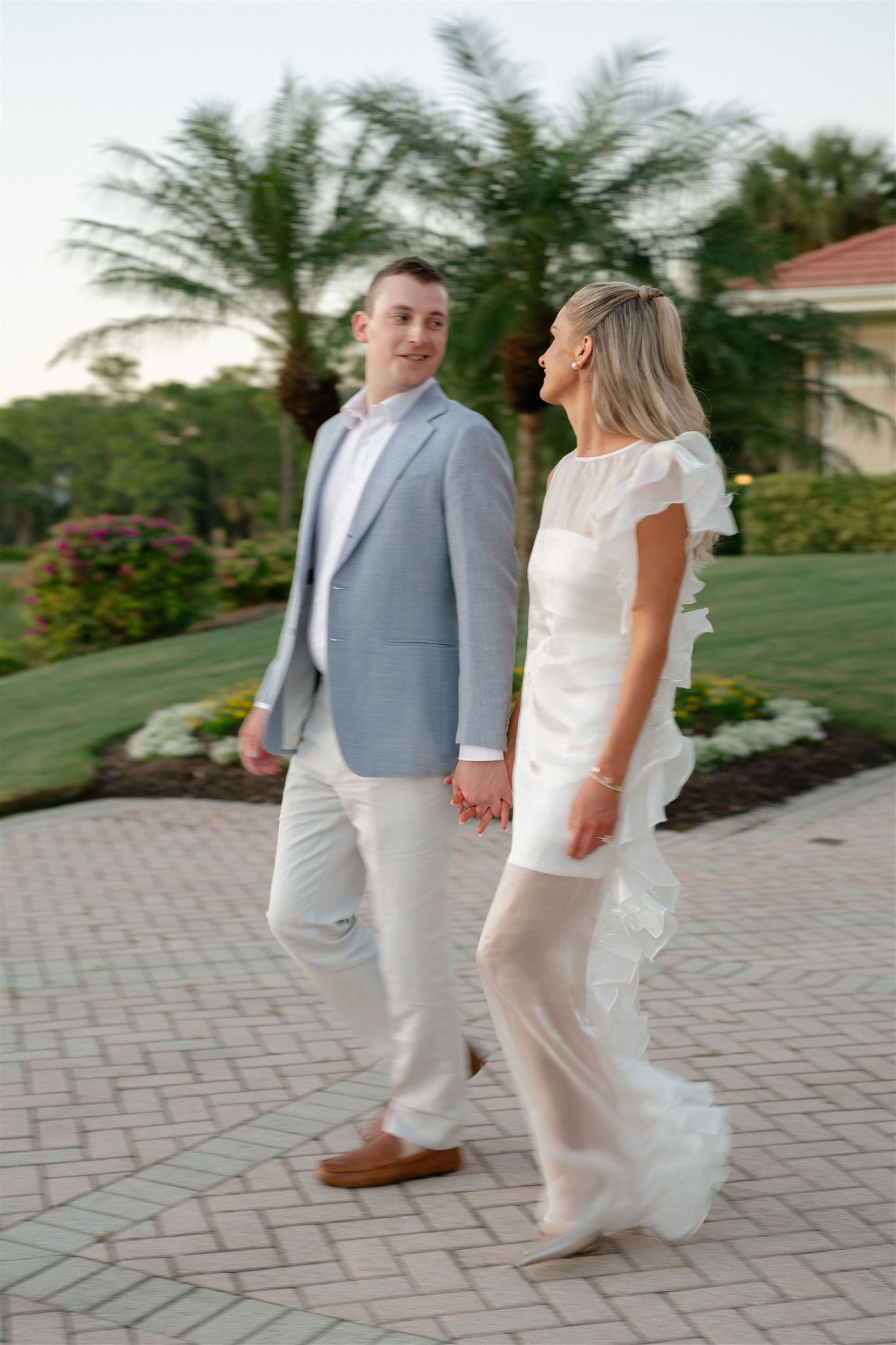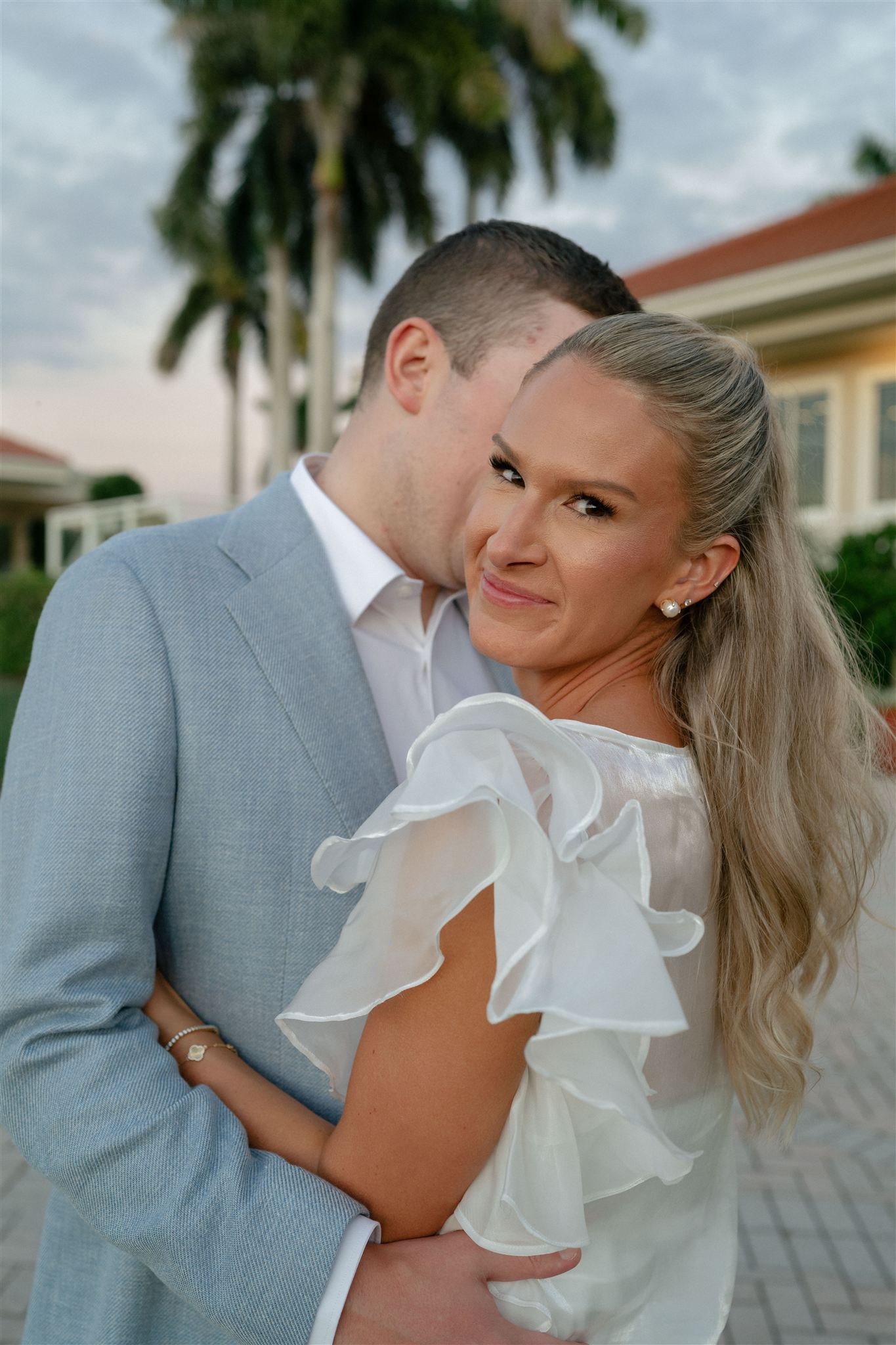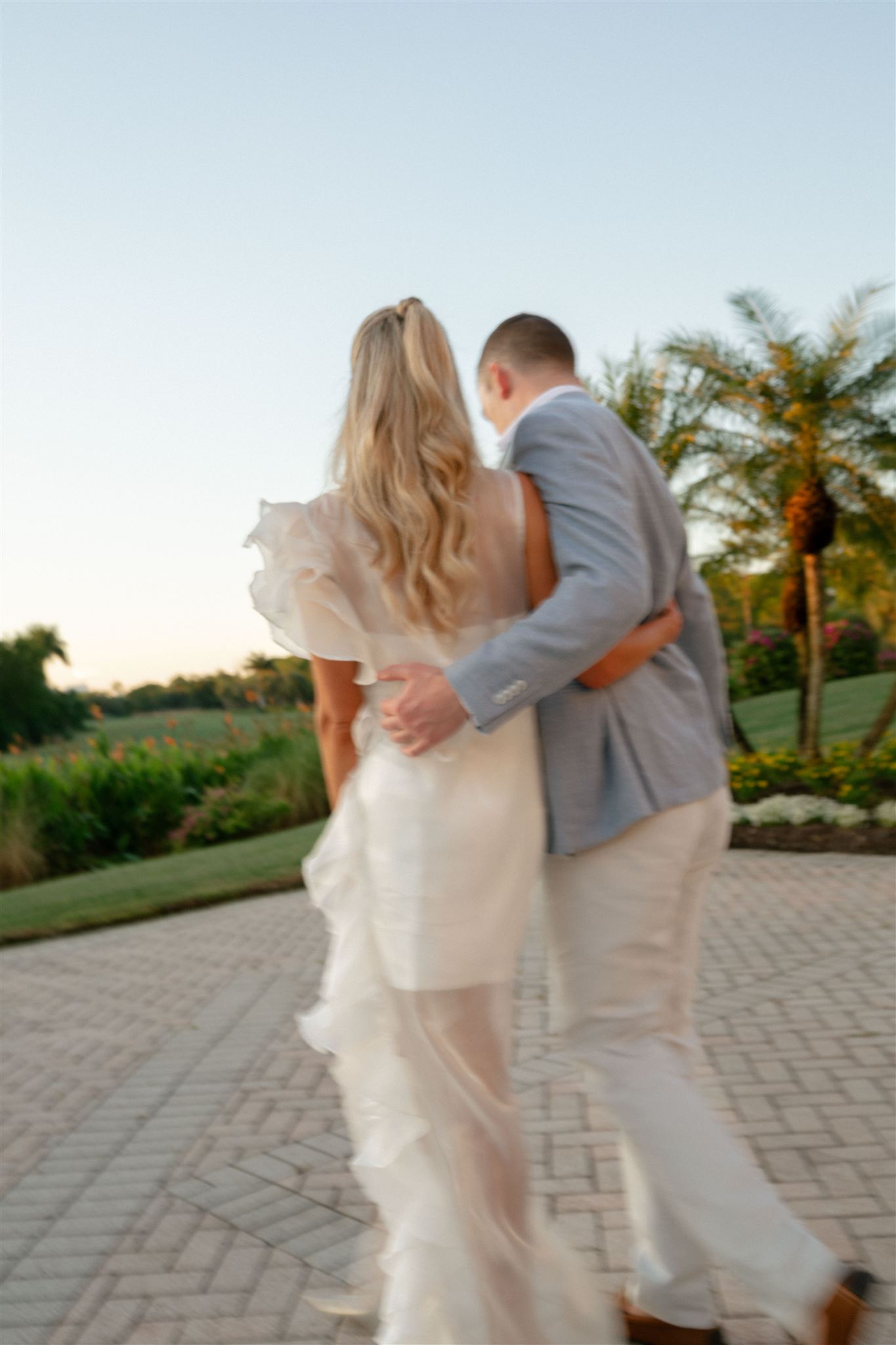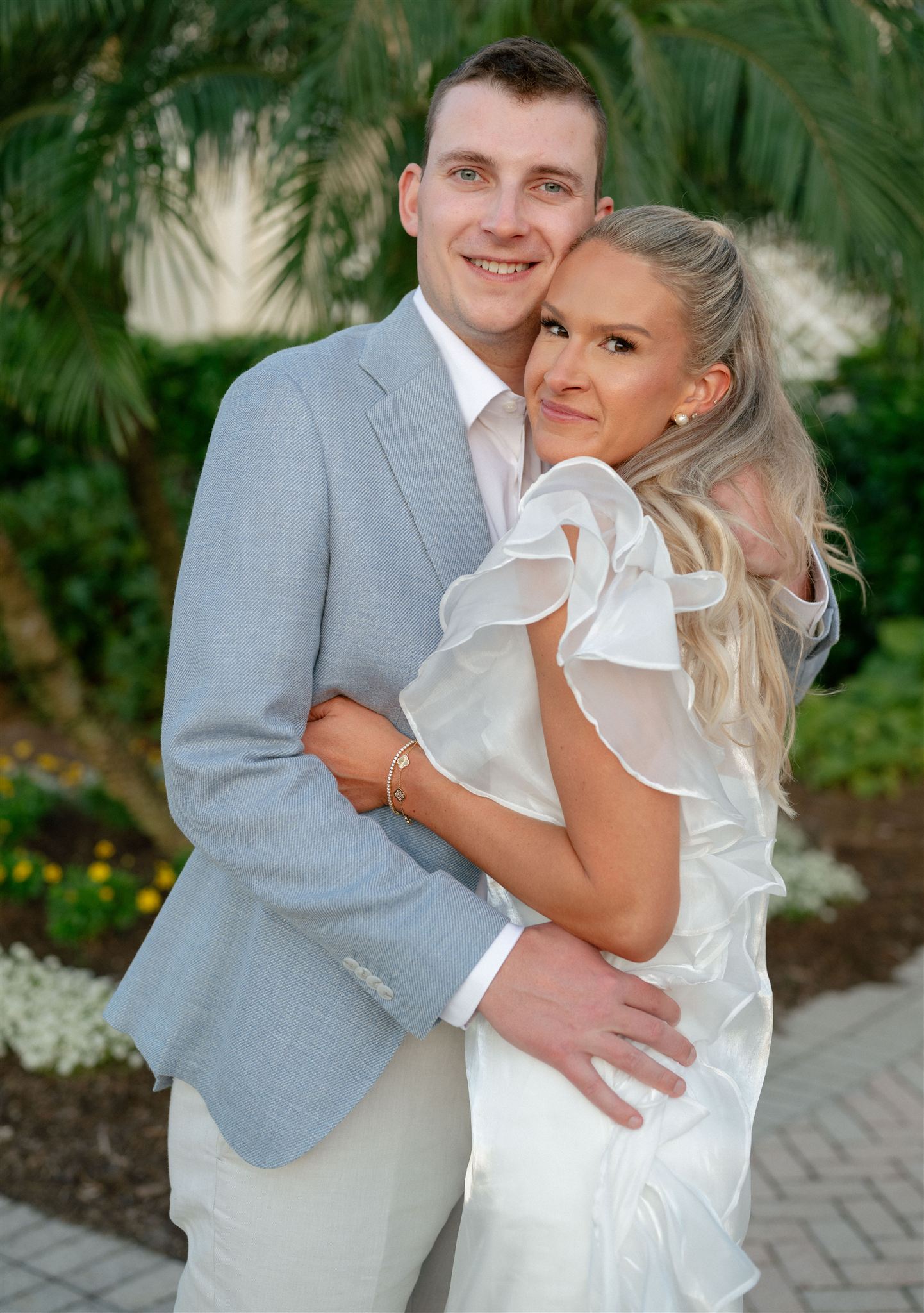 Jet Set Wed planned a beautiful welcome party for this Naples, Florida wedding weekend. Hunter Ryan Photo flawlessly captured the pre-wedding celebrations, preserving each memory. The party was held outside at Collier’s Reserve Country Club on their stone patio. Guests were welcomed with a custom sign from The Fox in the Attic as they gathered beneath the string lights. One long table was adorned with baby blue napkins, colorful florals, and crisp white linens. Guests wowed with colorful fashion choices and chic bags while the couple opted for a bridal look with a white frilled dress and power blue suit jacket. They snuck off for golden hour portraits around the property as guests mingled while the sun began to set. Loved ones enjoyed a plated meal beneath the stars as they helped usher in the excitement for Julia & Jack’s wedding weekend. This was the perfect start to their marriage and such a joy to capture!