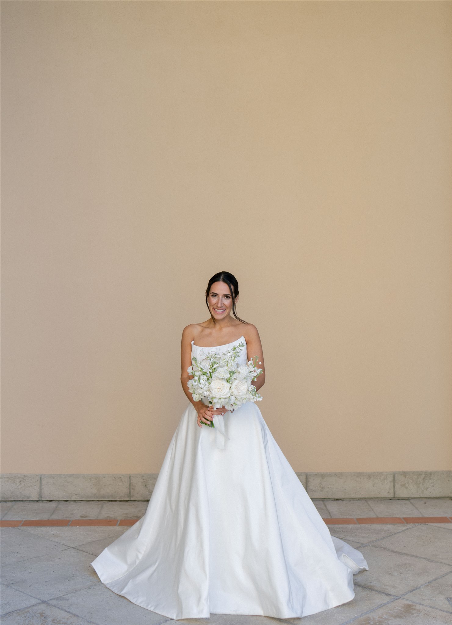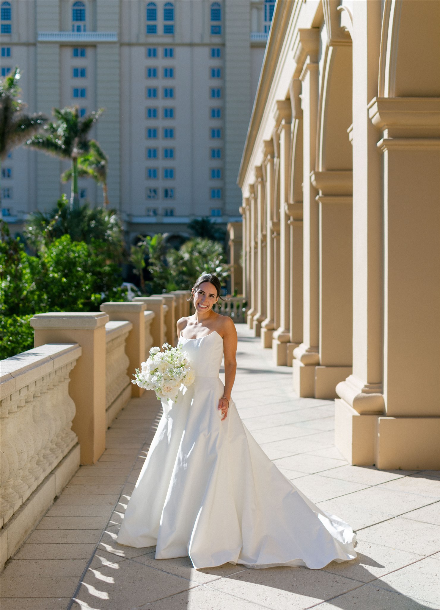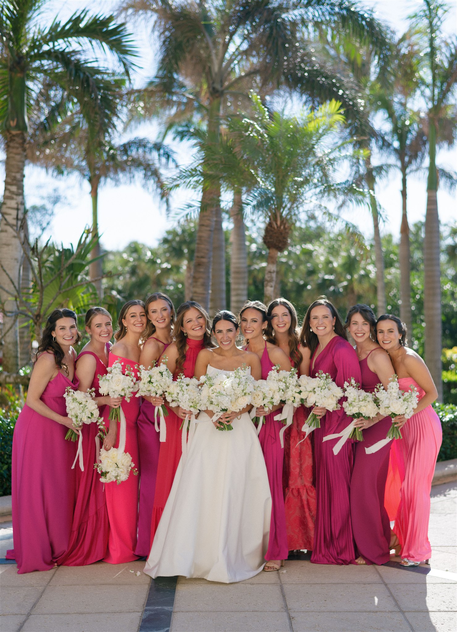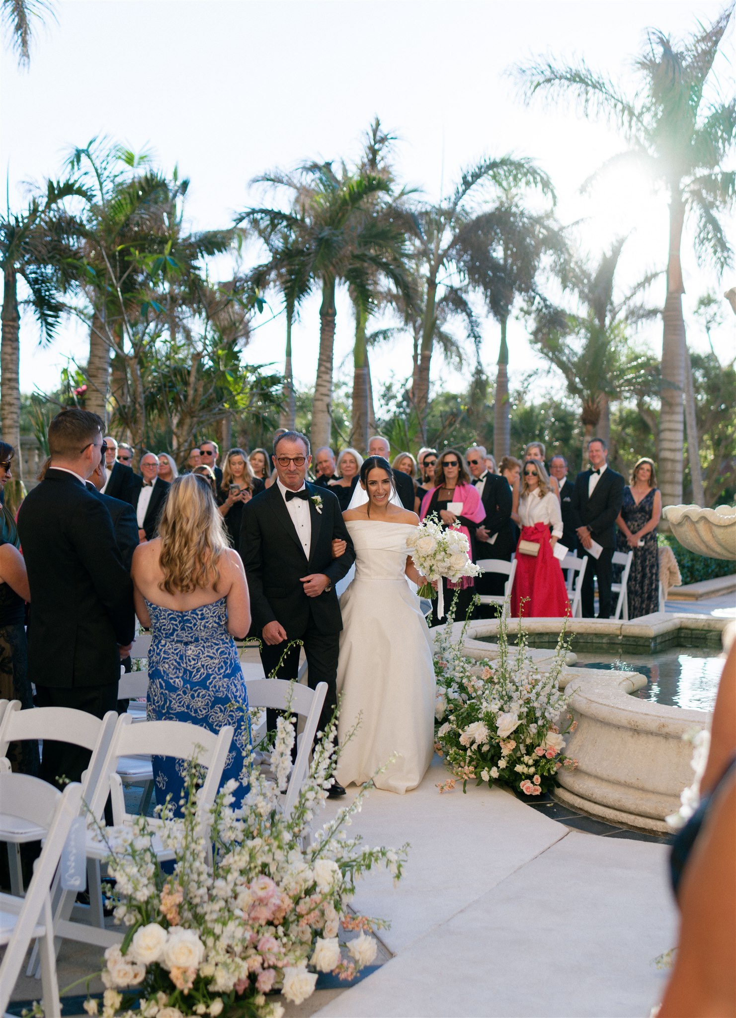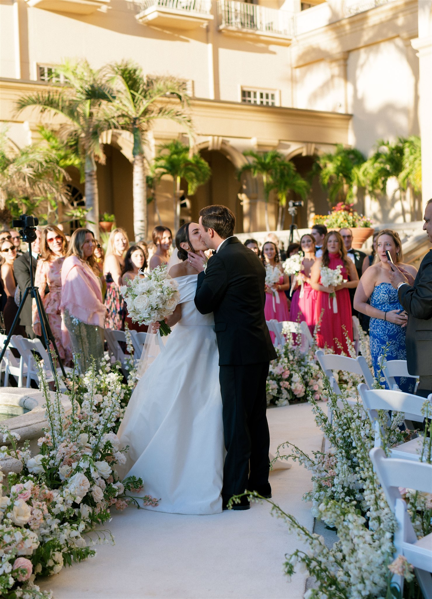Alyssa and Brad’s Elegant Wedding at The Ritz-Carlton, Naples was a breathtaking celebration planned by Table 6 Productions. Alyssa stunned in a strapless gown with a removable wrap and gold Loeffler Randall ribbon shoes, with Duality styling her soft chignon and natural makeup. She carried a classic white bouquet by Kaleidoscope Florals, while Brad looked sharp in a black tuxedo. The couple shared a heartfelt first look before exchanging vows in the courtyard, where pastel florals lined the aisle and framed a romantic arch. Bridesmaids in shades of pink stood beside Alyssa, while the groomsmen wore classic black tuxedos.