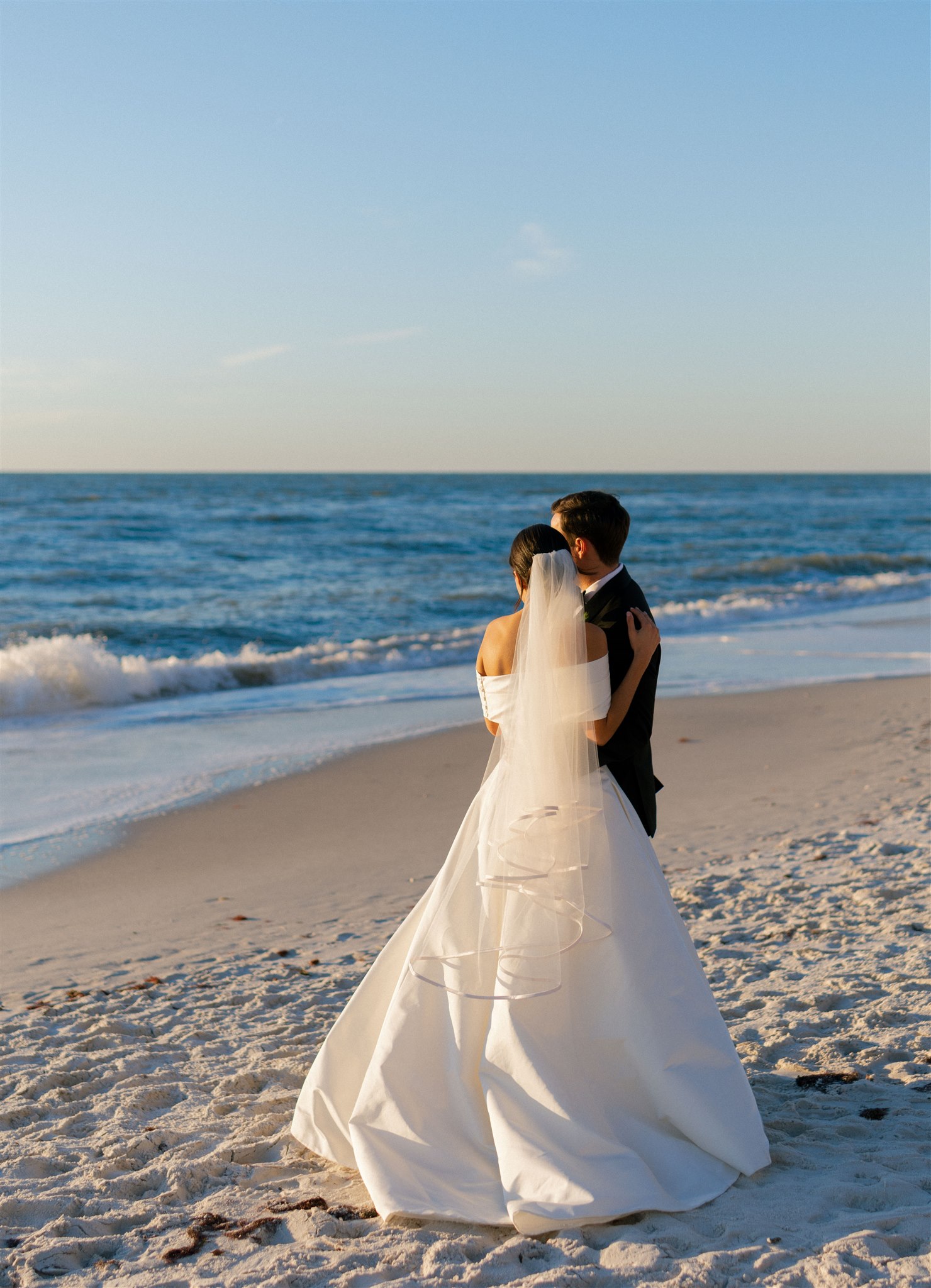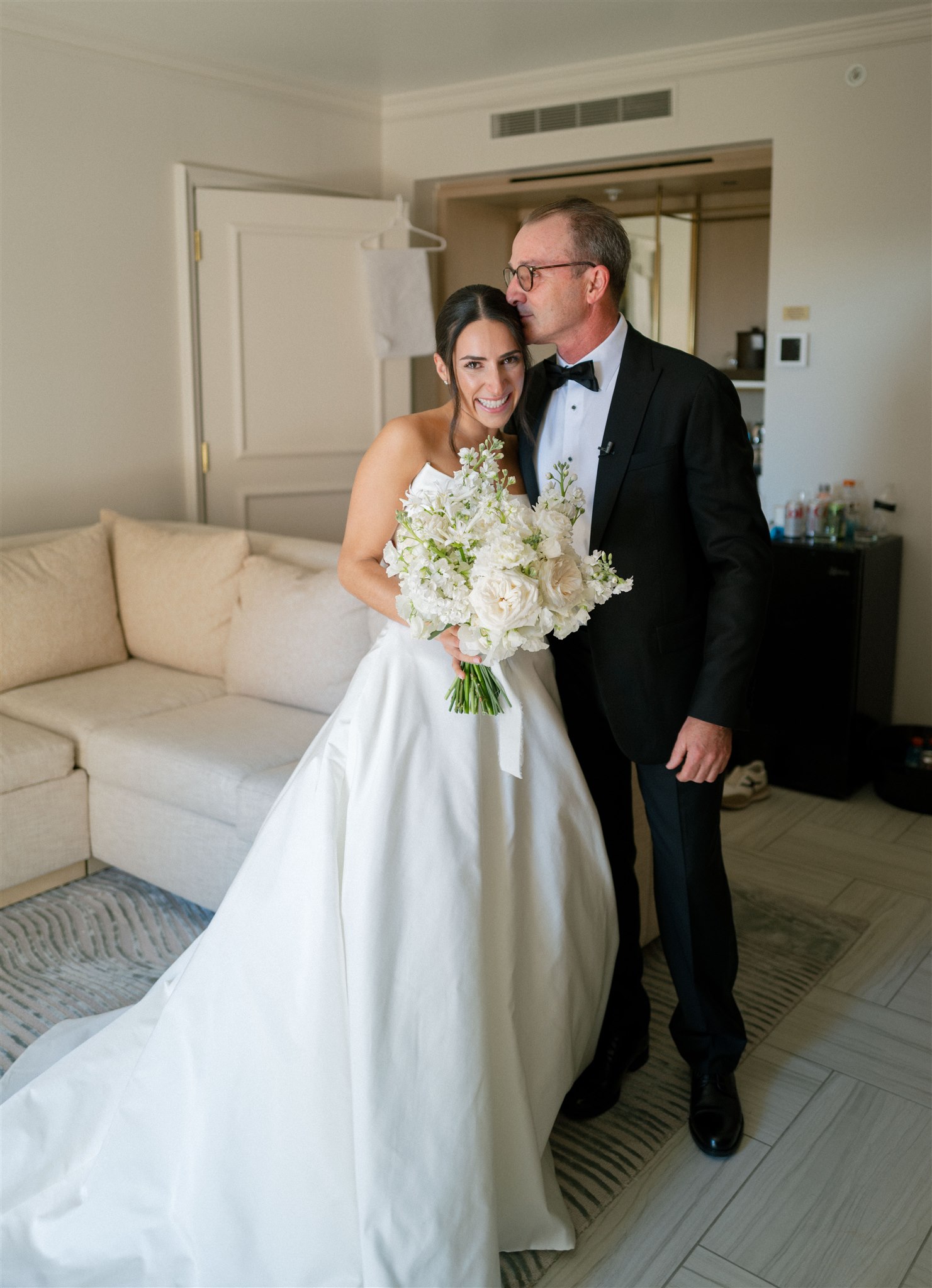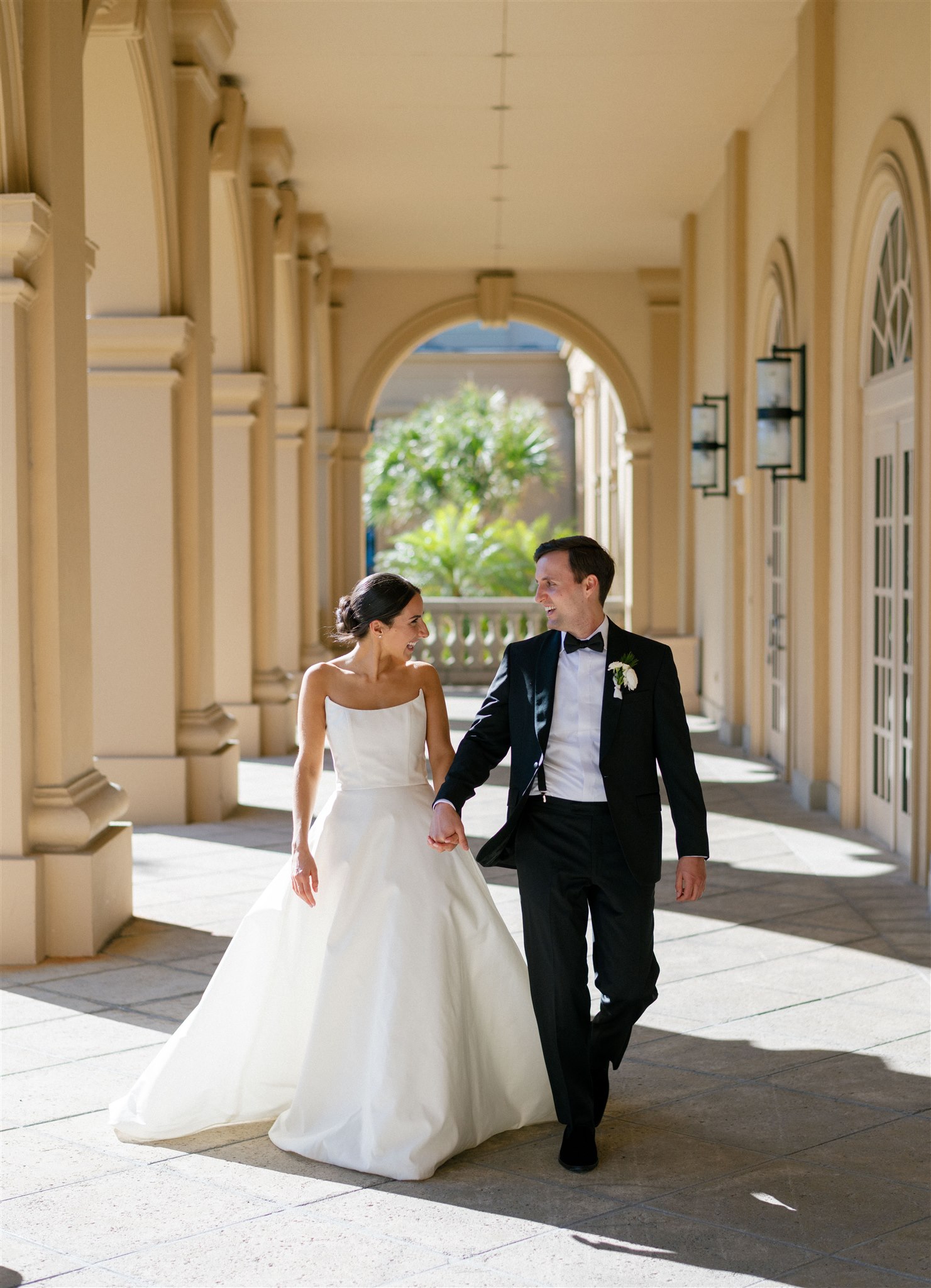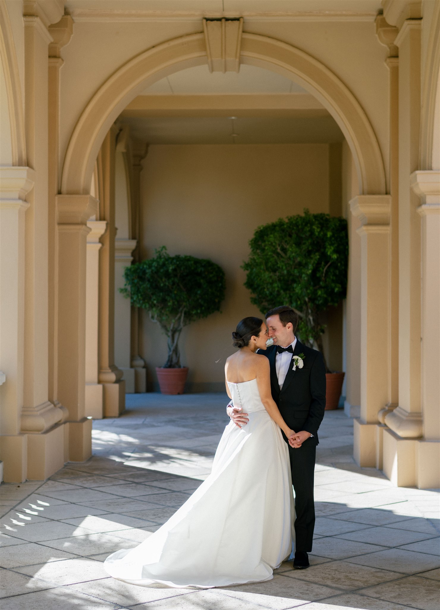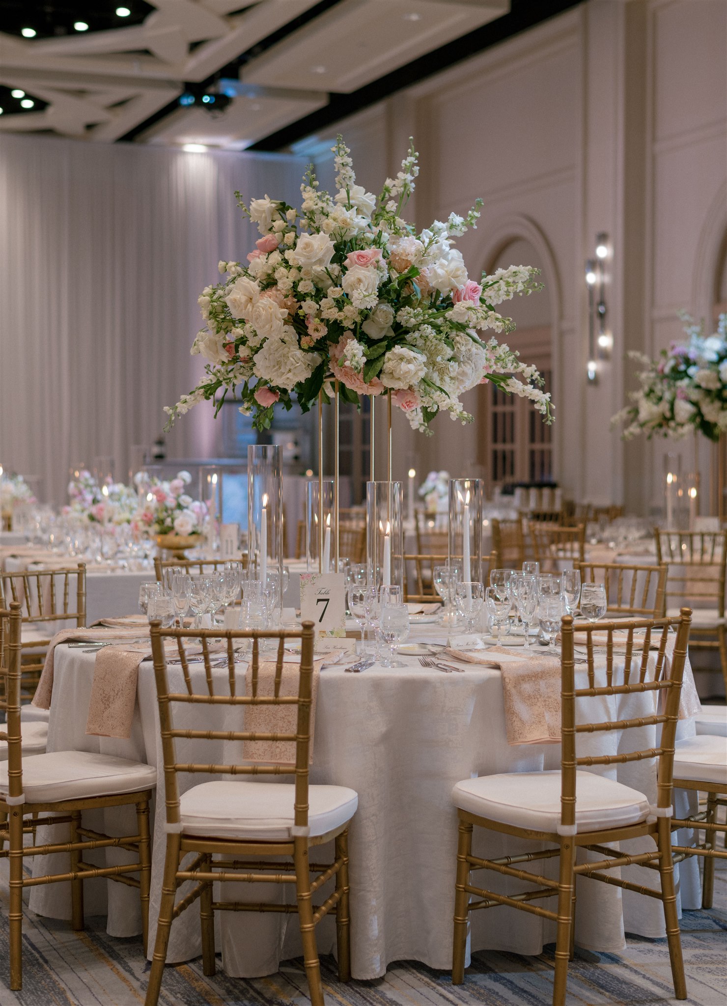 Alyssa and Brad’s Elegant Wedding at The Ritz-Carlton, Naples was a breathtaking celebration planned by Table 6 Productions. Alyssa stunned in a strapless gown with a removable wrap and gold Loeffler Randall ribbon shoes, with Duality styling her soft chignon and natural makeup. She carried a classic white bouquet by Kaleidoscope Florals, while Brad looked sharp in a black tuxedo. The couple shared a heartfelt first look before exchanging vows in the courtyard, where pastel florals lined the aisle and framed a romantic arch. Bridesmaids in shades of pink stood beside Alyssa, while the groomsmen wore classic black tuxedos.