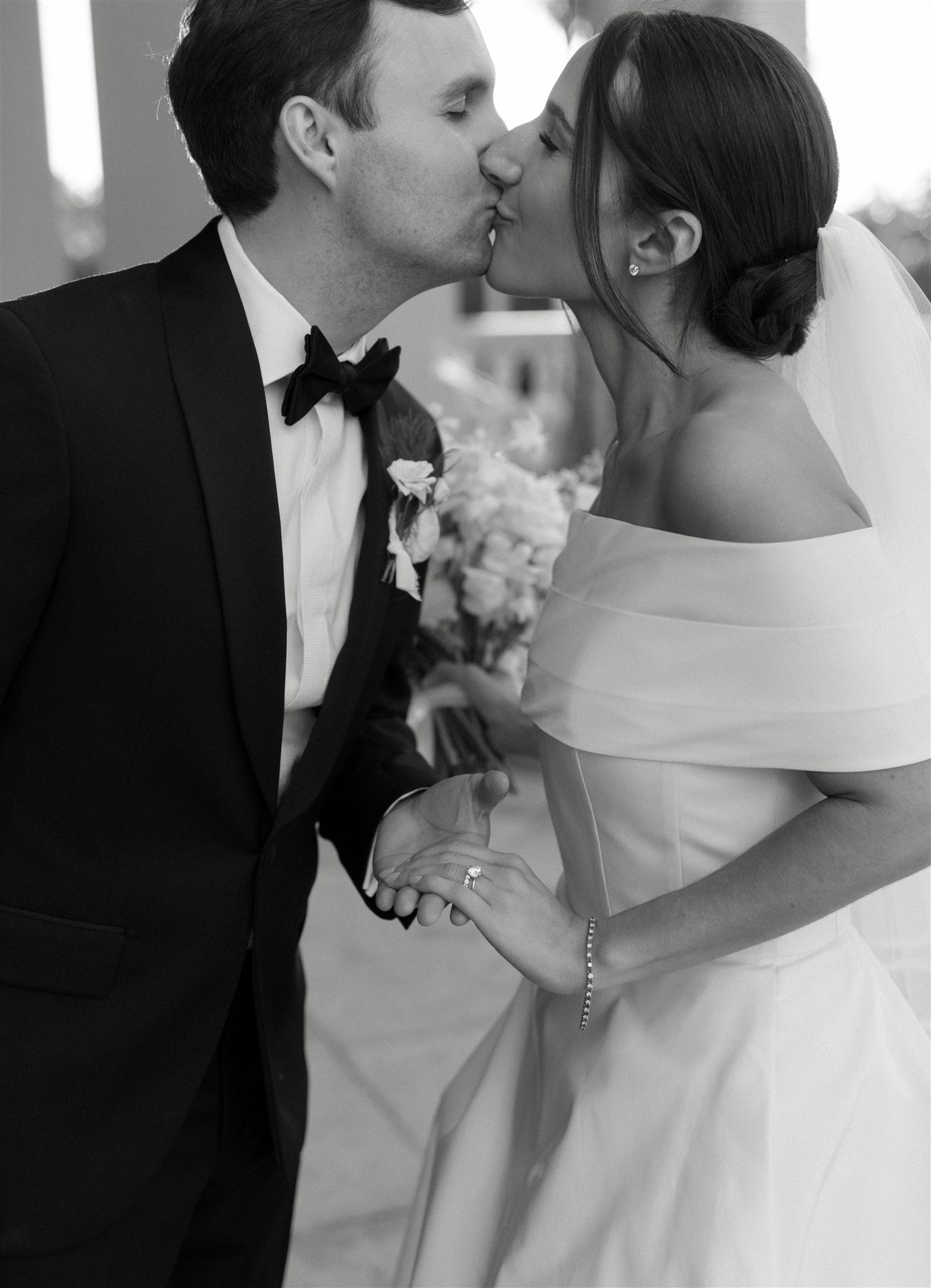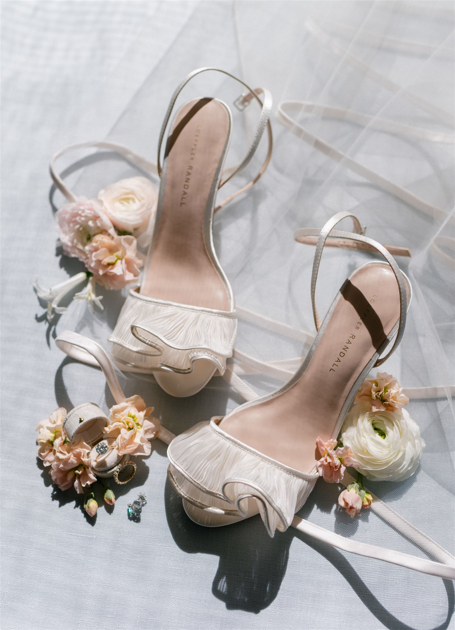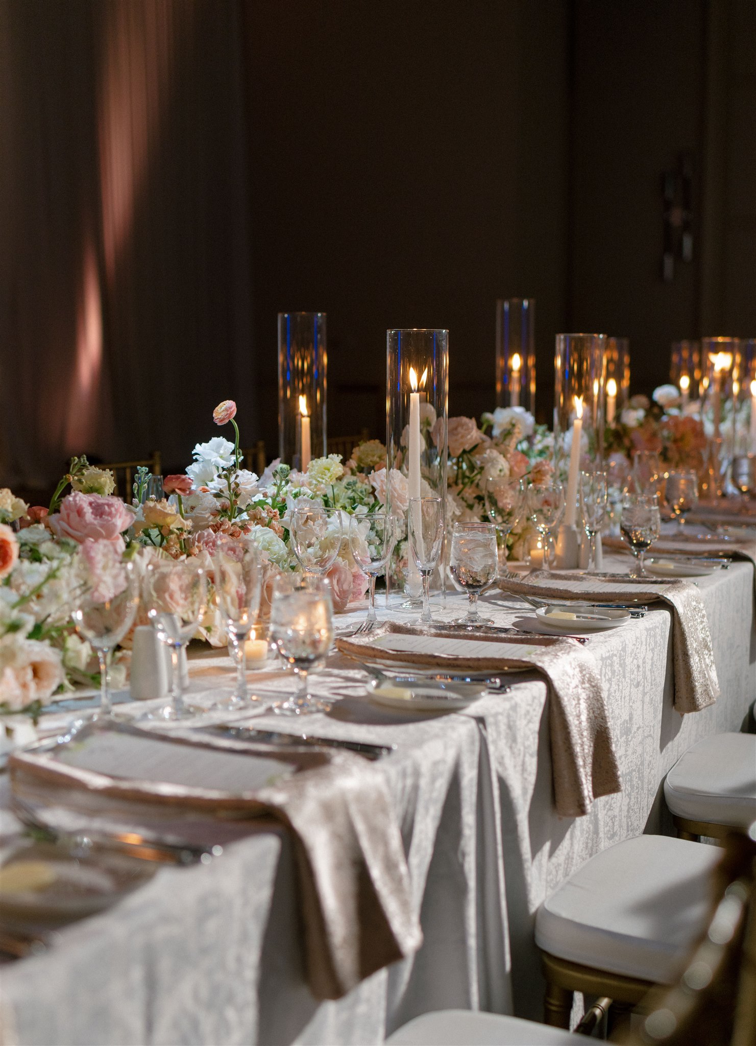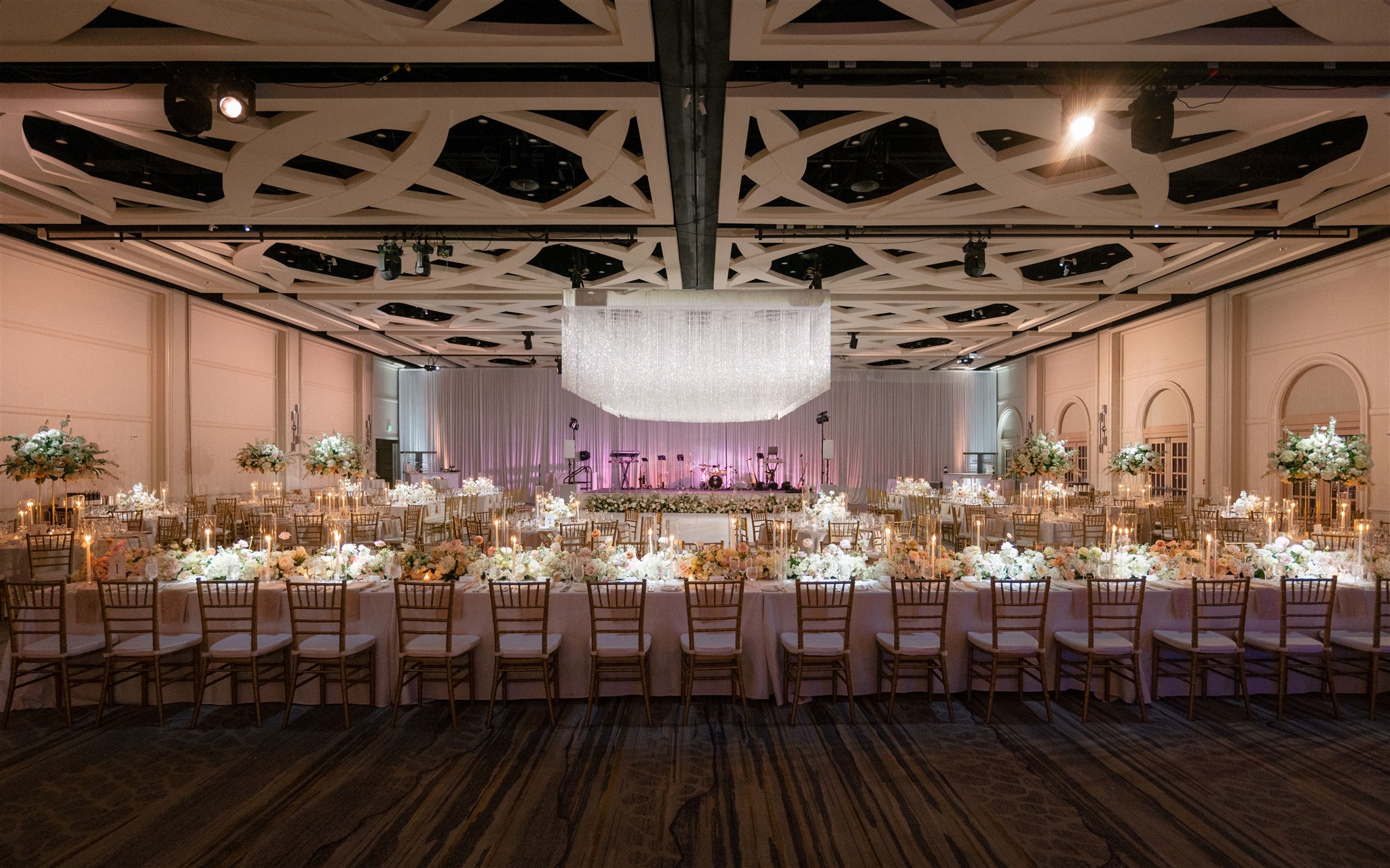 Alyssa and Brad’s Elegant Wedding at The Ritz-Carlton, Naples was a breathtaking celebration planned by Table 6 Productions. Alyssa stunned in a strapless gown with a removable wrap and gold Loeffler Randall ribbon shoes, with Duality styling her soft chignon and natural makeup. She carried a classic white bouquet by Kaleidoscope Florals, while Brad looked sharp in a black tuxedo. The couple shared a heartfelt first look before exchanging vows in the courtyard, where pastel florals lined the aisle and framed a romantic arch. Bridesmaids in shades of pink stood beside Alyssa, while the groomsmen wore classic black tuxedos.