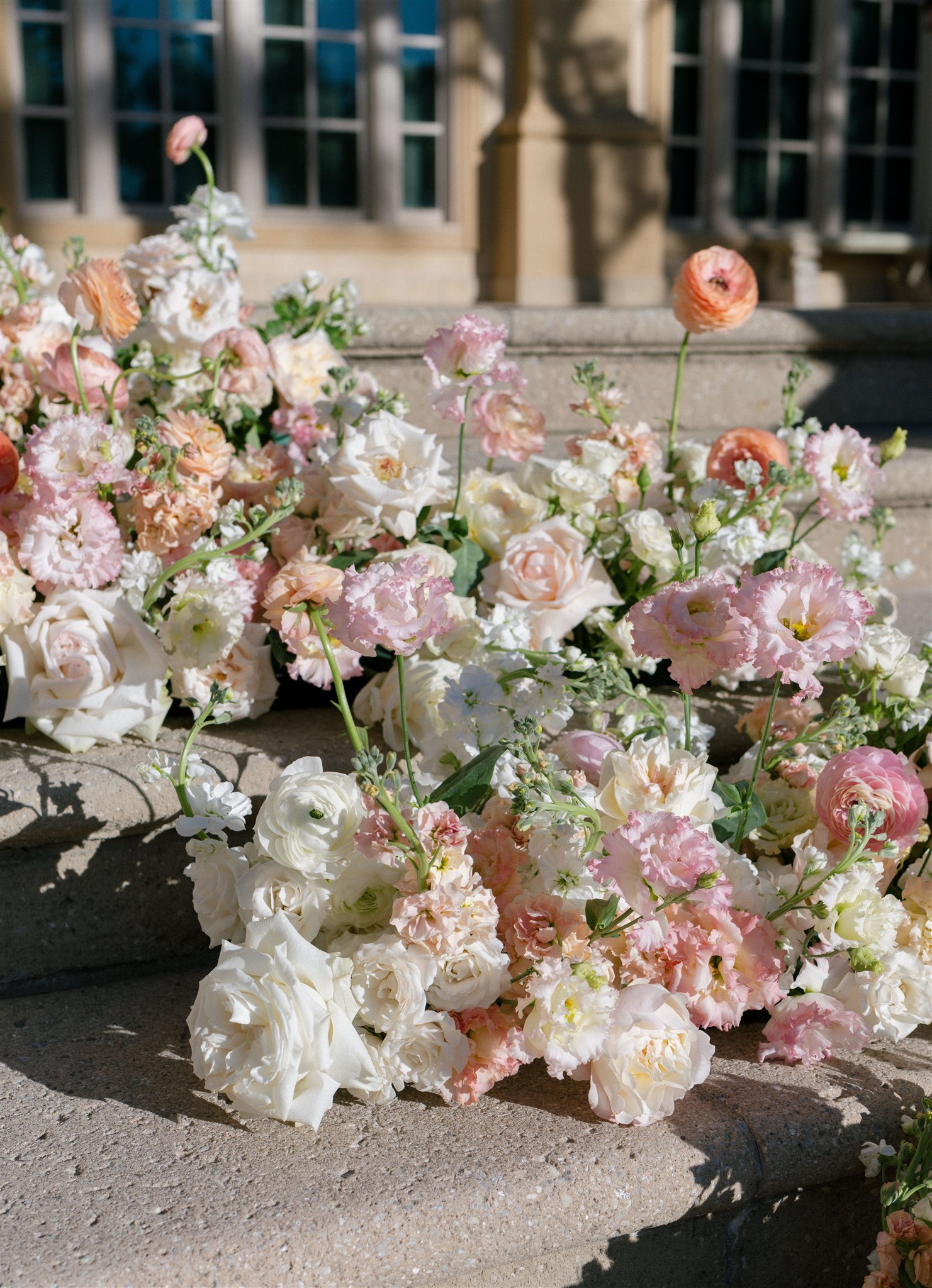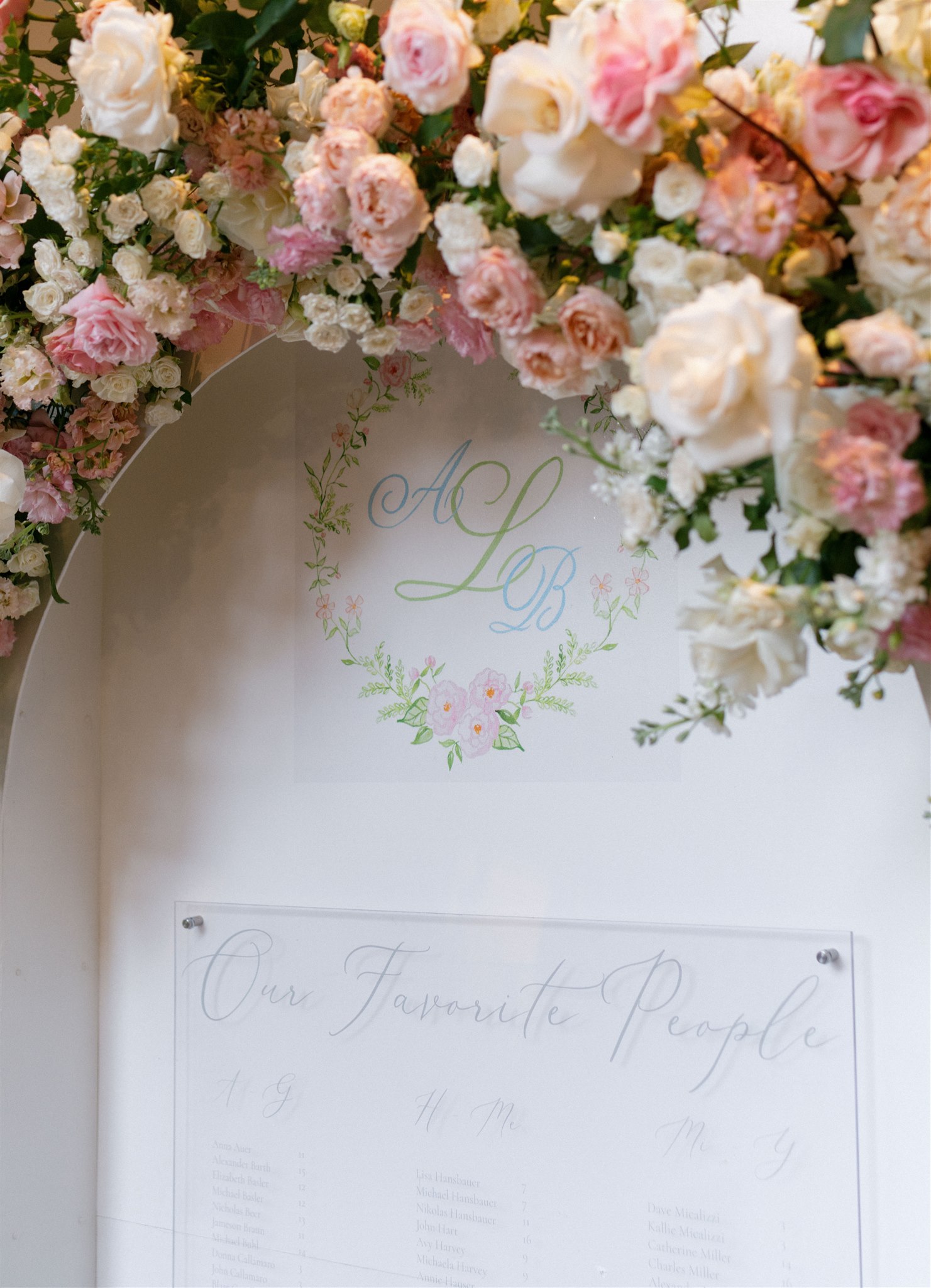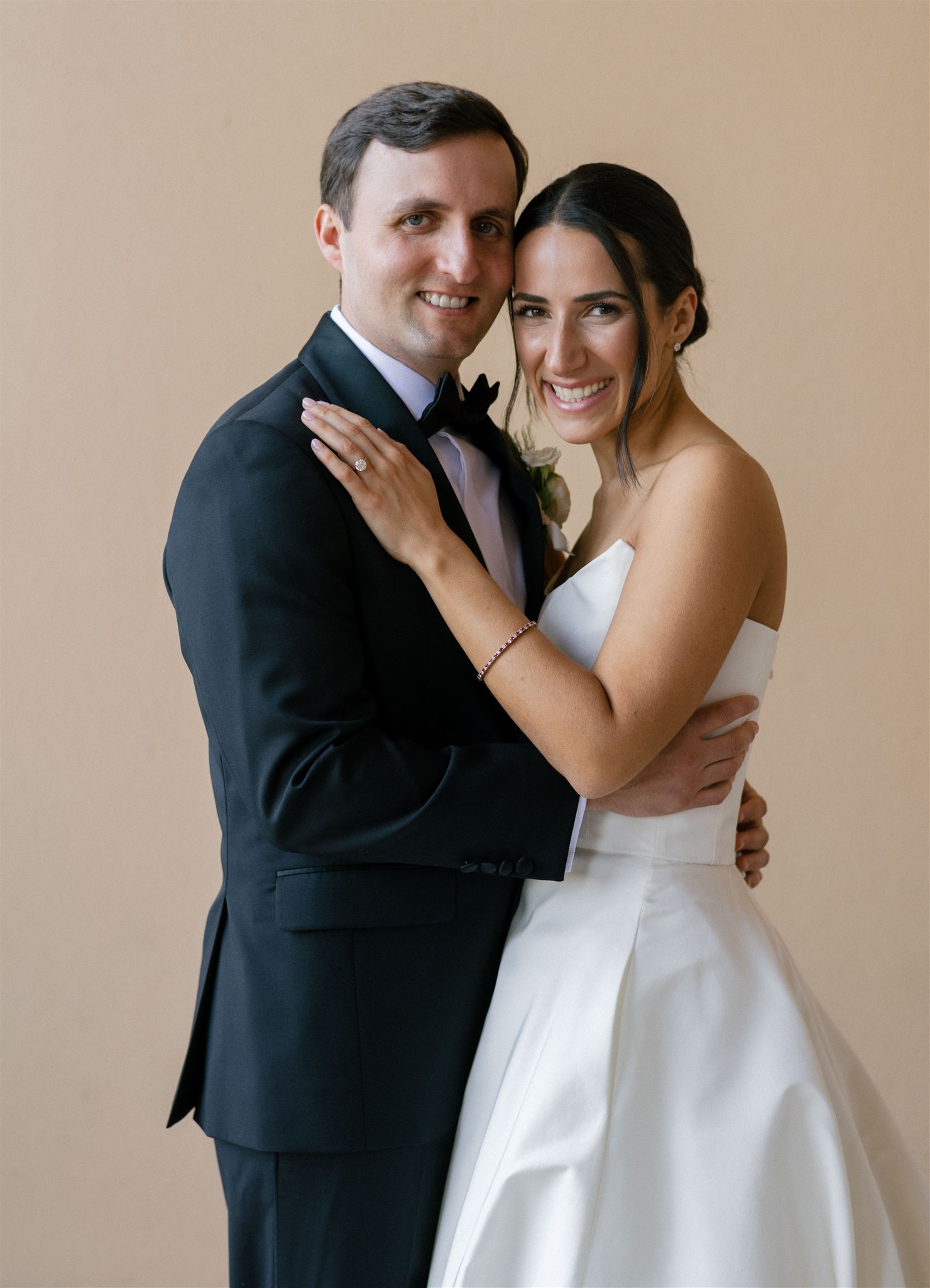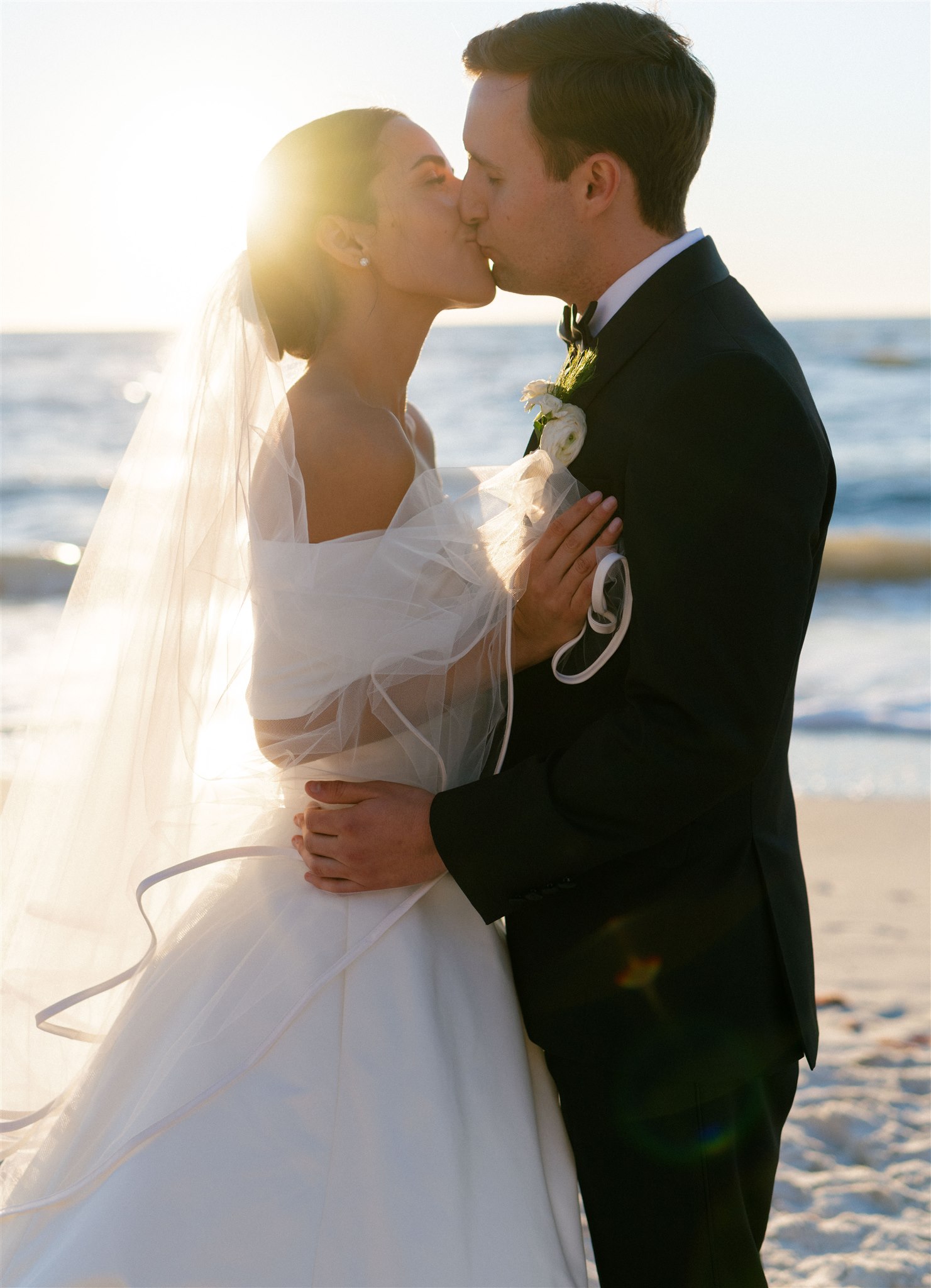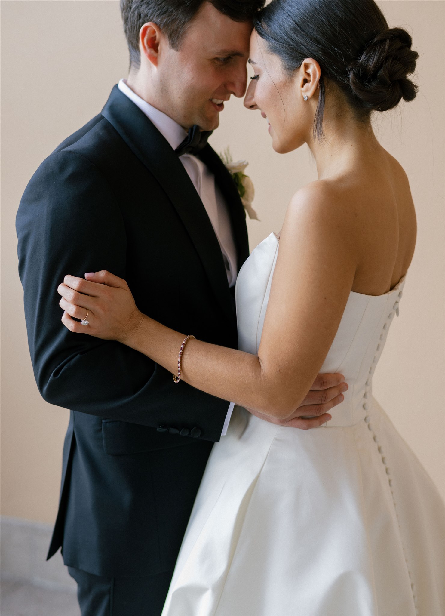 Alyssa and Brad’s Elegant Wedding at The Ritz-Carlton, Naples was a breathtaking celebration planned by Table 6 Productions. Alyssa stunned in a strapless gown with a removable wrap and gold Loeffler Randall ribbon shoes, with Duality styling her soft chignon and natural makeup. She carried a classic white bouquet by Kaleidoscope Florals, while Brad looked sharp in a black tuxedo. The couple shared a heartfelt first look before exchanging vows in the courtyard, where pastel florals lined the aisle and framed a romantic arch. Bridesmaids in shades of pink stood beside Alyssa, while the groomsmen wore classic black tuxedos.