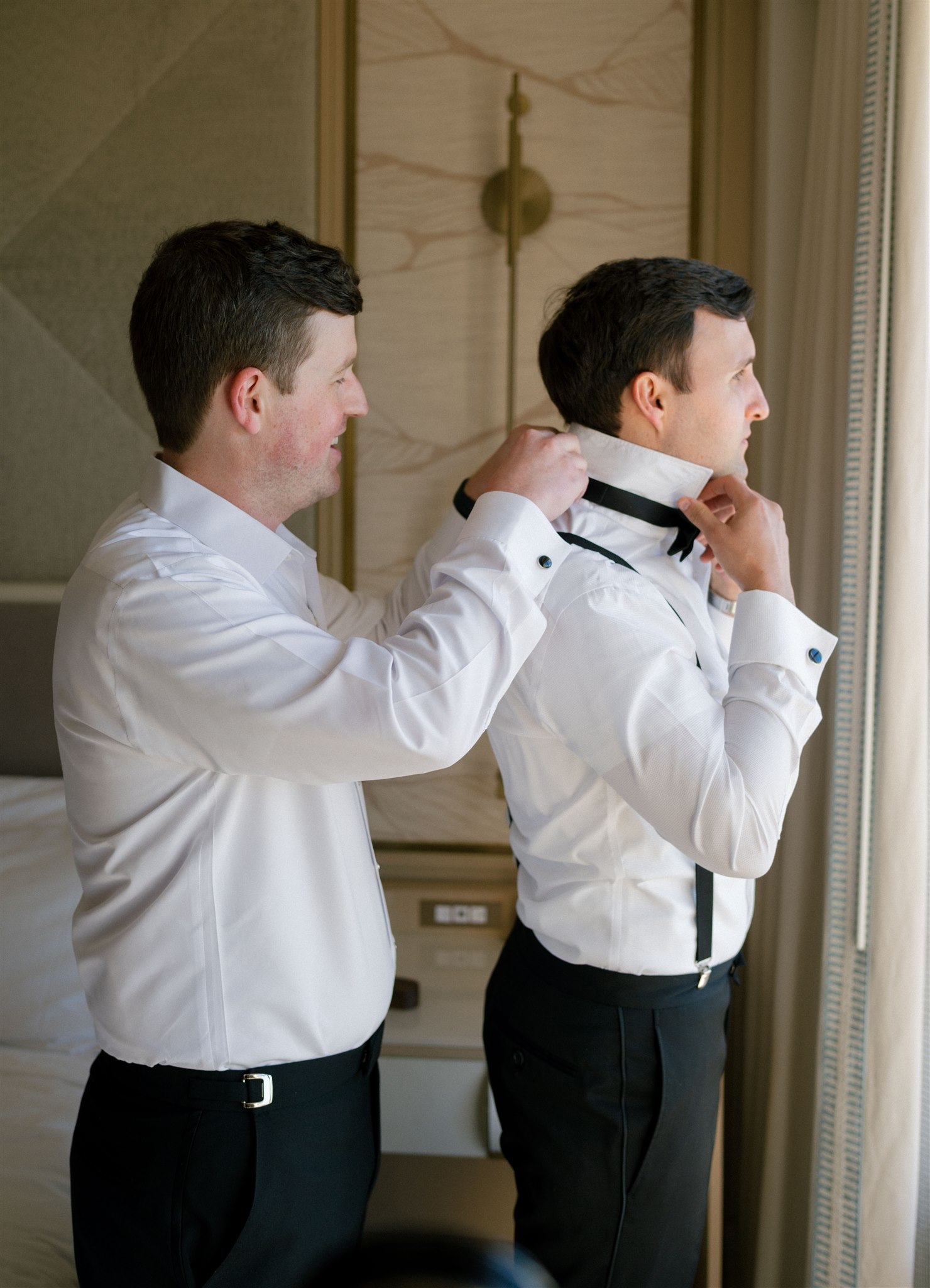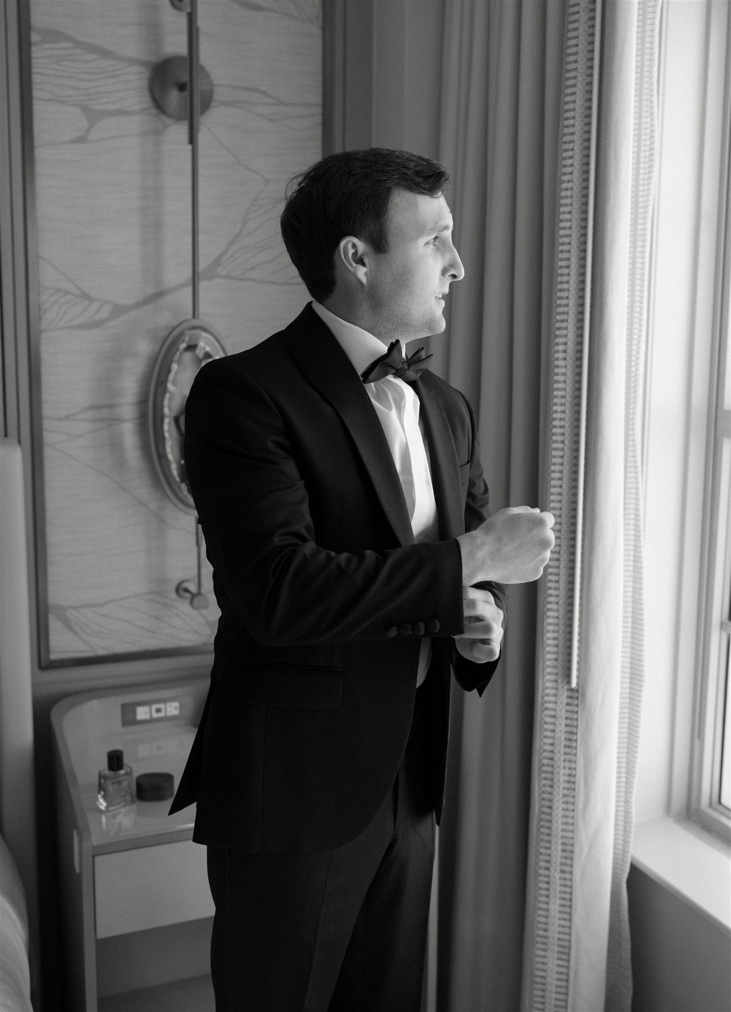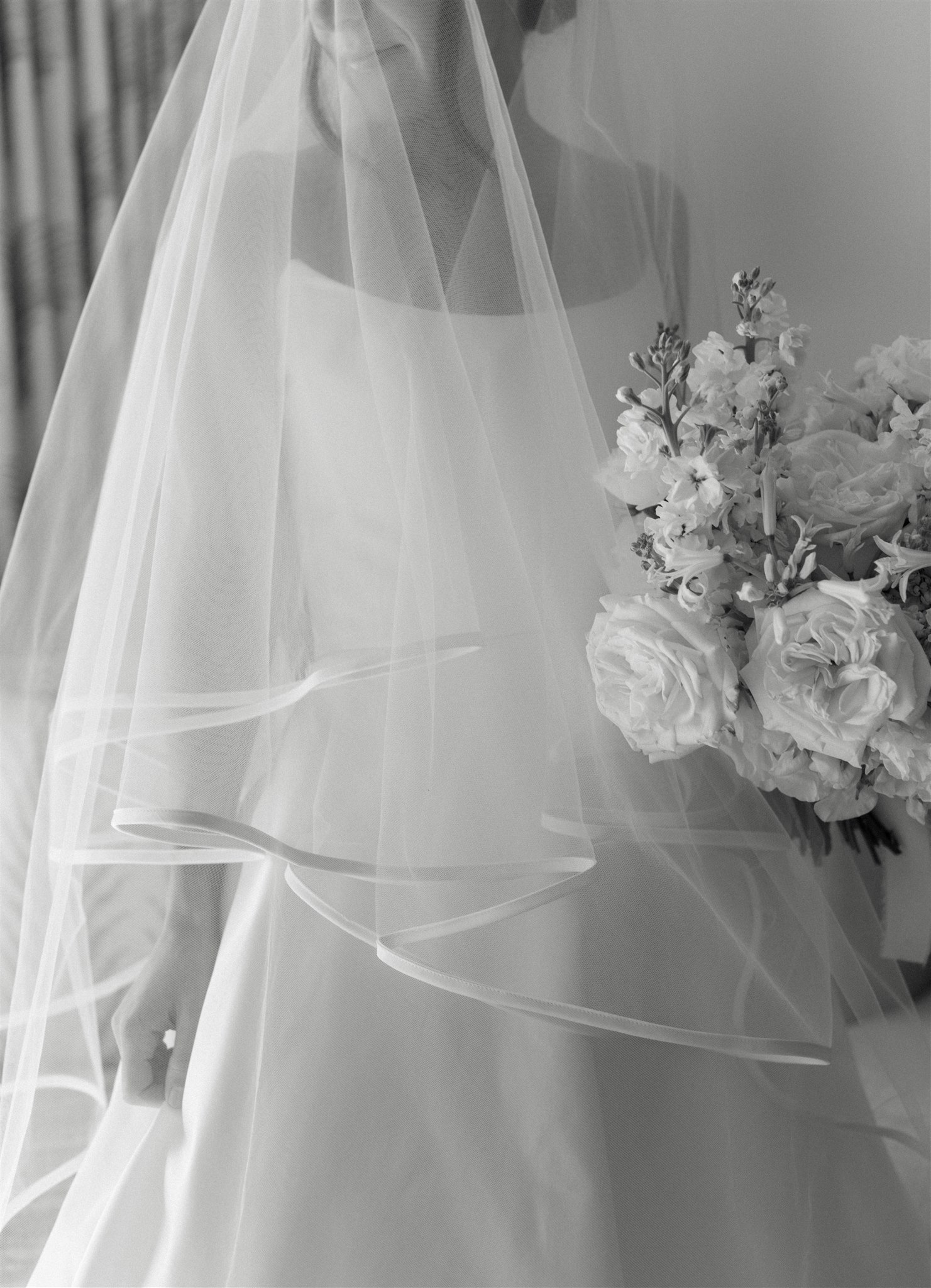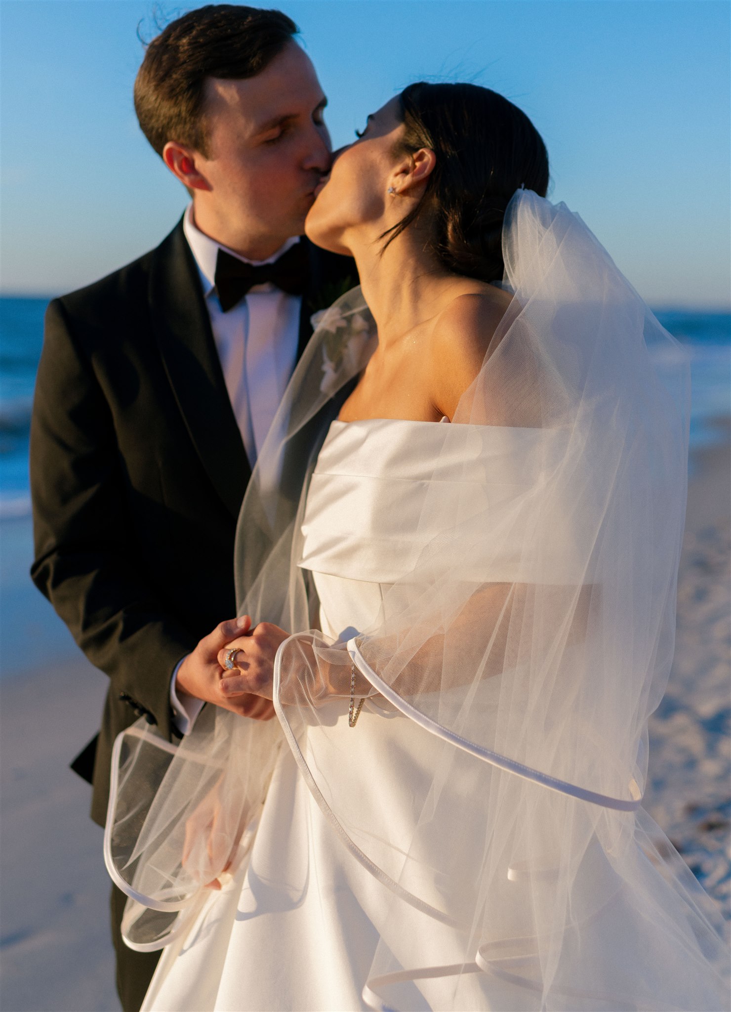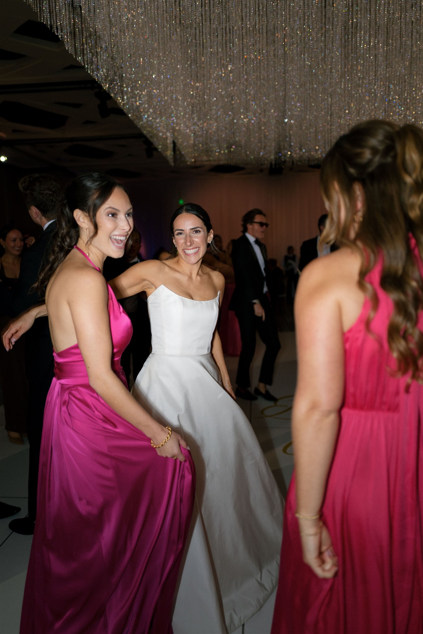 Alyssa and Brad’s Elegant Wedding at The Ritz-Carlton, Naples was a breathtaking celebration planned by Table 6 Productions. Alyssa stunned in a strapless gown with a removable wrap and gold Loeffler Randall ribbon shoes, with Duality styling her soft chignon and natural makeup. She carried a classic white bouquet by Kaleidoscope Florals, while Brad looked sharp in a black tuxedo. The couple shared a heartfelt first look before exchanging vows in the courtyard, where pastel florals lined the aisle and framed a romantic arch. Bridesmaids in shades of pink stood beside Alyssa, while the groomsmen wore classic black tuxedos.