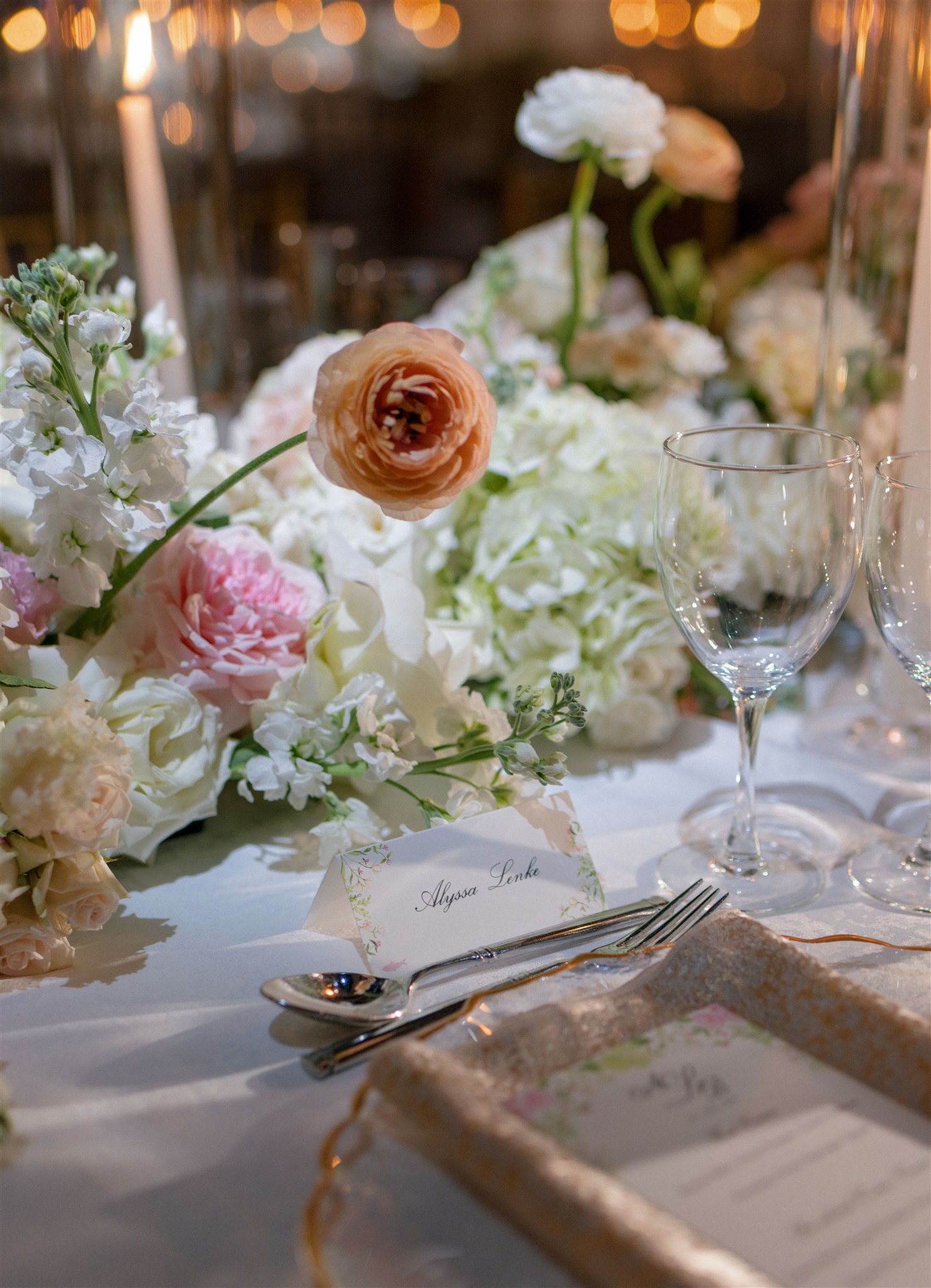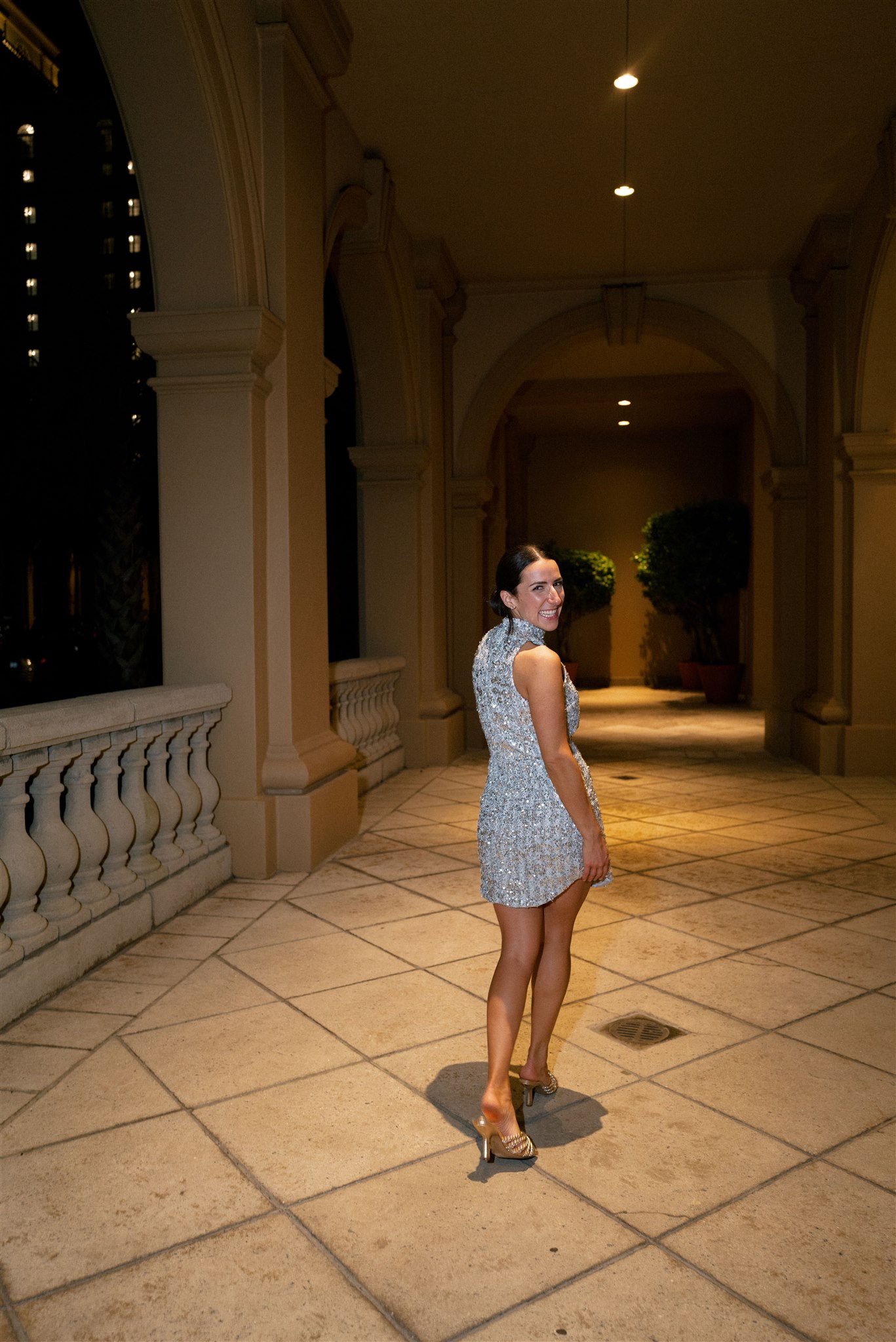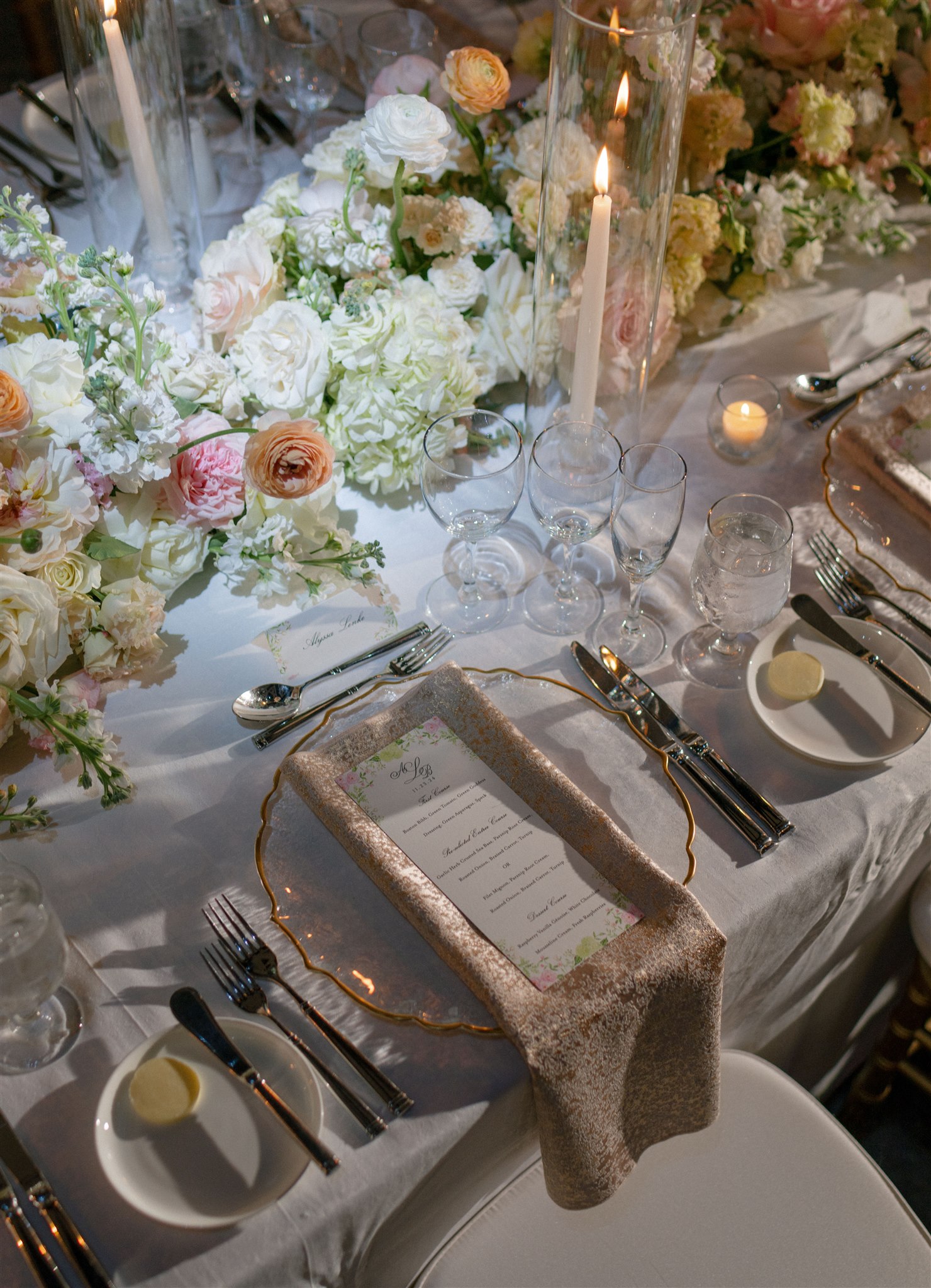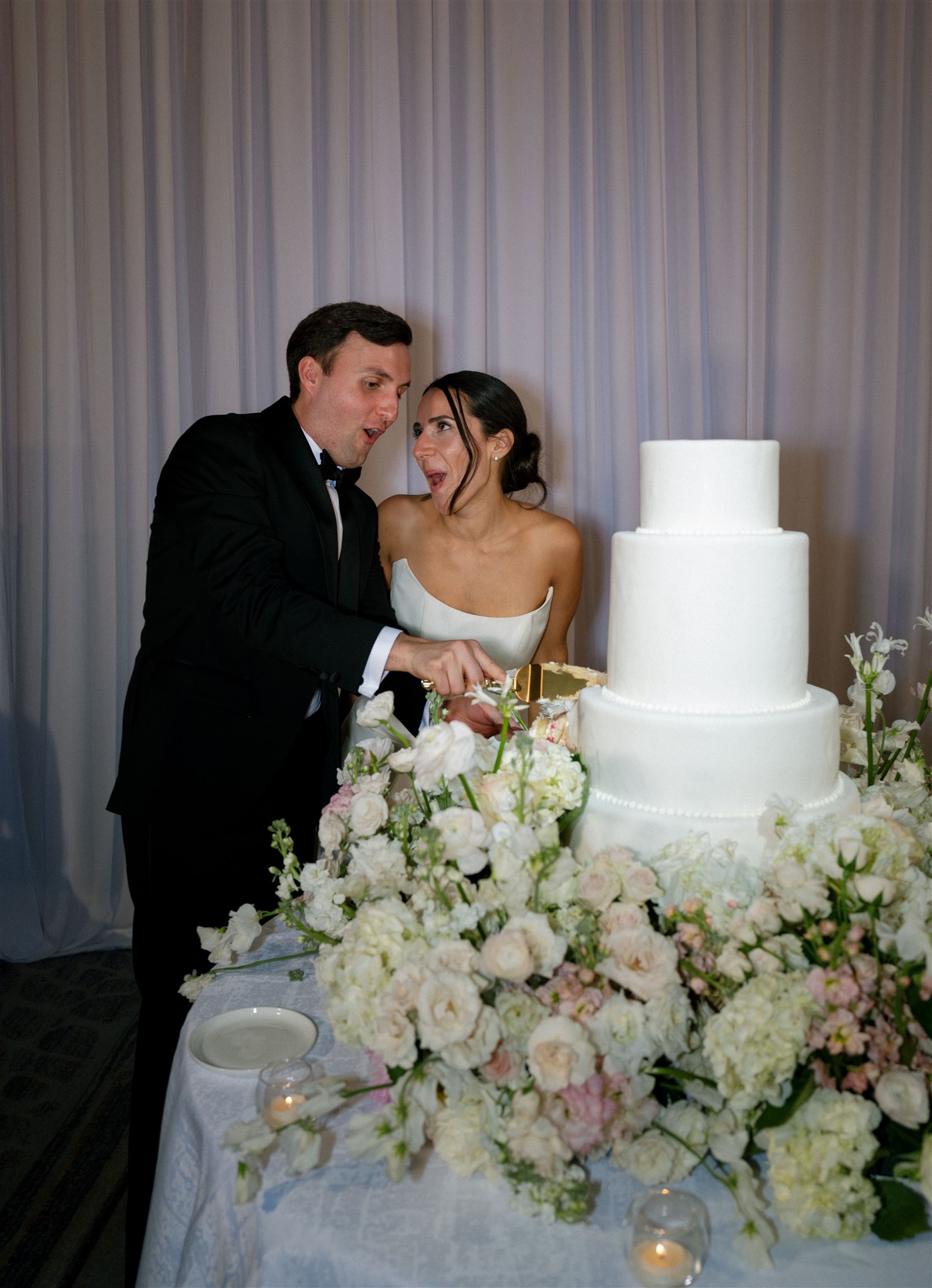 The reception featured elegant white tablescapes with pastel florals, gold-accented place settings, and soft candlelight. Beneath a glittering chandelier, Alyssa and Brad shared their first dance to Libido Band before cutting into their four-tier floral-adorned cake. Later, Alyssa changed into a sparkly short dress to celebrate with family and friends. Every unforgettable moment was beautifully captured by Voila Cinematic—a stunning Ritz-Carlton, Naples wedding!